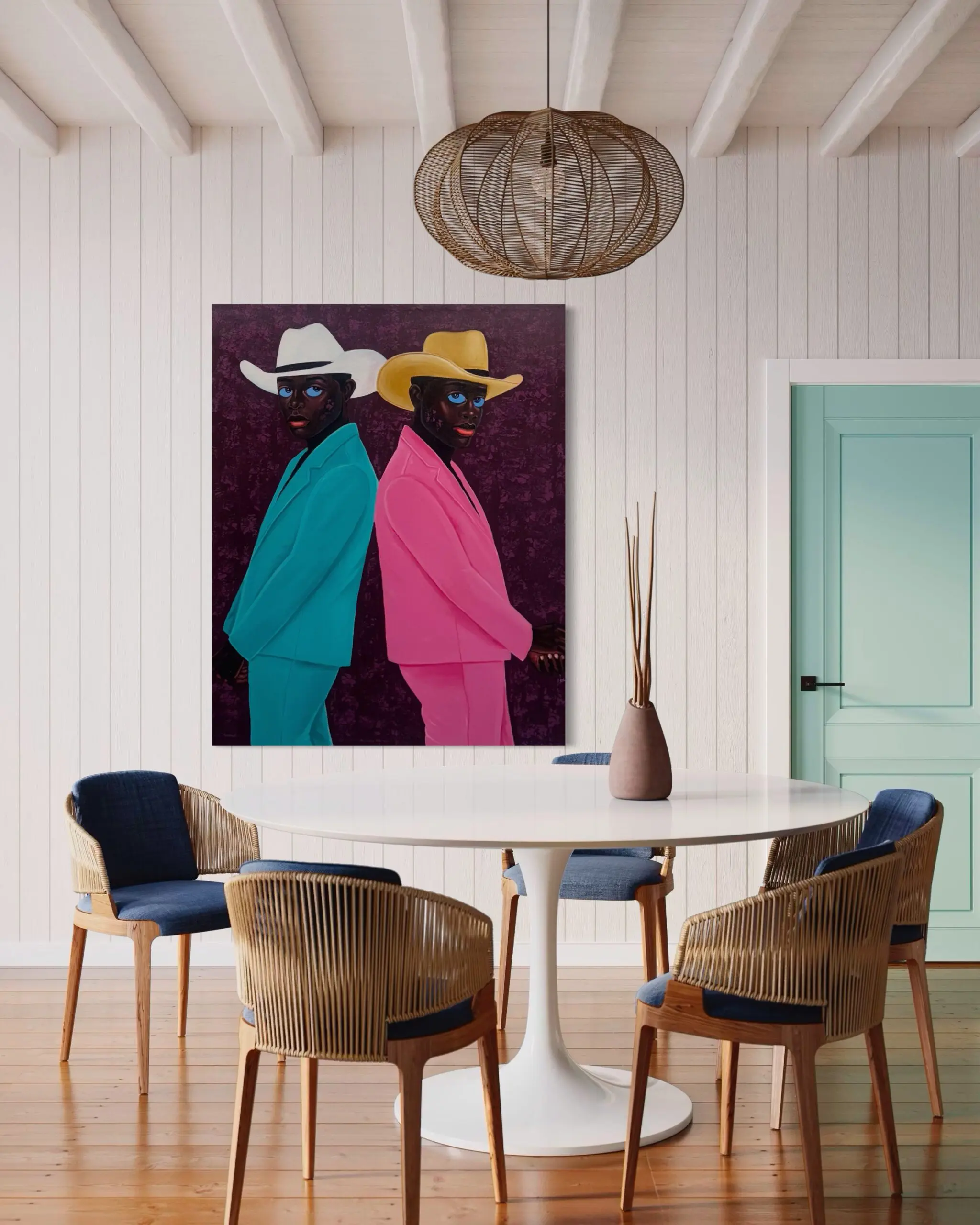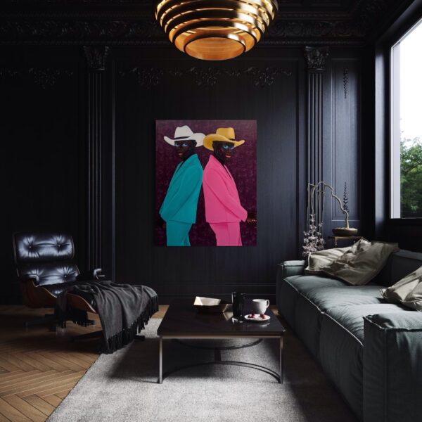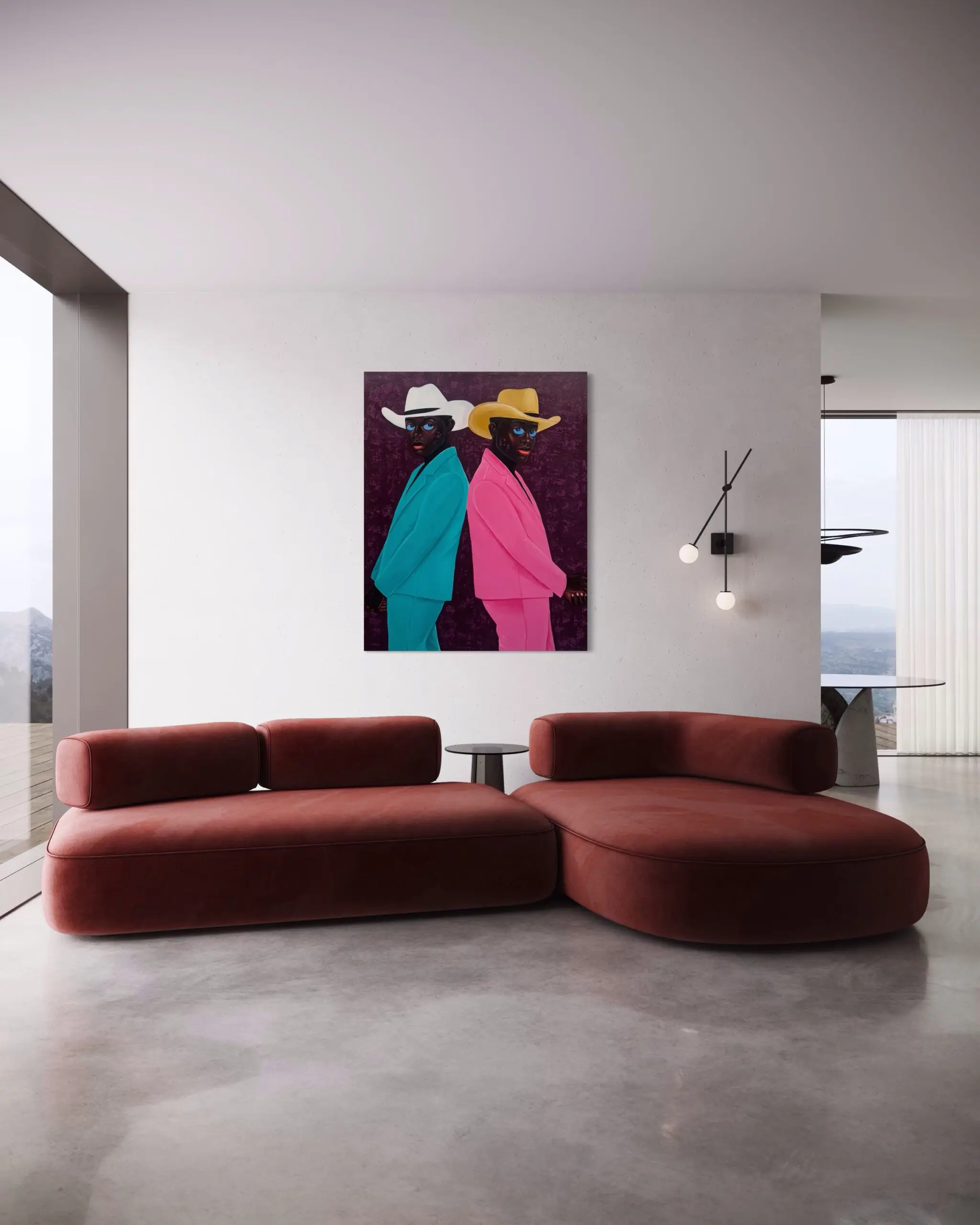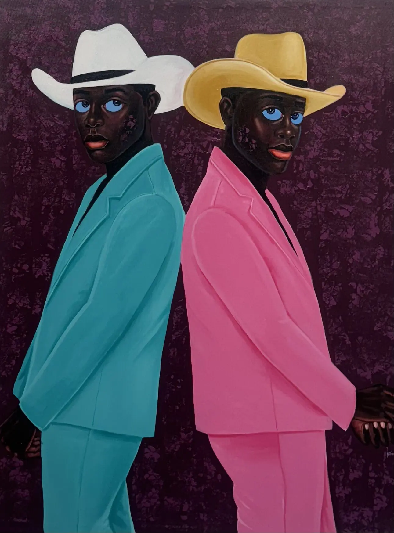 Two men stand back-to-back, their mirrored poses creating both tension and harmony. One is dressed in a vibrant turquoise suit paired with a crisp white cowboy hat, while the other wears a bold pink suit topped with a golden hat. Their piercing blue eyes — a defining signature of Philip Letsu’s paintings — anchor the composition, engaging the viewer with a gaze that feels both direct and enigmatic. The deep plum background, richly textured, heightens the contrast of their colorful attire and frames the figures in a dramatic, timeless stage.