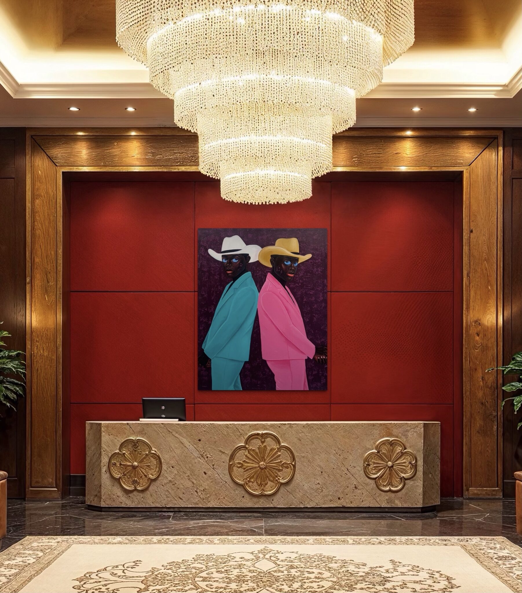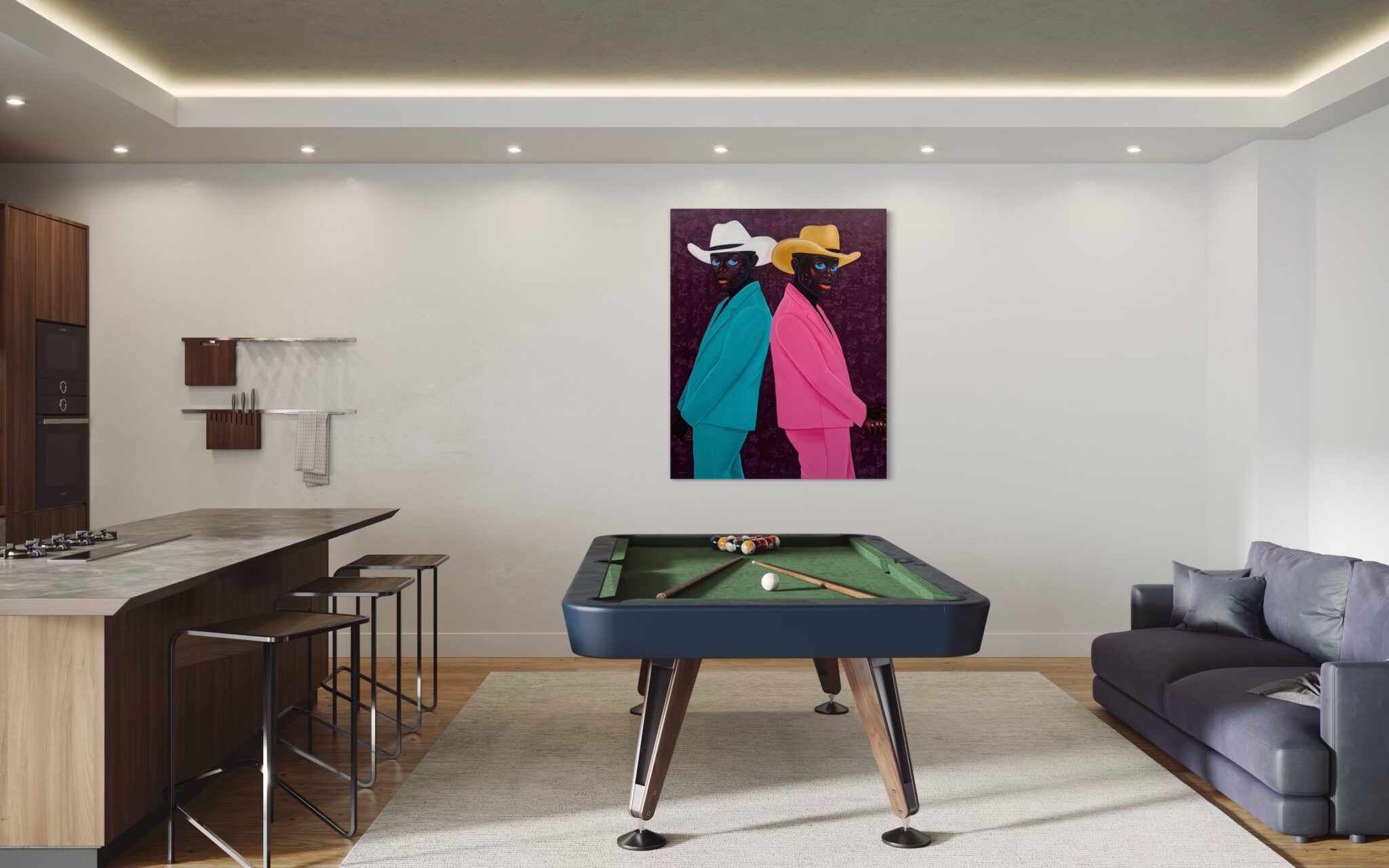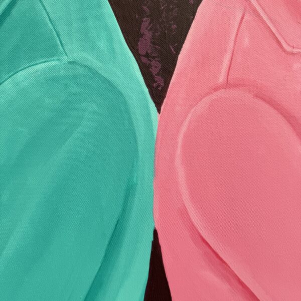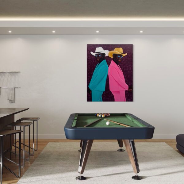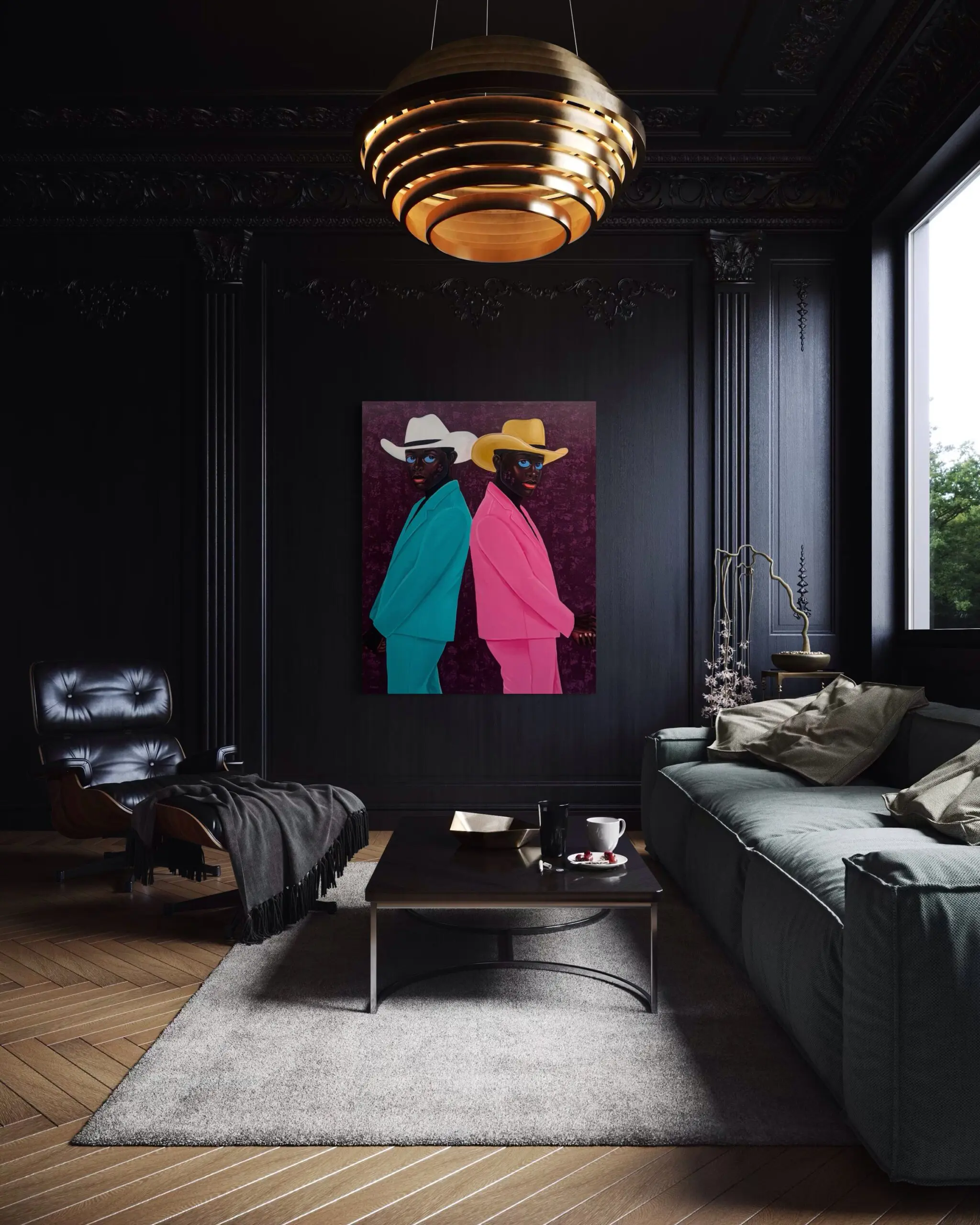 Two men stand back-to-back, their mirrored poses creating both tension and harmony. One is dressed in a vibrant turquoise suit paired with a crisp white cowboy hat, while the other wears a bold pink suit topped with a golden hat. Their piercing blue eyes — a defining signature of Philip Letsu’s paintings — anchor the composition, engaging the viewer with a gaze that feels both direct and enigmatic. The deep plum background, richly textured, heightens the contrast of their colorful attire and frames the figures in a dramatic, timeless stage.
