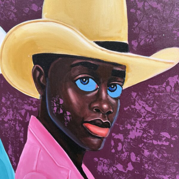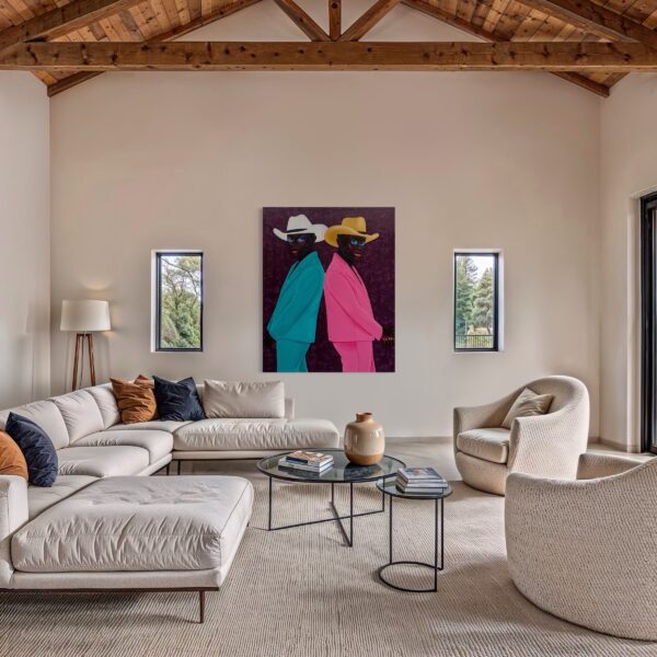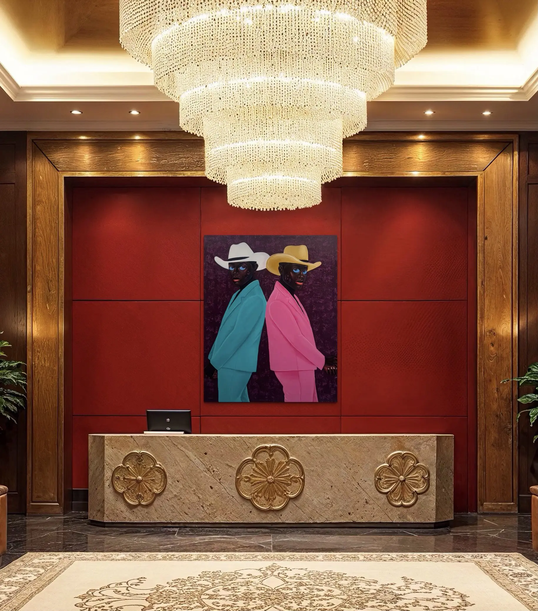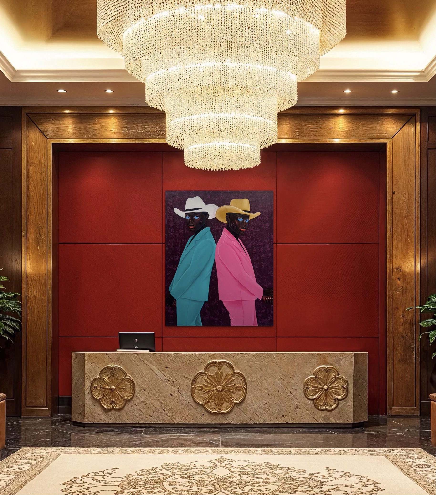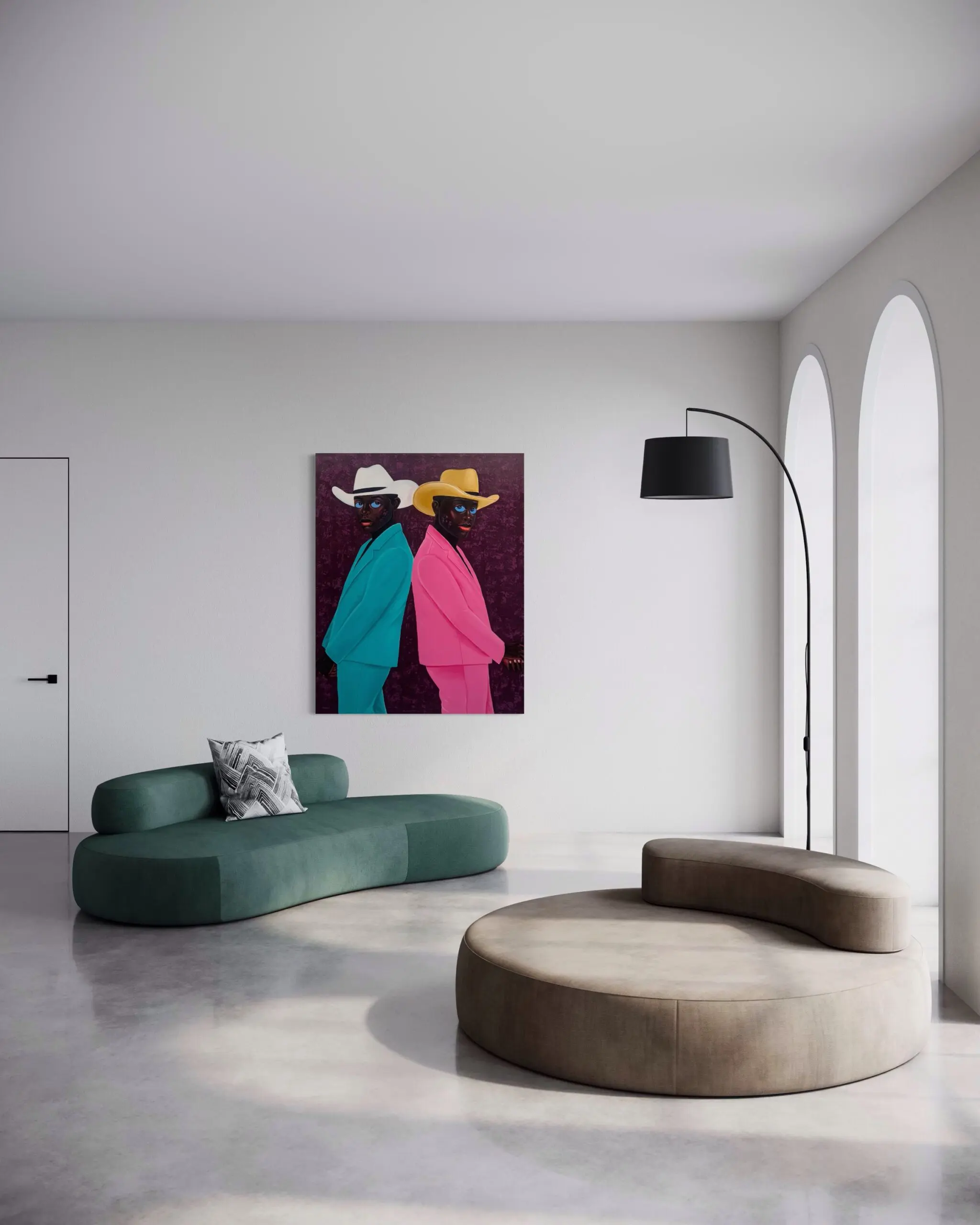 This portrait exemplifies Letsu’s ability to merge symbolism, style, and presence into a compelling narrative. The cowboy hats, often associated with rugged independence and Western identity, take on new meaning in his hands — transformed into symbols of individuality, duality, and cultural reinterpretation. By combining traditional portraiture with bold modern aesthetics, Letsu highlights both uniqueness and kinship, challenging viewers to reconsider the stories we attach to clothing, color, and posture.