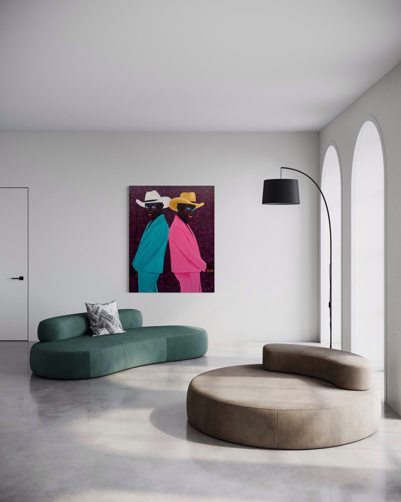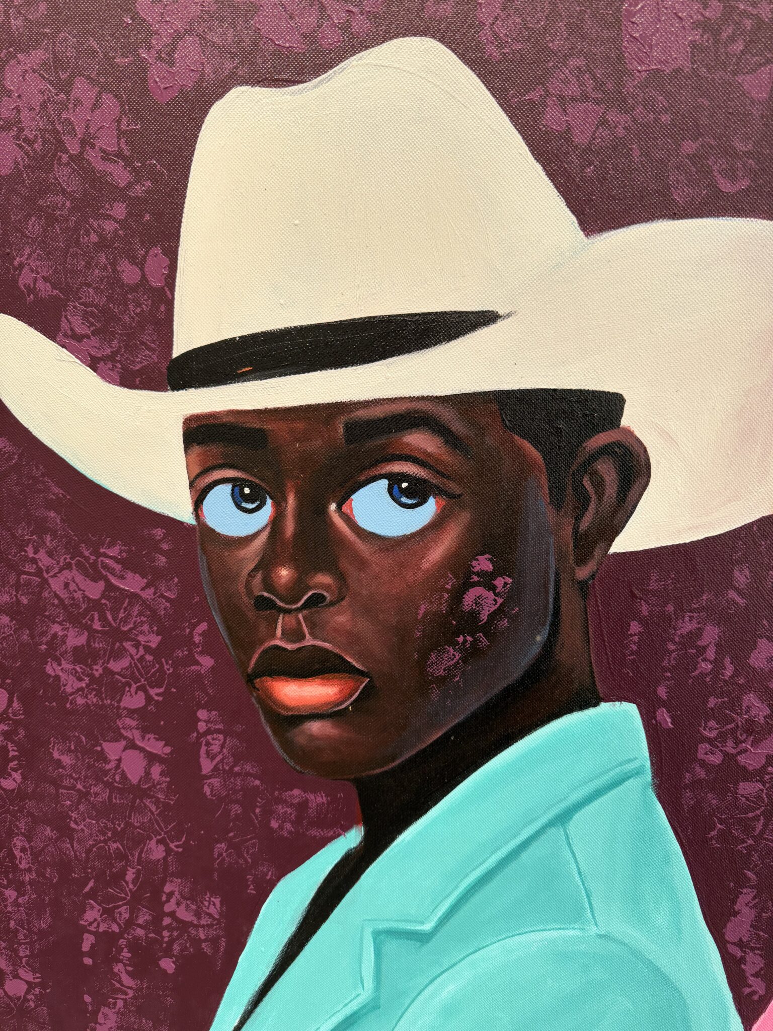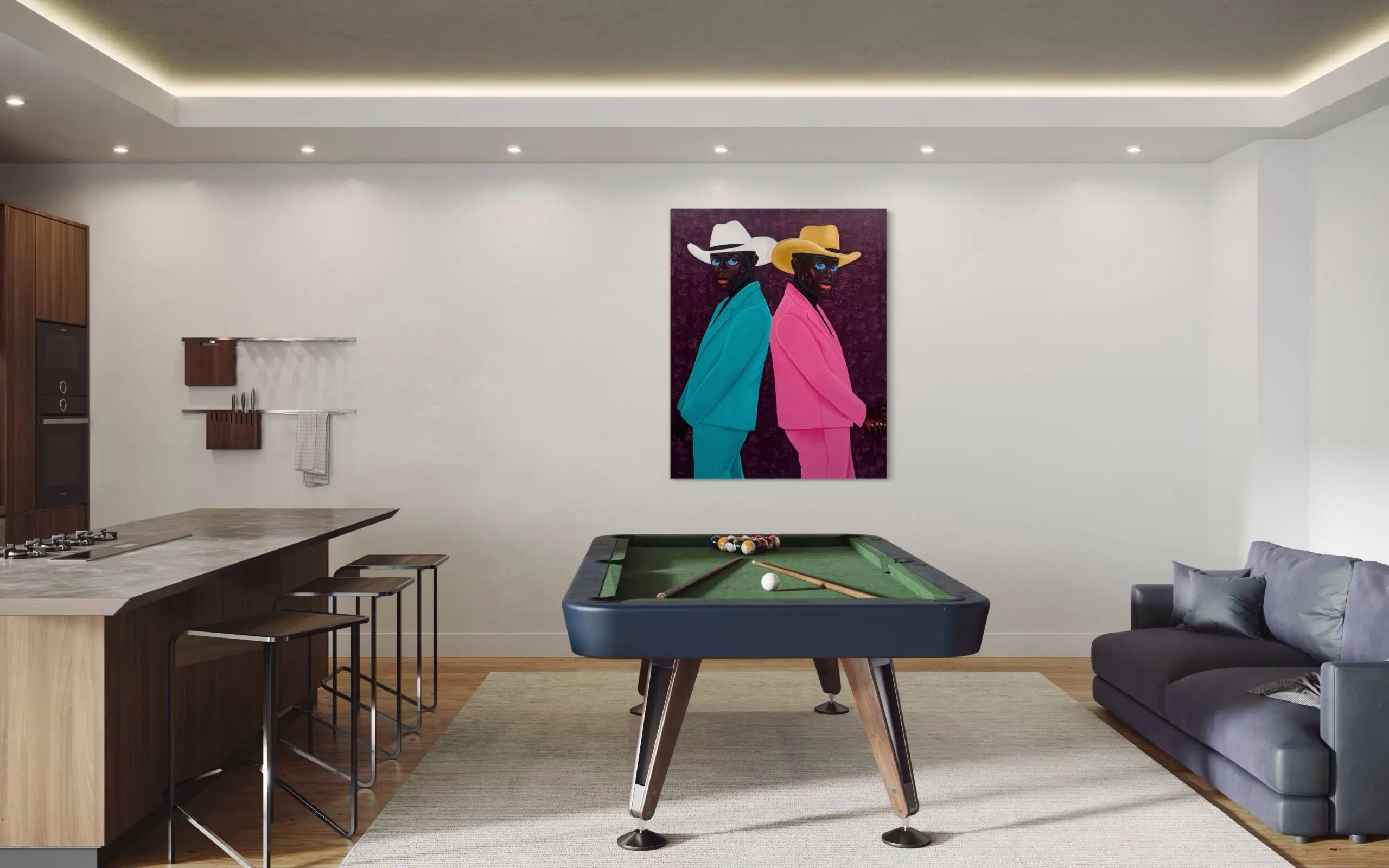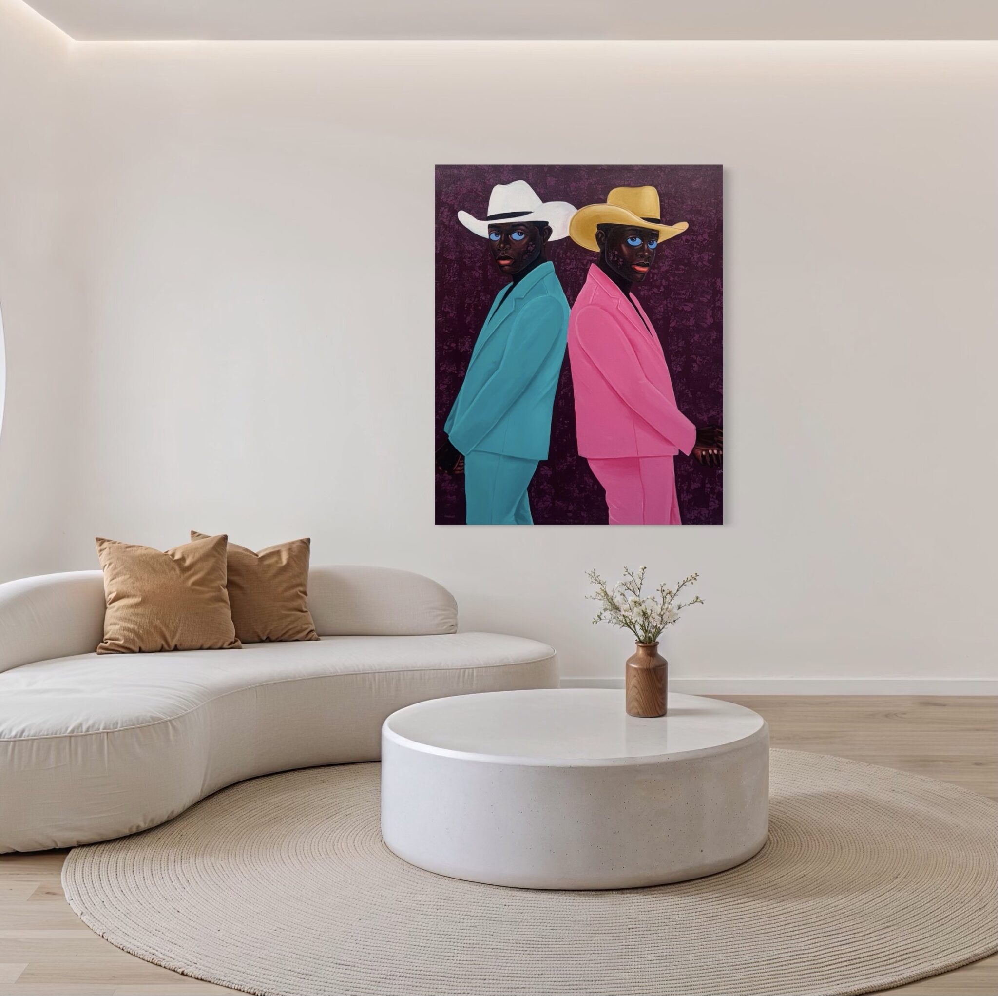 This portrait exemplifies Letsu’s ability to merge symbolism, style, and presence into a compelling narrative. The cowboy hats, often associated with rugged independence and Western identity, take on new meaning in his hands — transformed into symbols of individuality, duality, and cultural reinterpretation. By combining traditional portraiture with bold modern aesthetics, Letsu highlights both uniqueness and kinship, challenging viewers to reconsider the stories we attach to clothing, color, and posture.