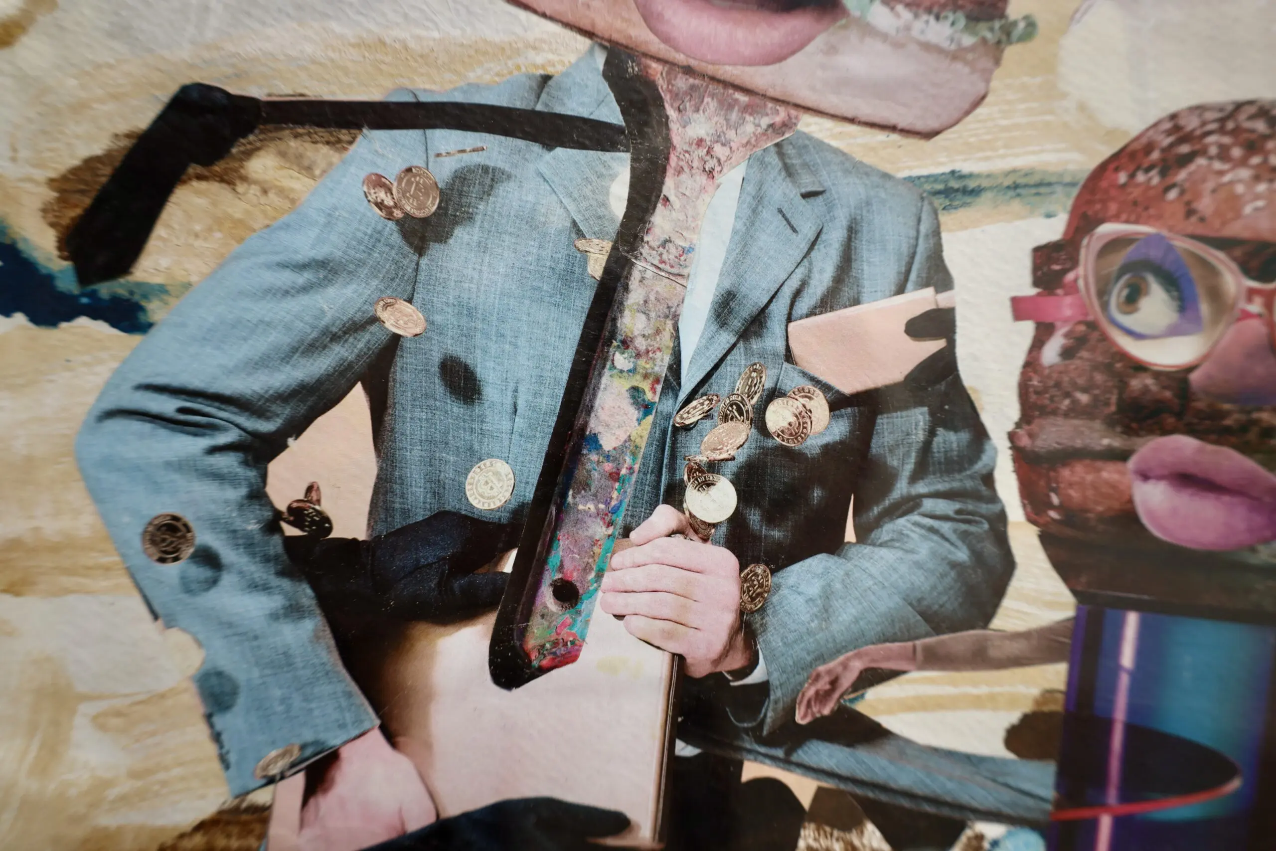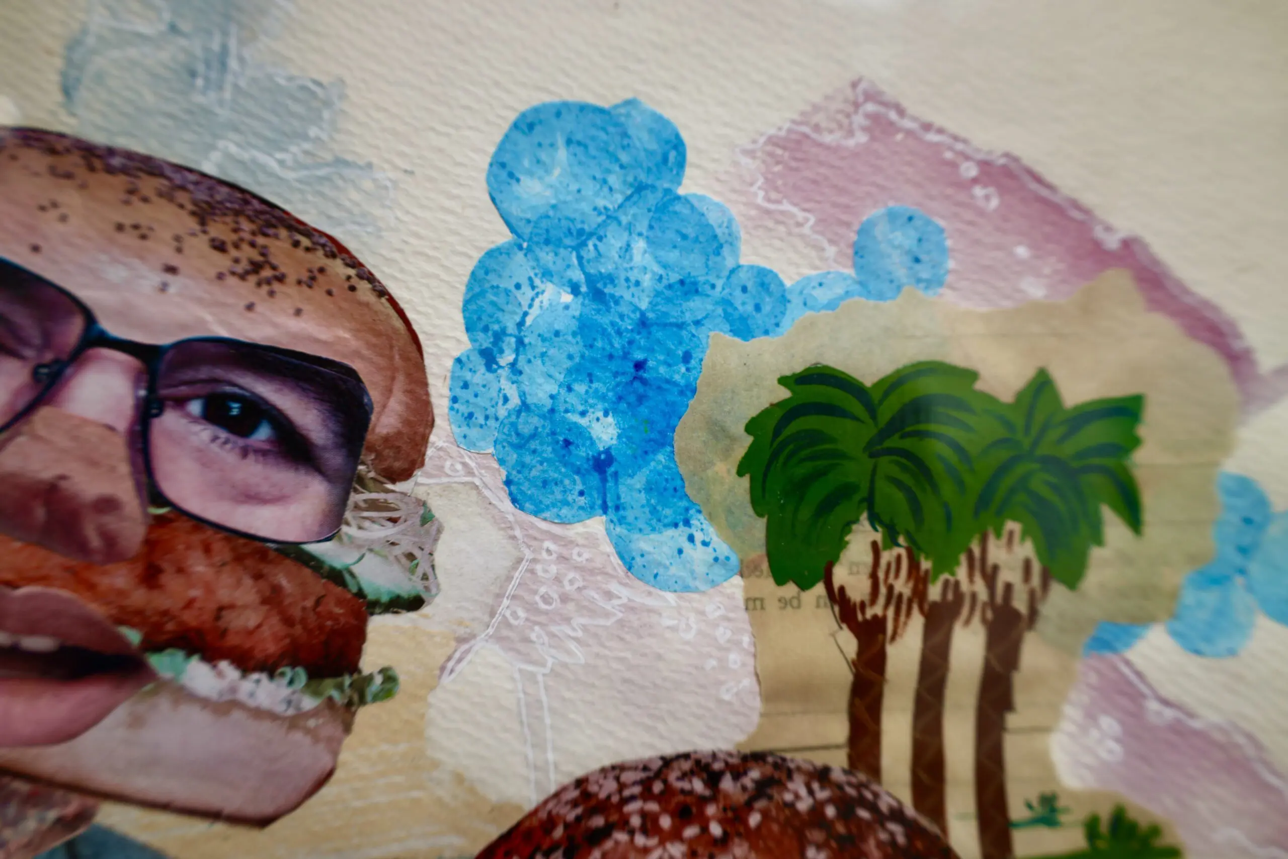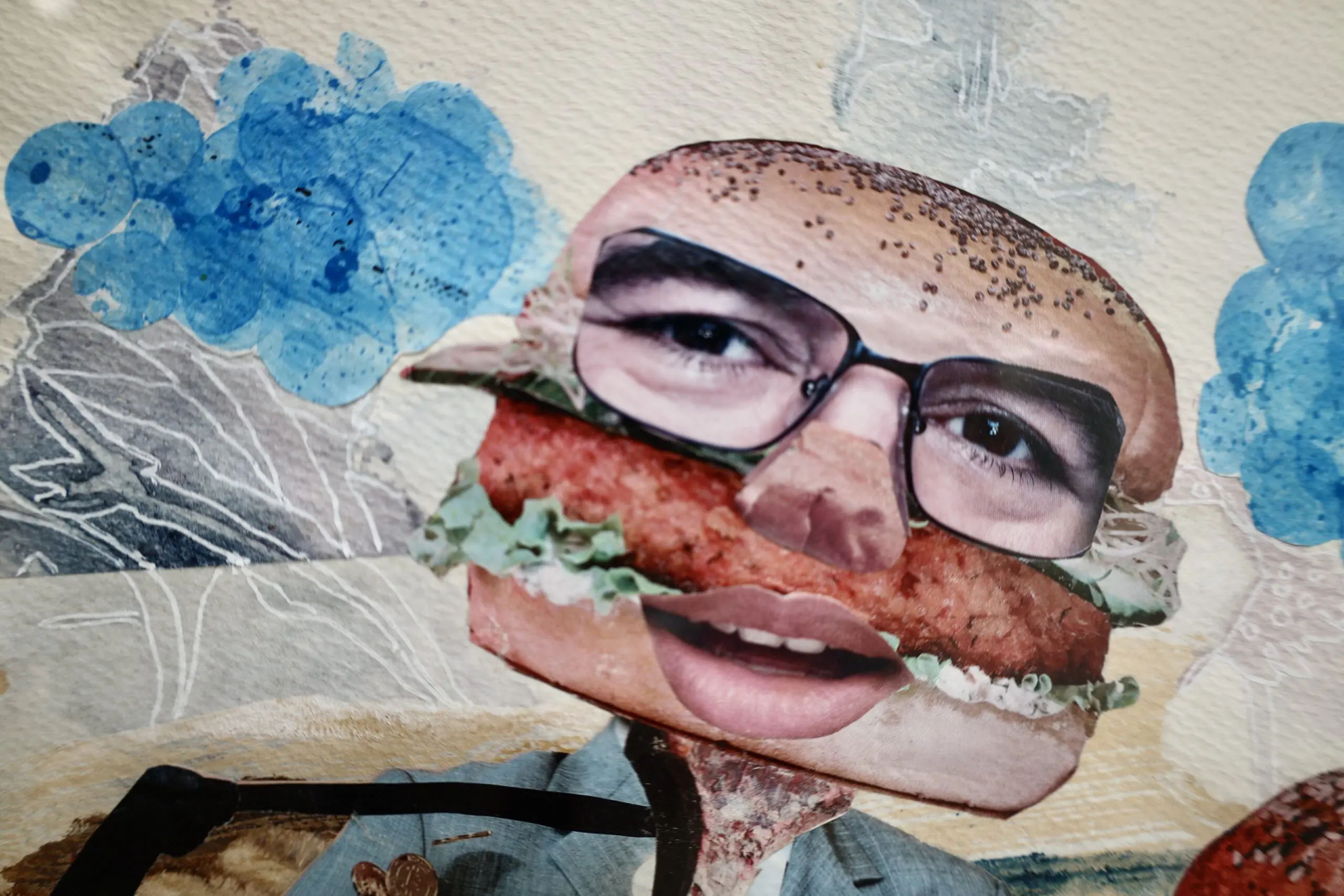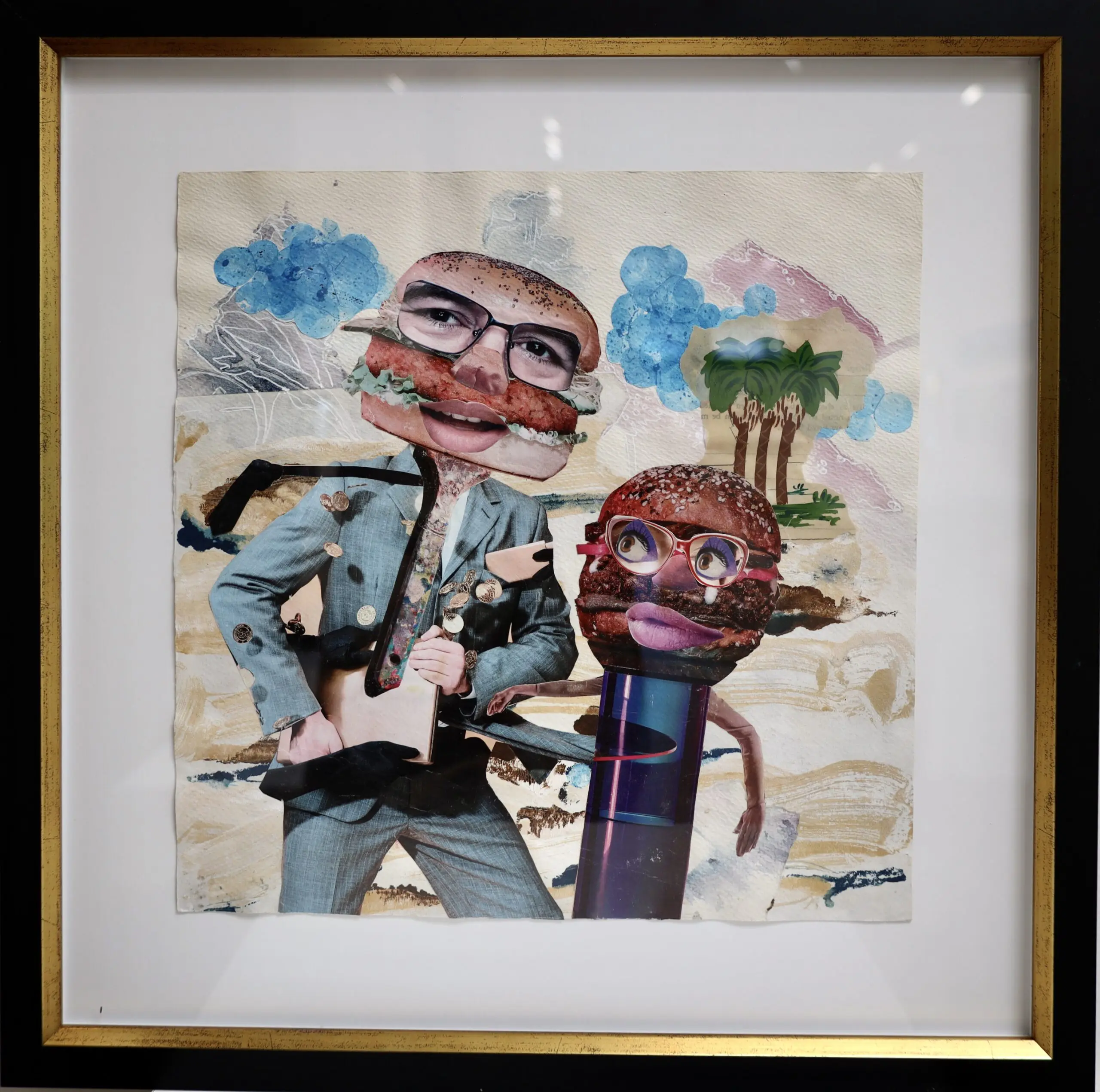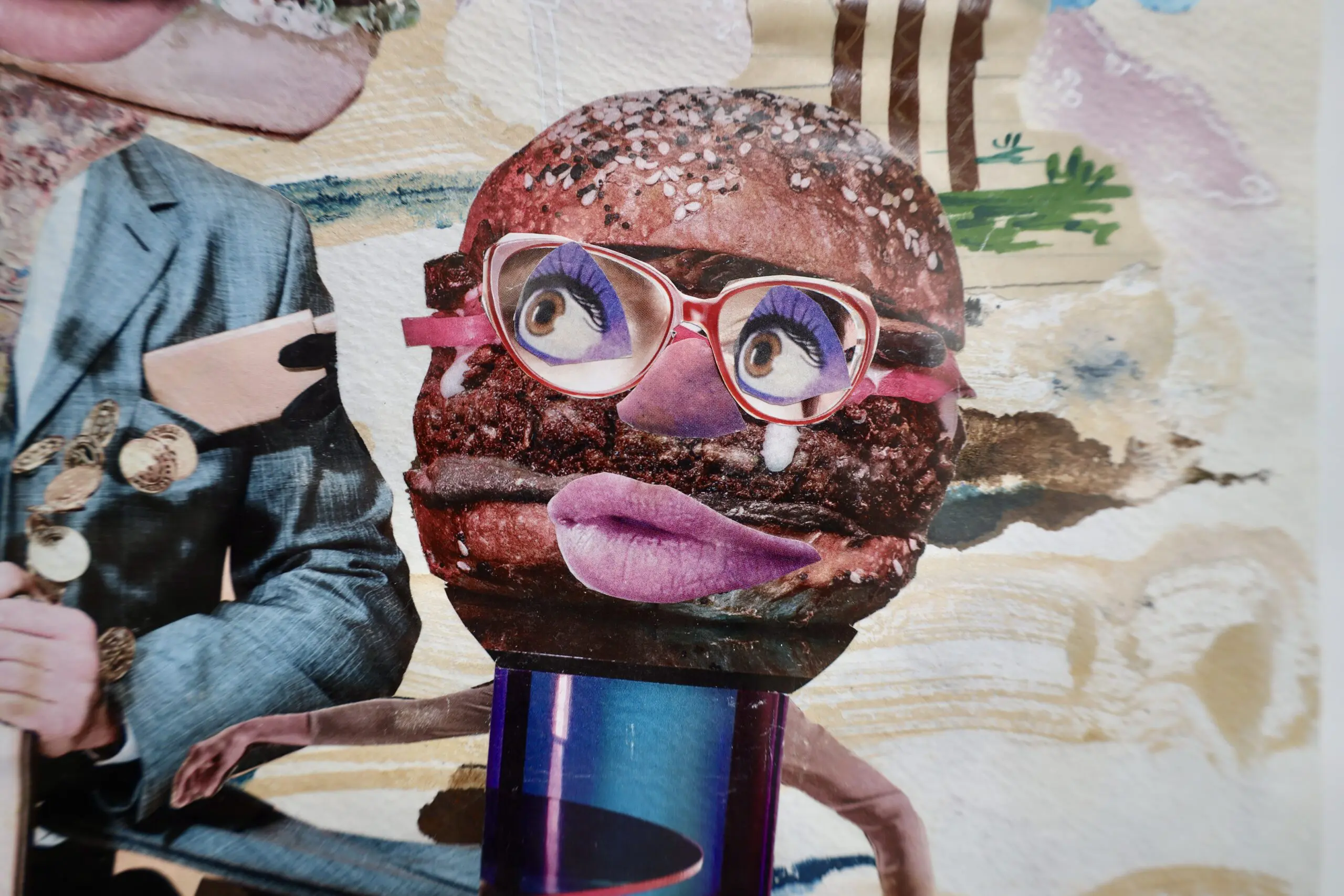 In this vibrant piece the joy of consuming a good burger takes center stage. The artwork depicts a man and a woman, both on the go and ready to conquer the business world. However, what sets them apart is that their bodies are composed of various parts of burgers, creating a whimsical and playful representation.