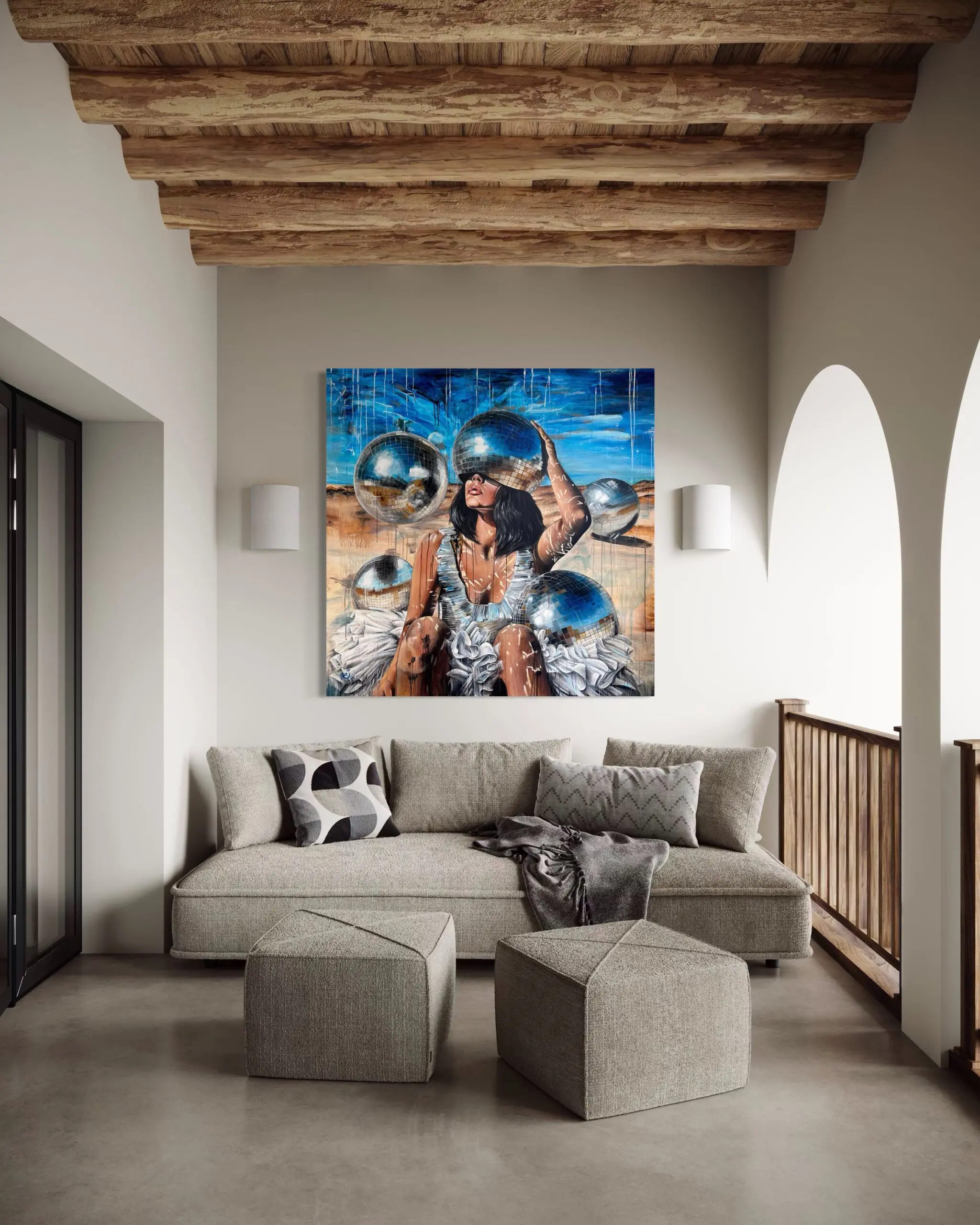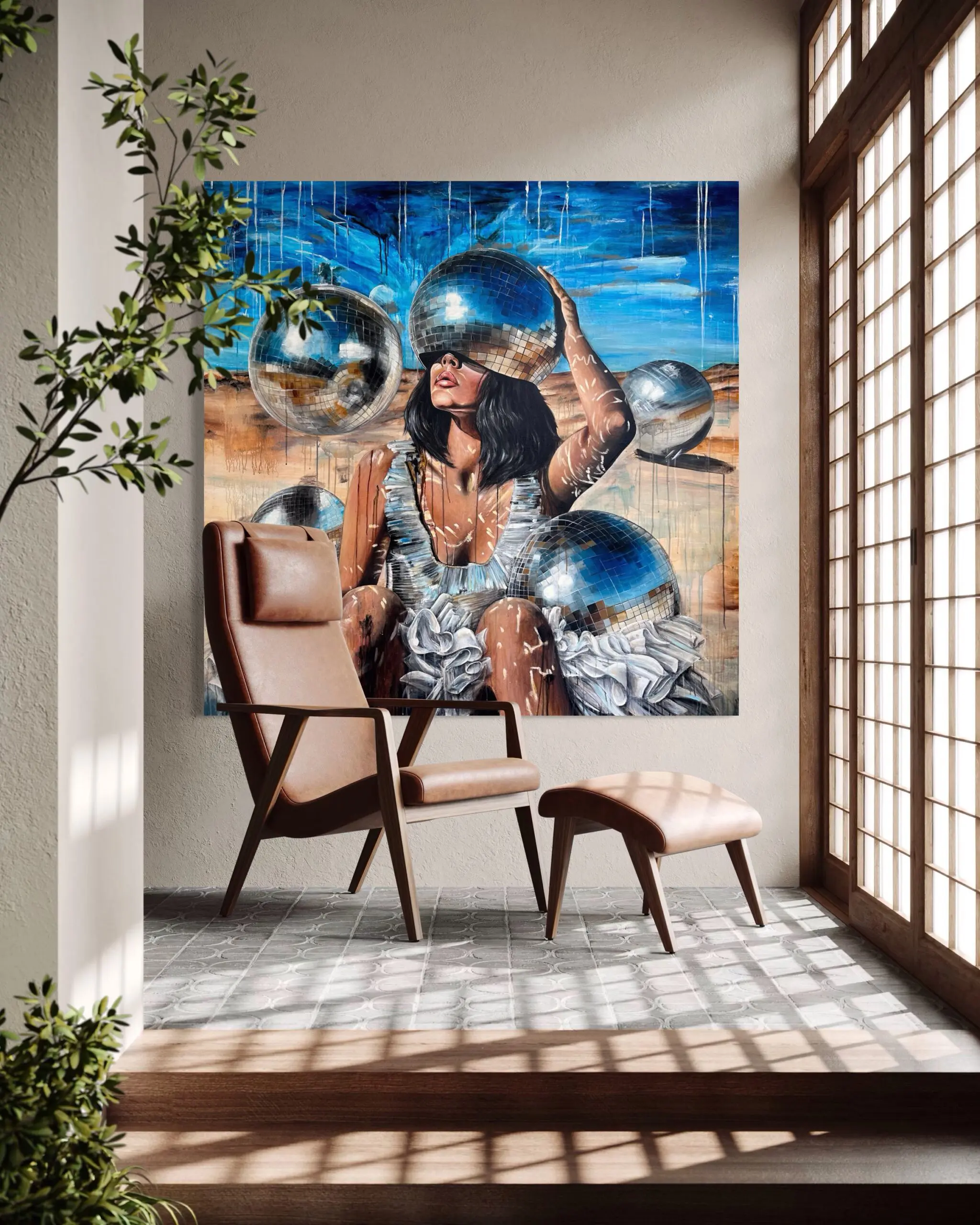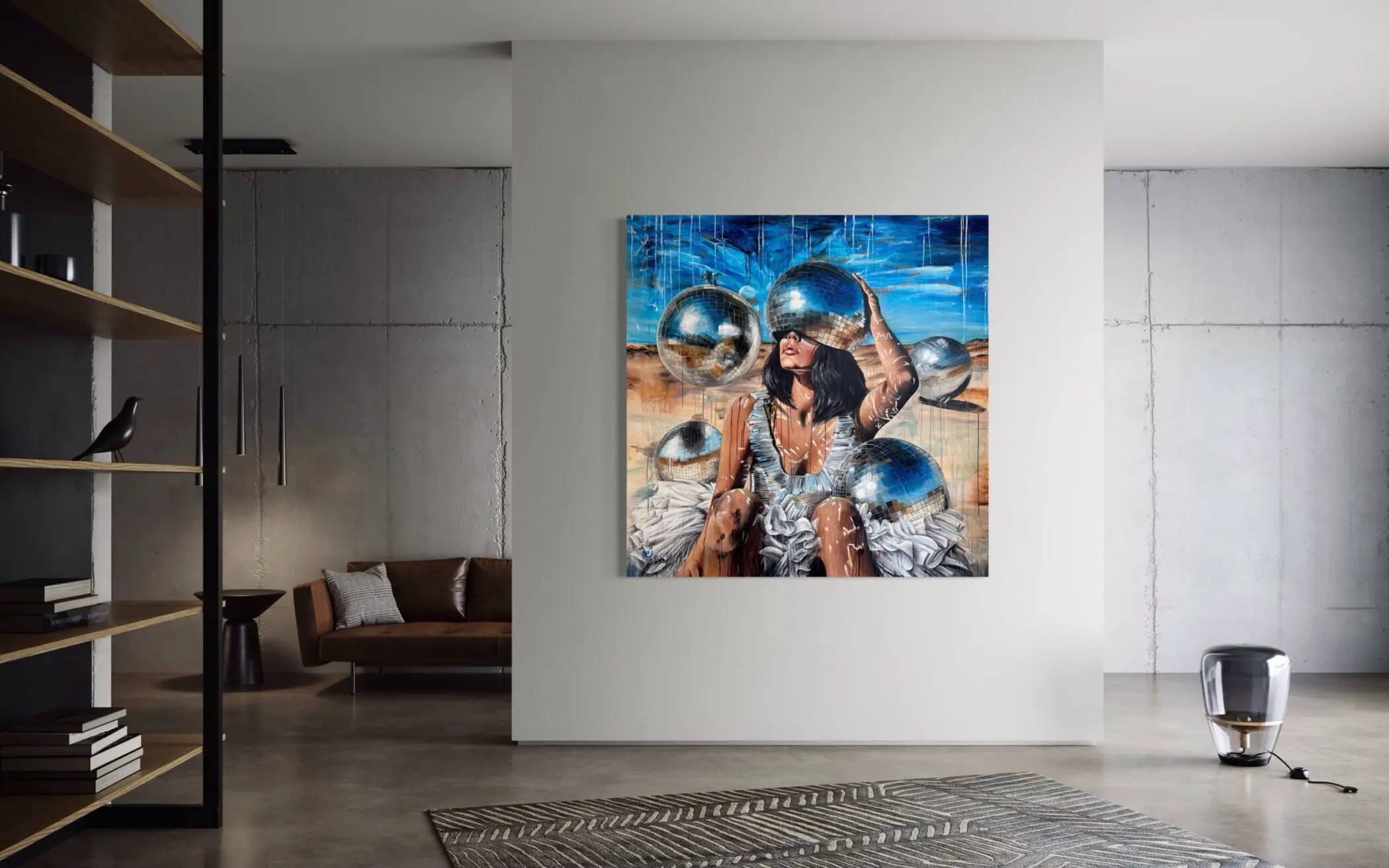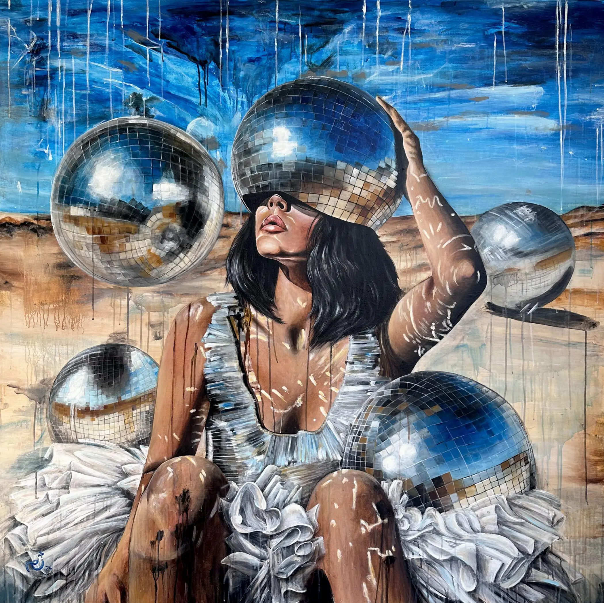 At the heart of the composition, a female figure sits in a barren, arid landscape, draped in a tattered white dress reminiscent of a deconstructed tutu. Her skin bears streaks of paint, as if marked by time, experience, or emotional unraveling. Yet, the most striking element is the mirrored disco ball obscuring her eyes—a powerful metaphor for distorted self-image, fragmented perception, and the illusions of modern existence.
