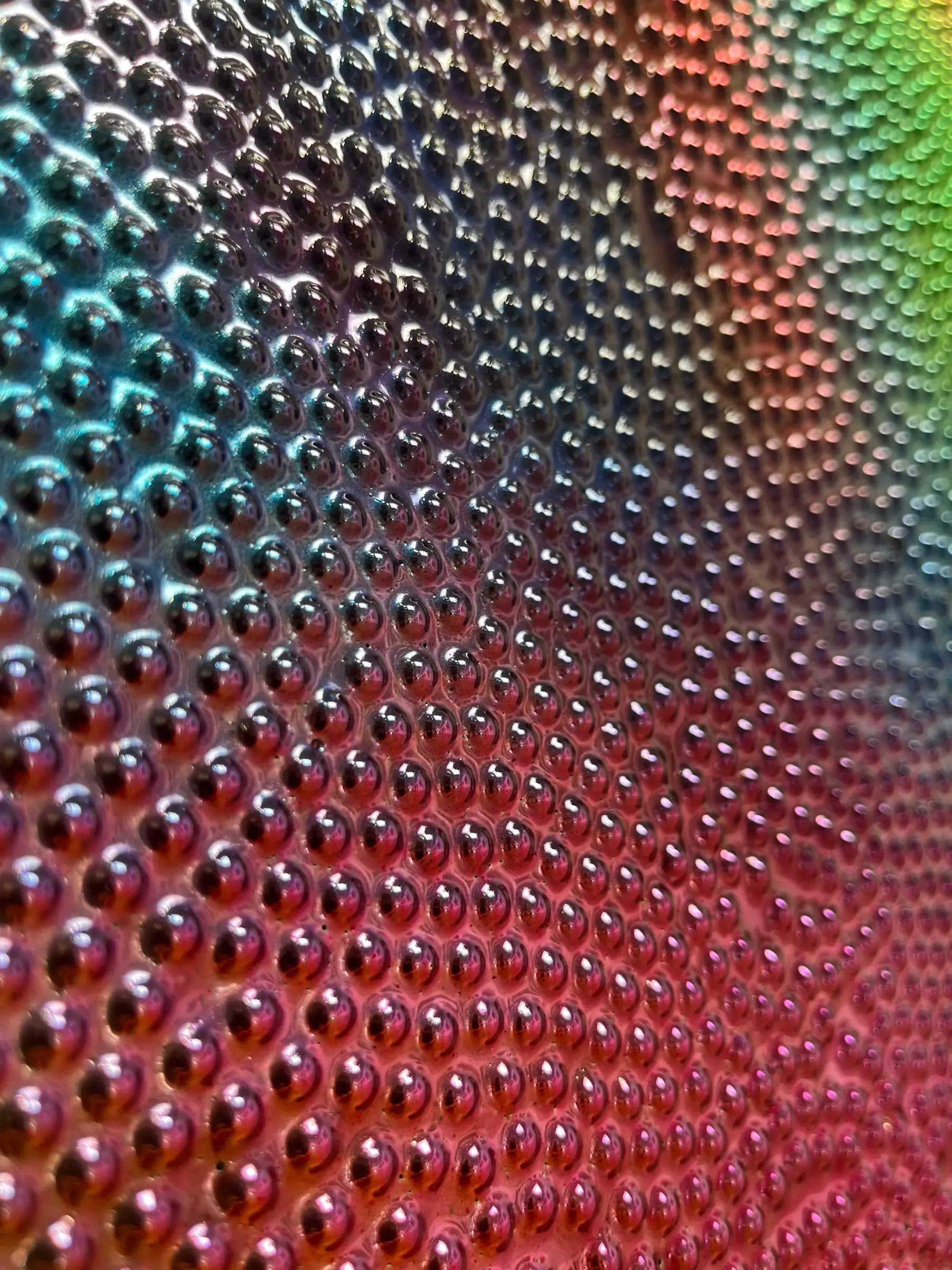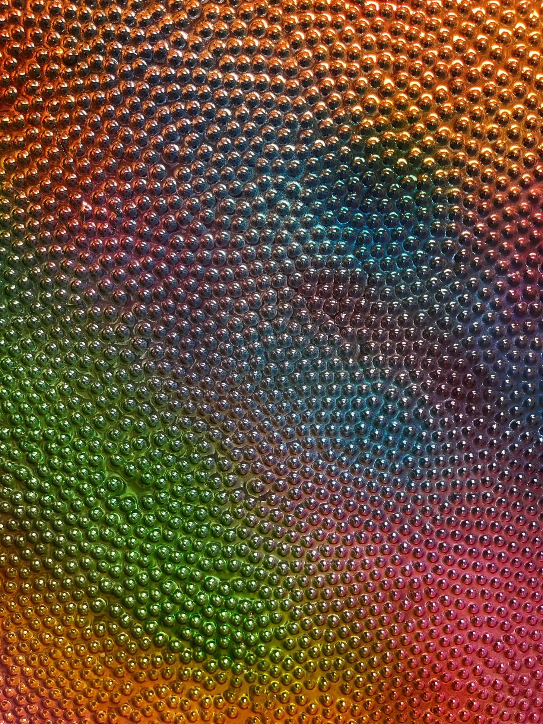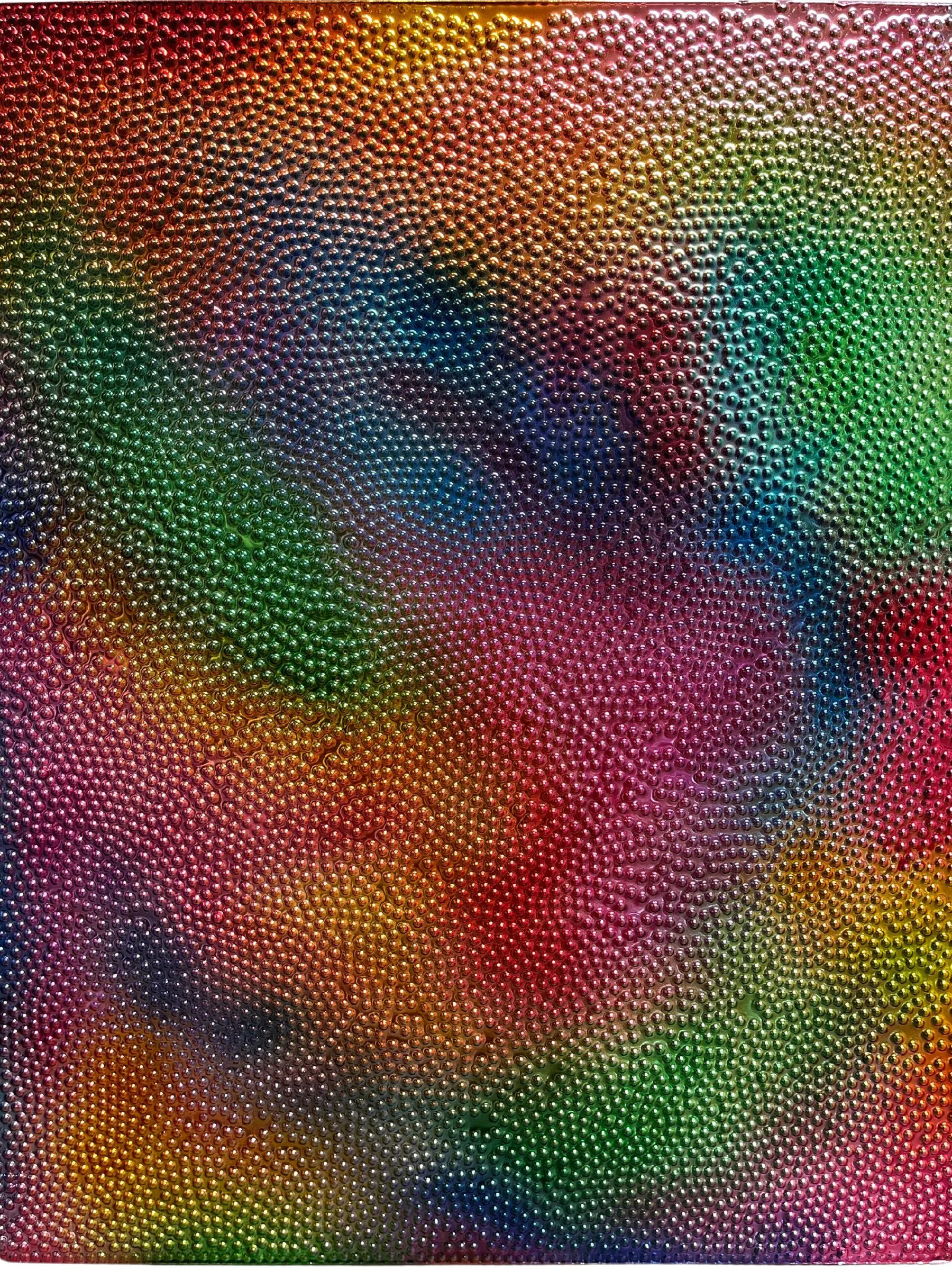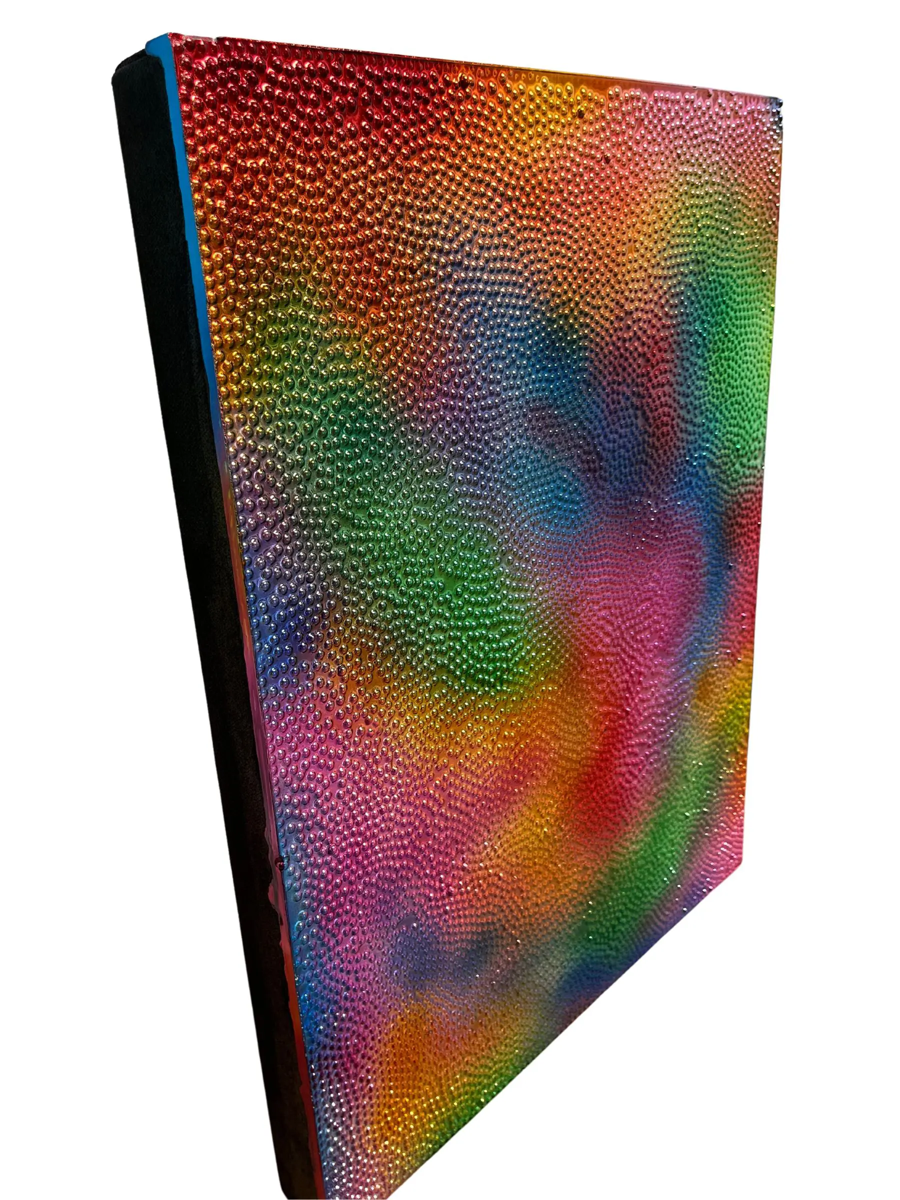 Canvas over artist made panel with epoxy, and 6mm airsoft ammunition, with poly primer, silver deposit, and candy color.