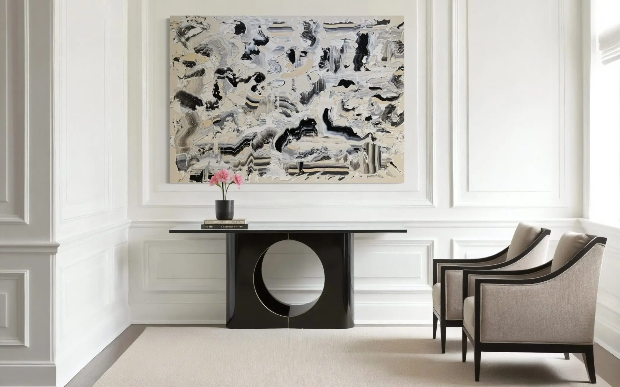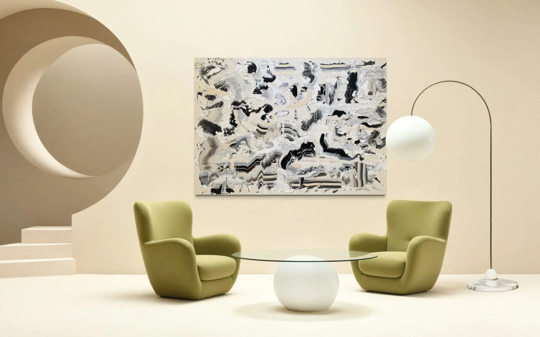 Robert Standish’s “Carbon, Titan, Titanium (Rhythmic #1)” presents an interplay between elemental matter and fluid abstraction, where layers of black, white, and neutral hues fracture and reconstitute themselves across the canvas. The title itself—evoking strength, transformation, and industrial resilience—suggests a dialogue between the organic and the engineered, the geological and the man-made.