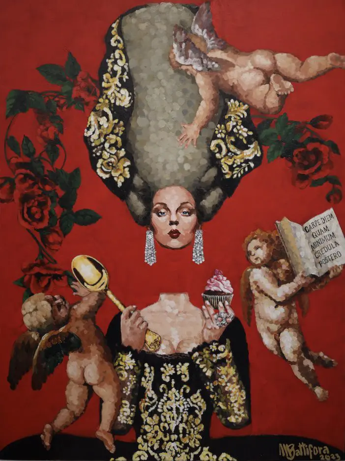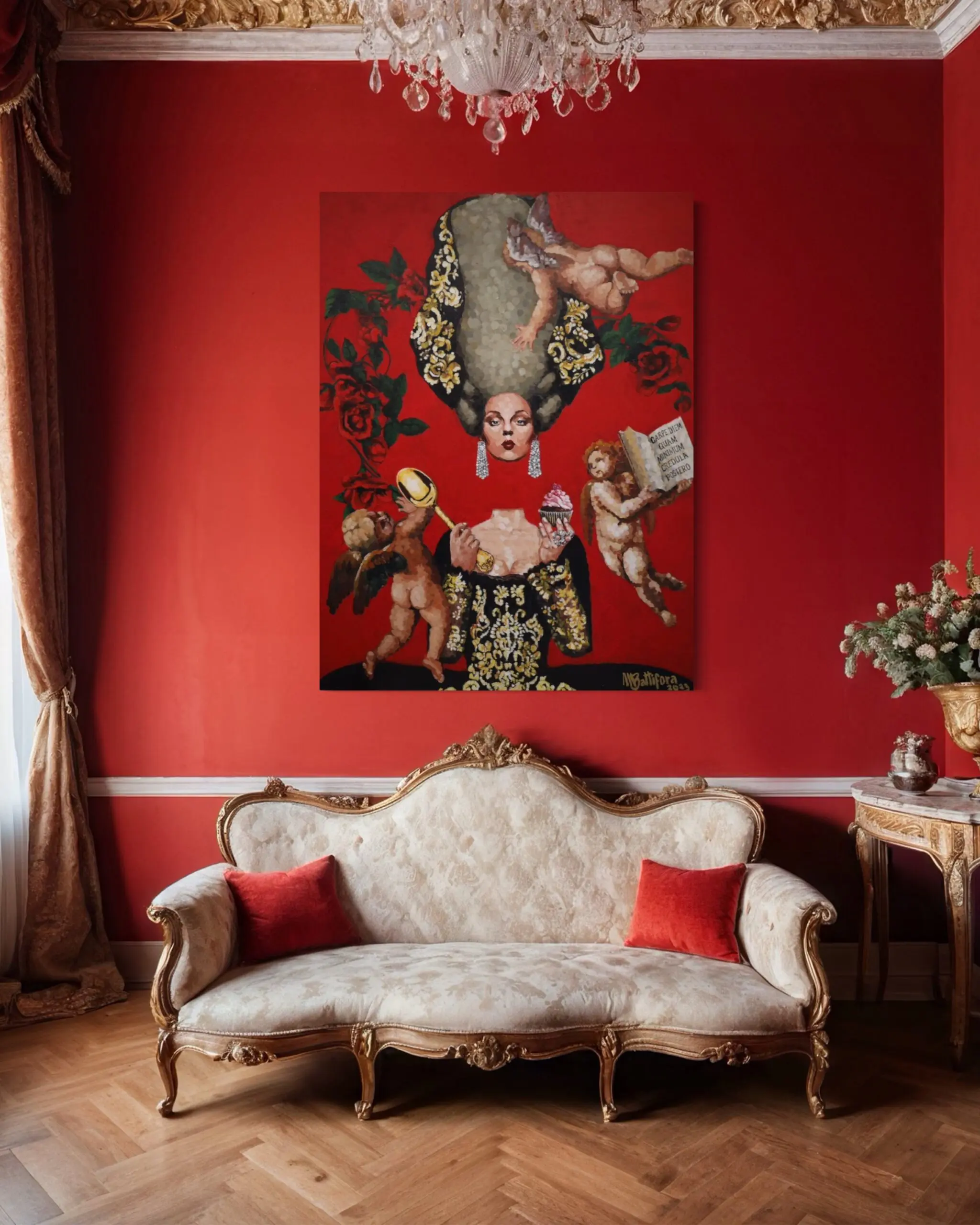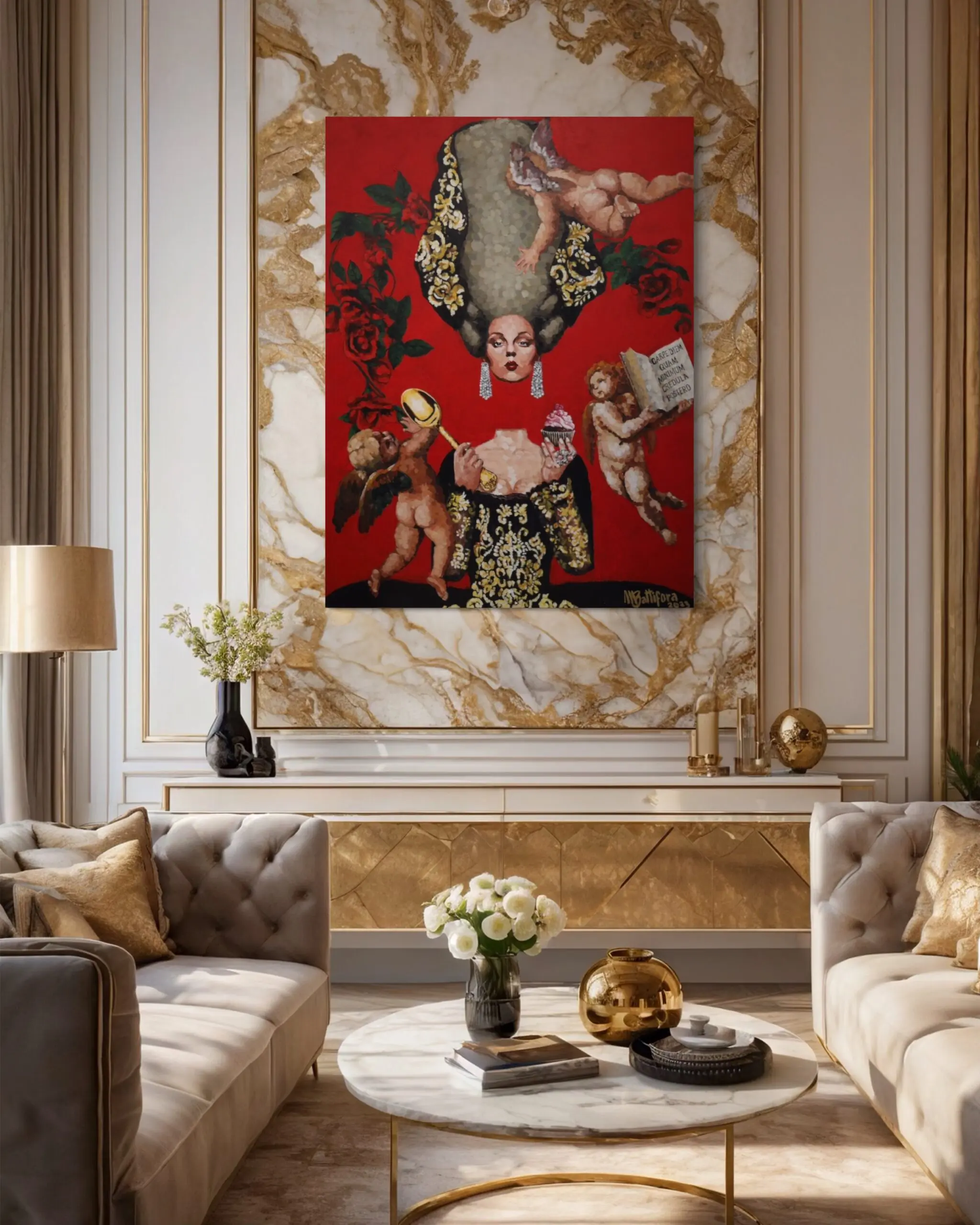 This painting features a modern interpretation of Marie Antoinette, dressed in a Dolce and Gabbana gown, emphasizing the opulence and bold patterns typical of the brand. The background is a striking red, symbolizing passion and power, while the intricate floral designs in gold and black on her dress evoke a sense of luxury and historical grandeur. The figure of Marie Antoinette is adorned with an elaborate, towering hairstyle, reminiscent of her historical image, which adds a dramatic flair. Surrounding her are cherubic figures, one holding a cupcake and another a book, suggesting themes of indulgence and perhaps a commentary on the conflicts between excess and enlightenment.