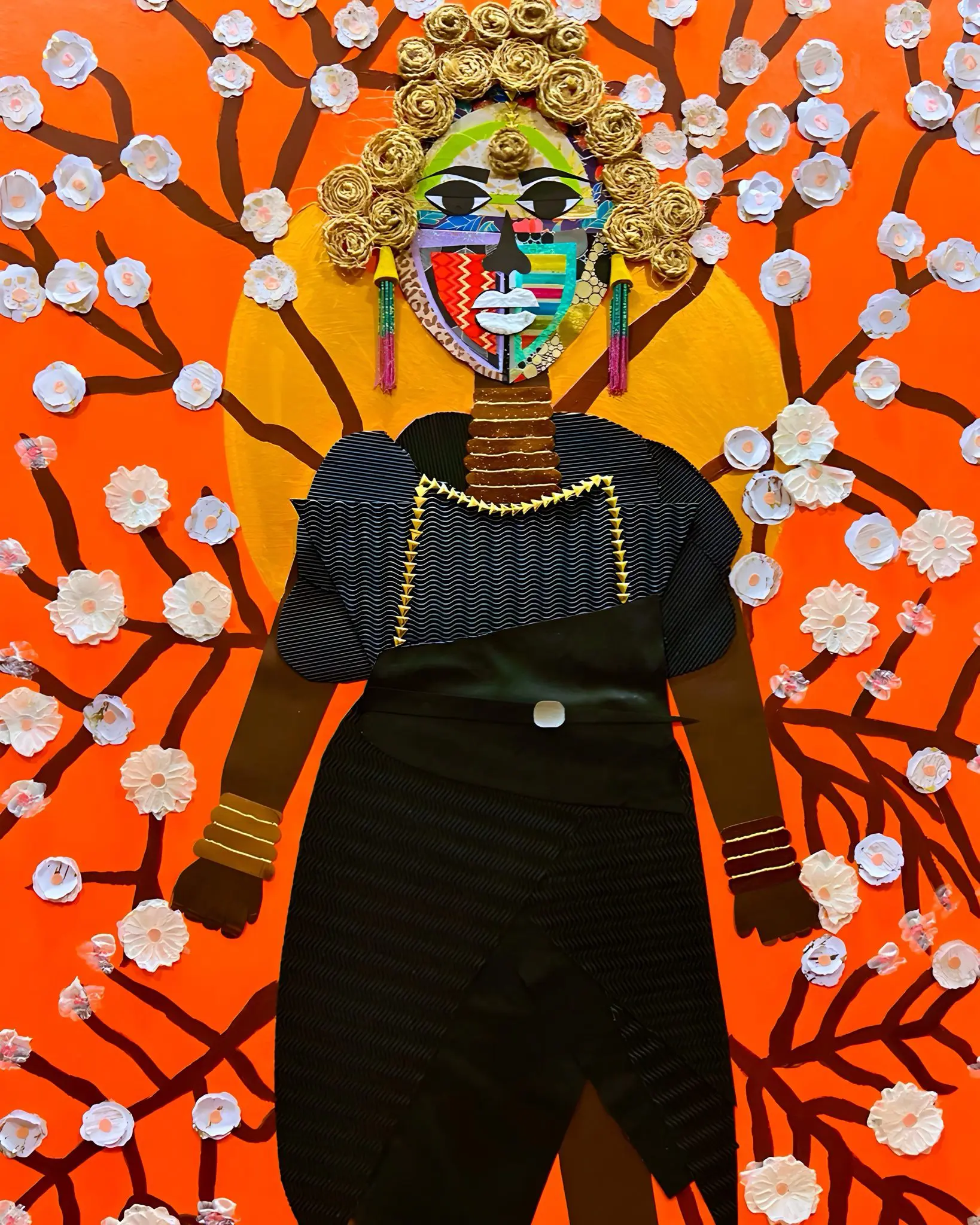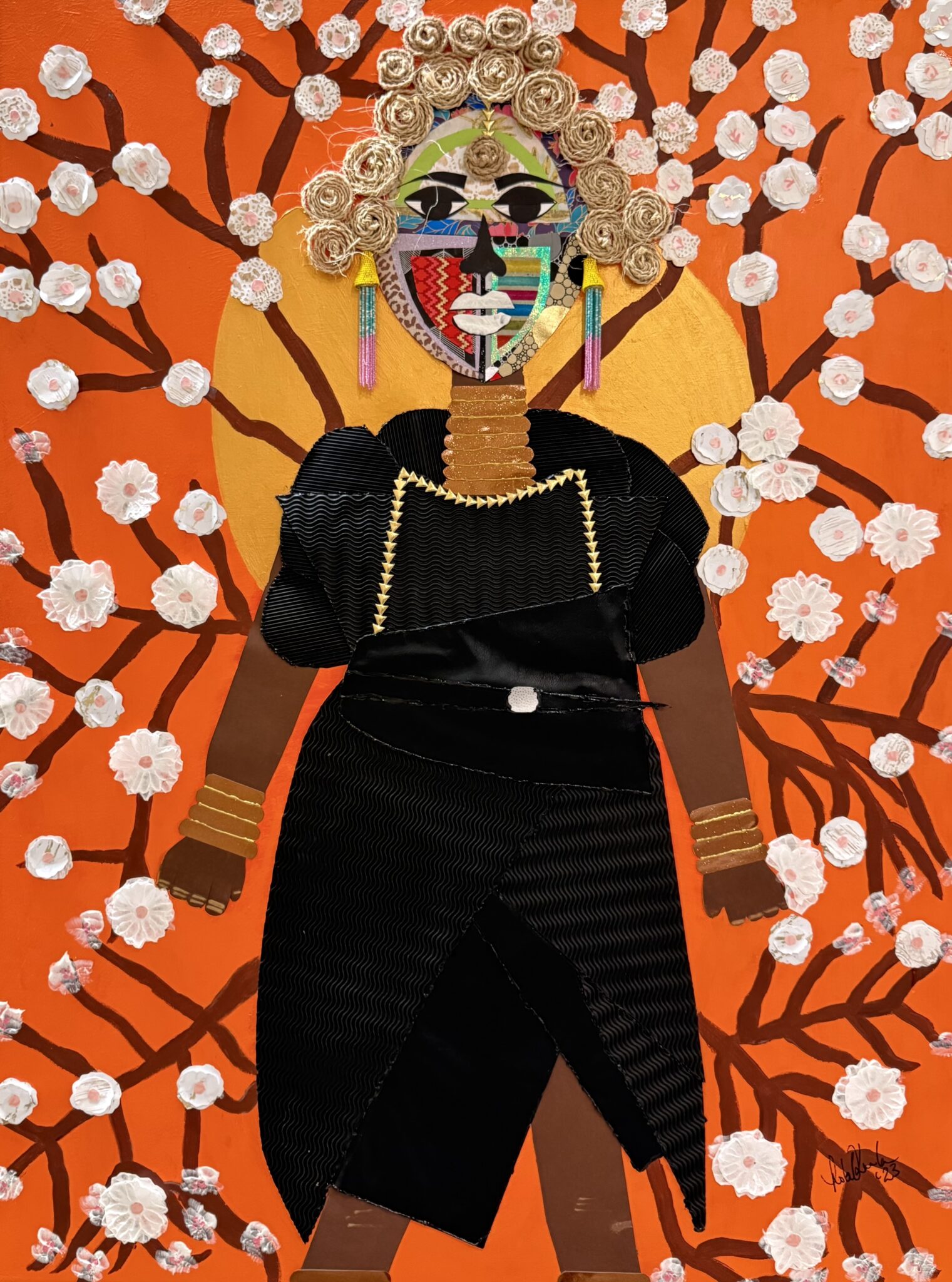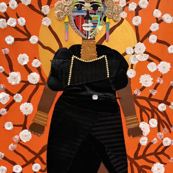 “Cherry Blossom” is a mesmerizing mixed-media collage artwork that intertwines cultural symbolism, texture, and vibrant color. The central figure, meticulously composed of fabric, rope, and repurposed materials, exudes a regal presence—an embodiment of identity, resilience, and heritage. The fragmented, geometric face design reflects influences of Cubism while paying homage to traditional African masks, creating a striking dialogue between contemporary and historical artistic traditions. A crown of golden coiled braids encircles the head, amplifying themes of empowerment and nobility.