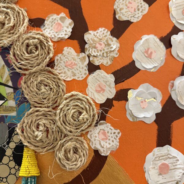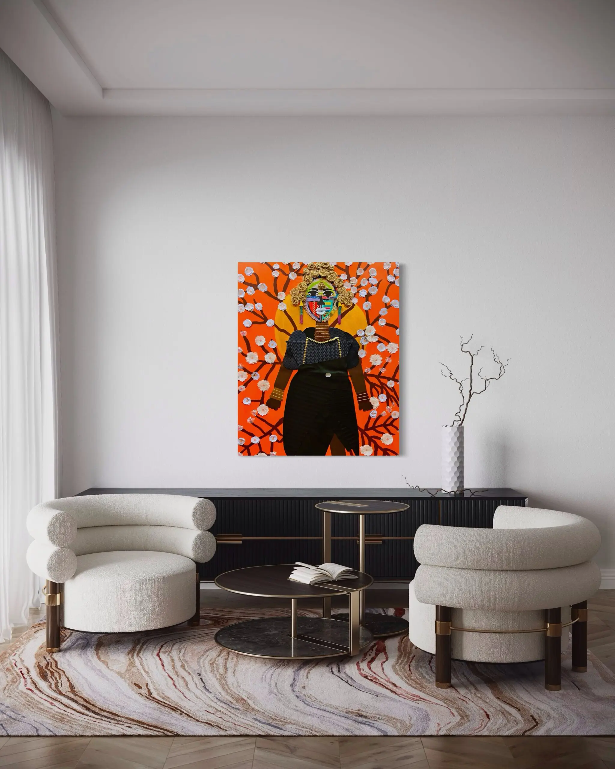 Set against a radiant orange backdrop, adorned with delicate cherry blossoms, the composition symbolizes the fleeting beauty of life while celebrating strength and self-representation. The artist’s meticulous stitching and layering of textures give the piece a sculptural, tactile quality, reinforcing its handcrafted intricacy. This artwork thrives on duality—softness and strength, heritage and innovation, tradition and transformation.
