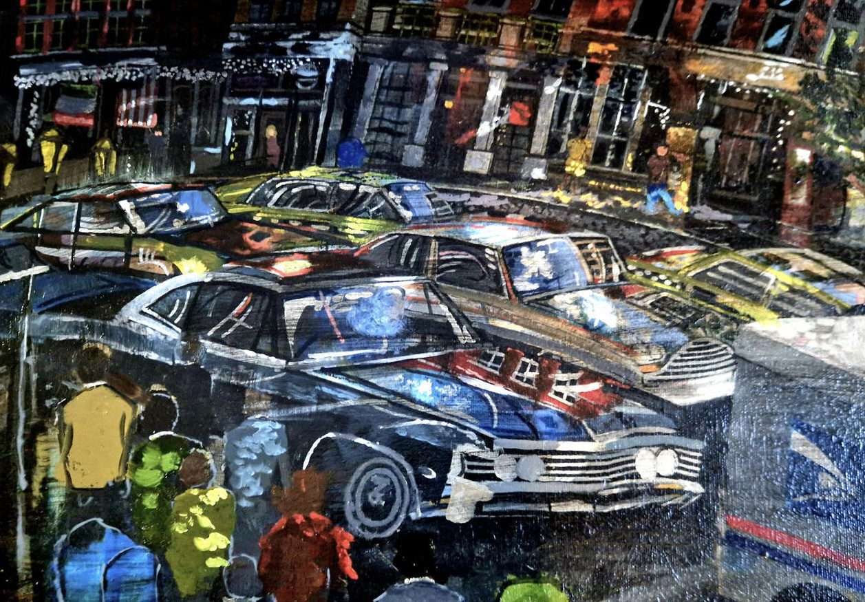 Lamme’s painterly technique blurs the boundary between abstraction and realism, evoking the gritty energy of street photography while embracing a tactile, almost expressionist approach to texture. His deep blacks, electric yellows, and muted reds capture the pulse of the city after dark, recalling the nocturnal dynamism of artists like George Bellows or Edward Hopper—yet infused with a distinctly contemporary urgency. Lamme invites the viewer to lose themselves in the hypnotic repetition of headlights and faceless movement, reminding us that the city is alive, relentless, and ever in motion.