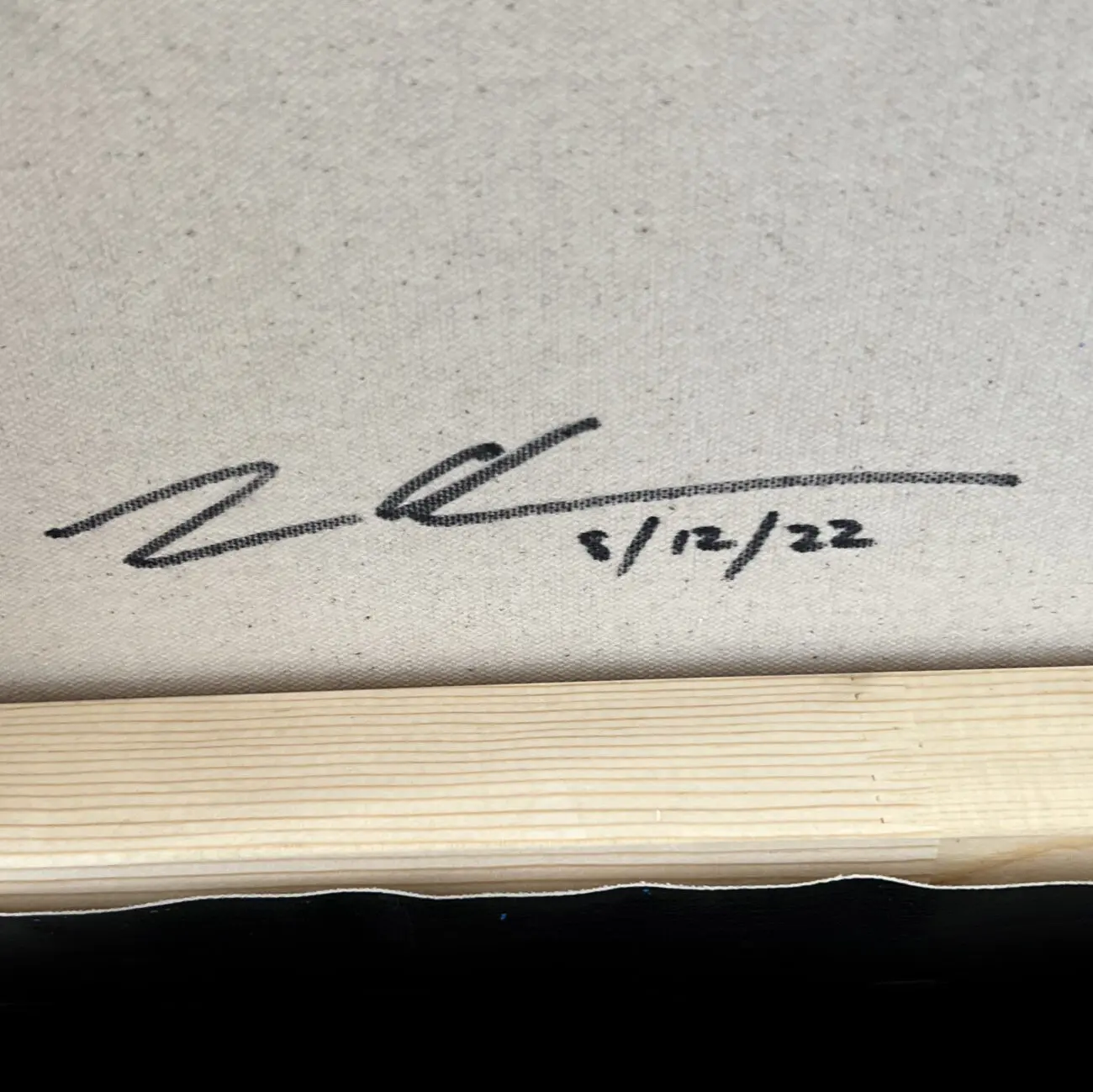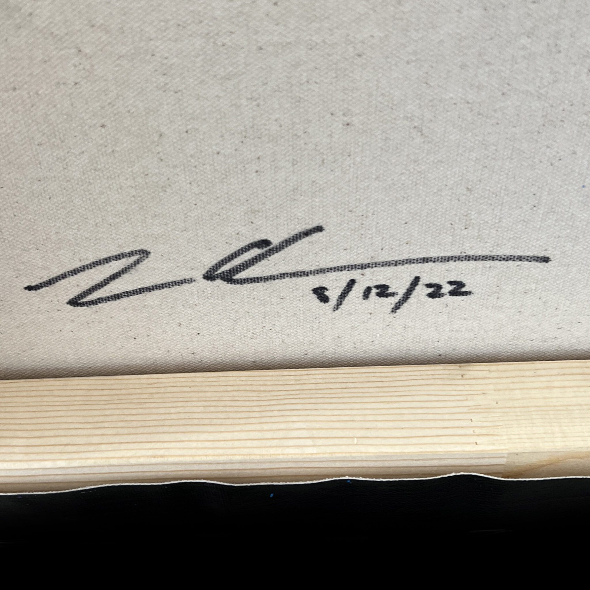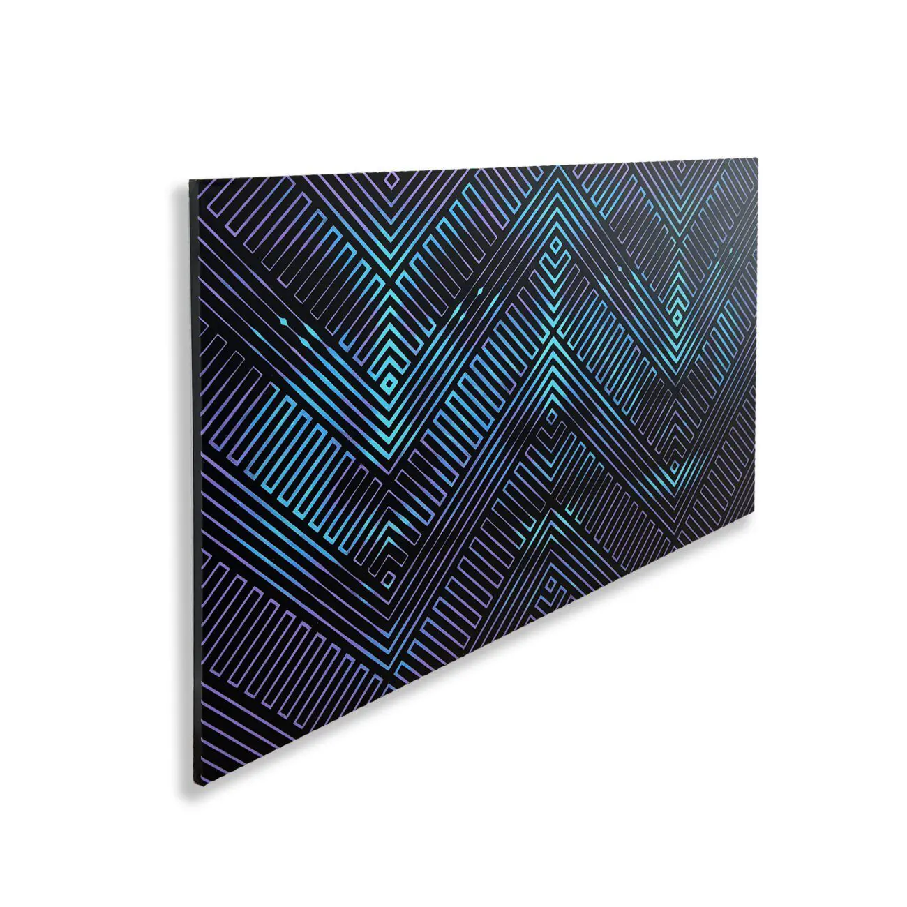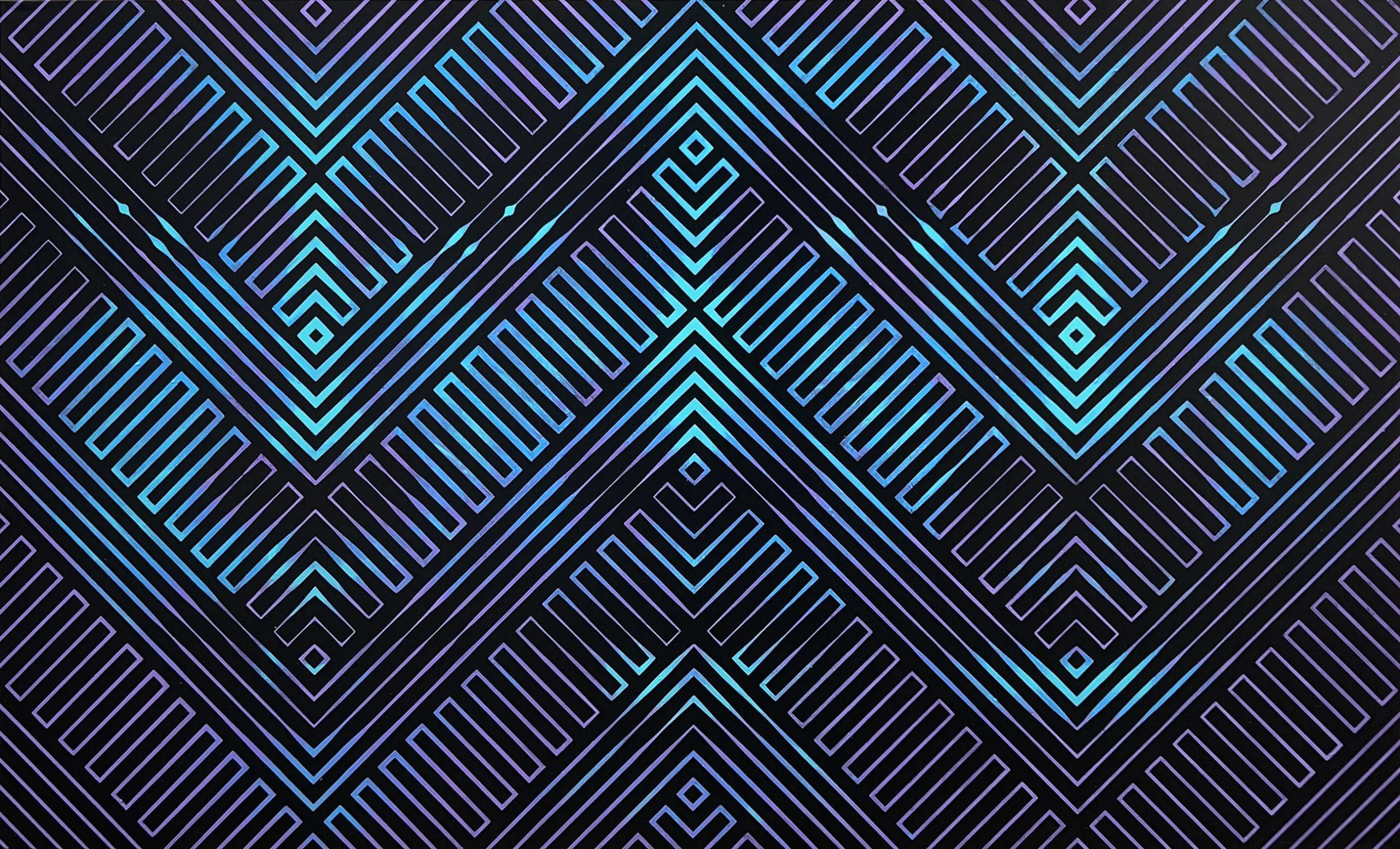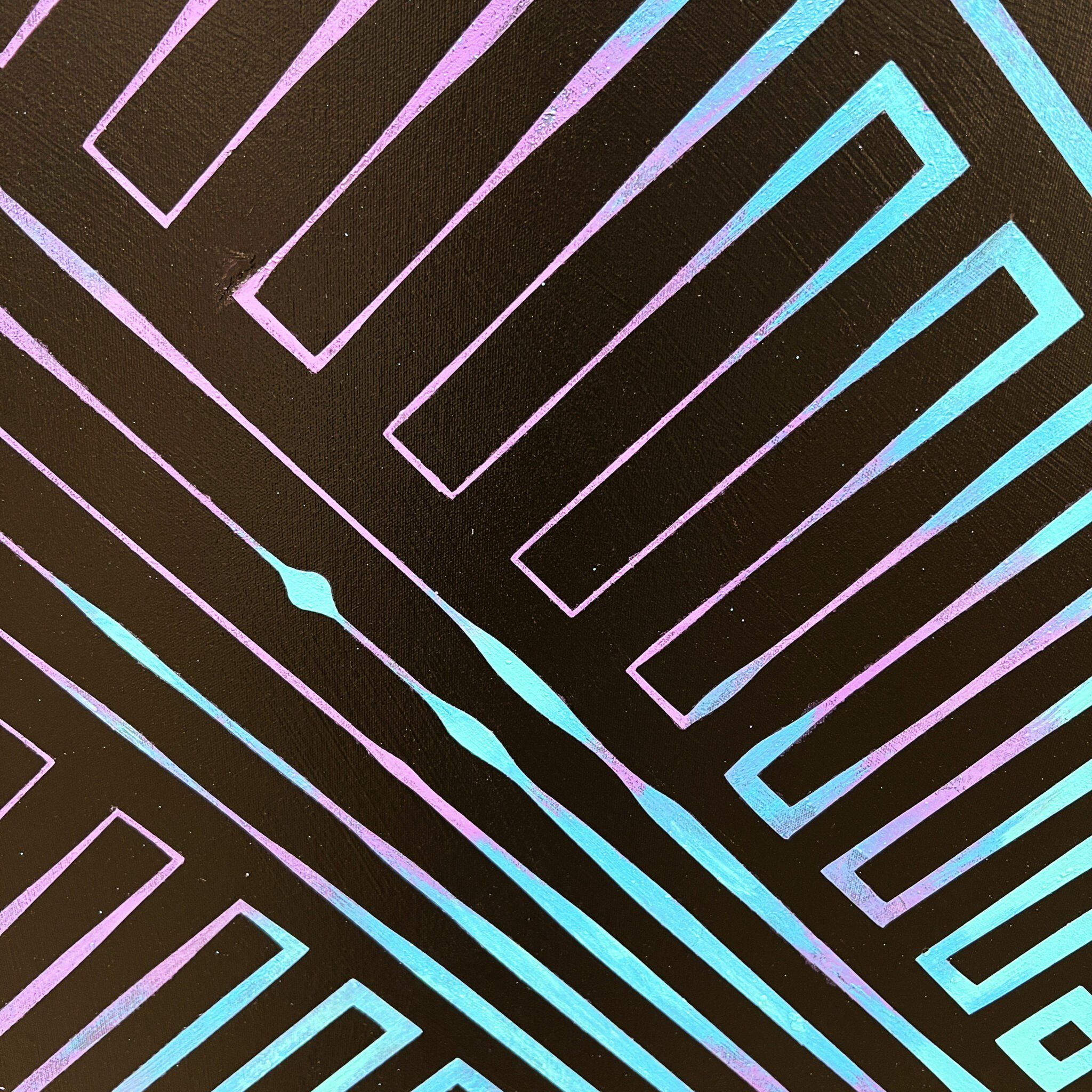 “Coexist” is a masterful exploration of optical dynamism, where precision and perception collide in a rhythmic ballet of line and light. Against a deep black ground, the artist orchestrates a meticulously engineered system of geometric patterns, radiating in gradients of electric blue and violet. The composition relies on acute linear repetition and symmetry, generating a visual tremor that vibrates across the surface, pulling the viewer into an active, almost kinetic experience.