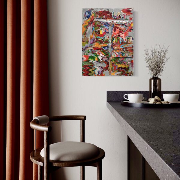 This compact yet impactful painting is energized by a mix of primary and secondary colors set against a neutral gray background. The composition carries a tribal sensibility, with selective use of white accentuating the vibrancy of the surrounding hues. The sparing application of white is a deliberate choice, drawing attention to key elements within the piece and allowing the other colors and brushwork to take prominence. This controlled approach results in a visually dynamic work that maintains a sense of balance and intensity throughout.