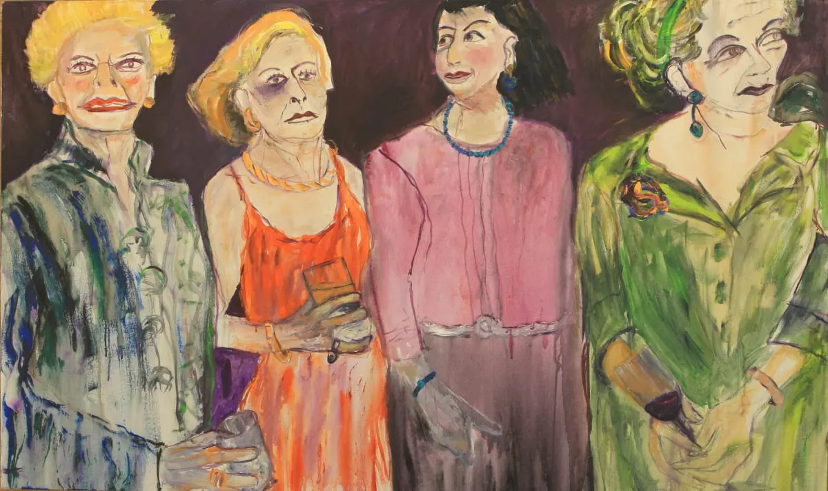 “Cougar Town” by Haleh Mashian is a bold, vibrant celebration of confidence, femininity, and self-expression. The quartet of women at the center of the composition commands attention, their presence unapologetic and magnetic. In this piece, Mashian challenges outdated perceptions of age and desirability, presenting these figures as a dynamic force—self-assured, stylish, and entirely in control of their narrative.