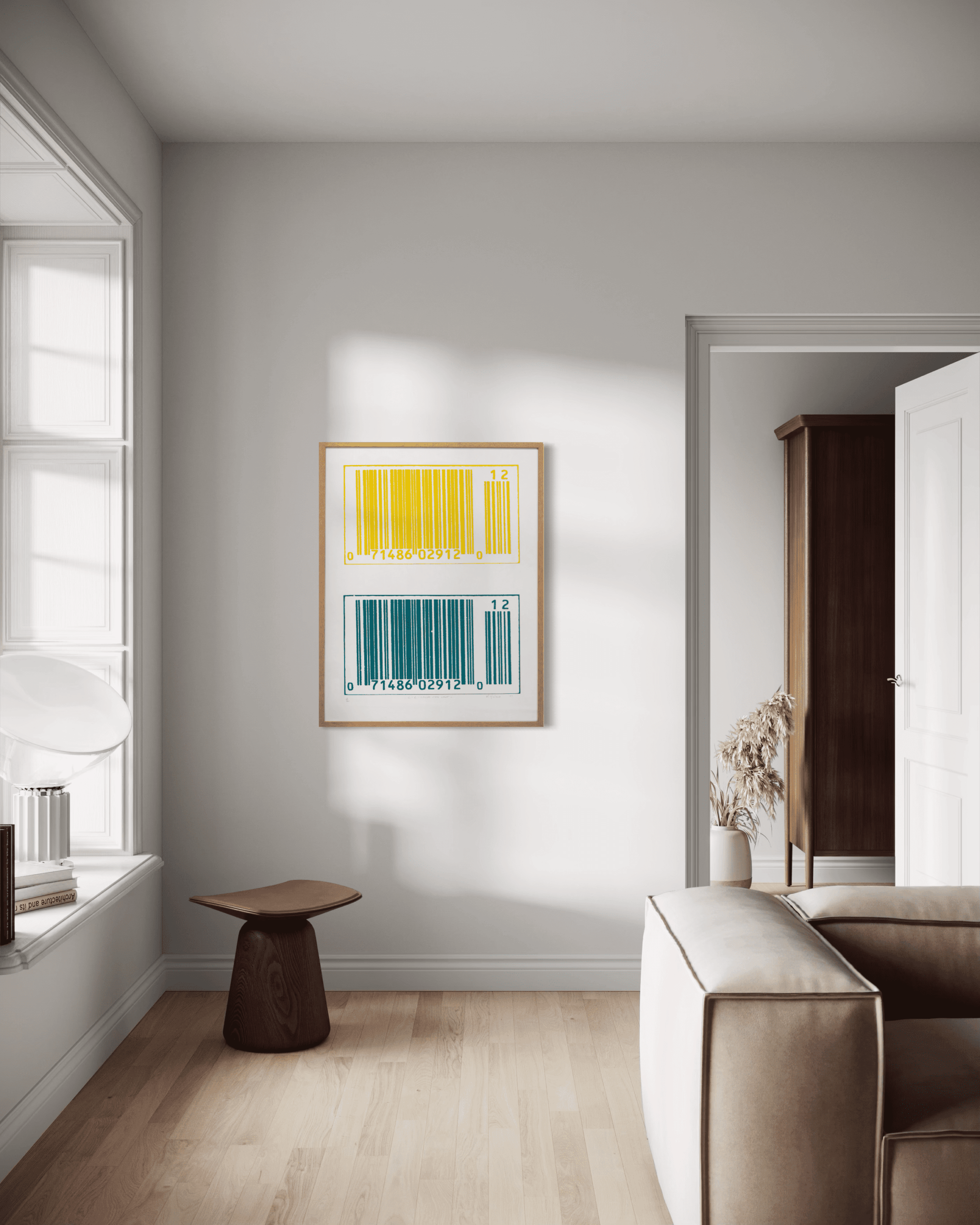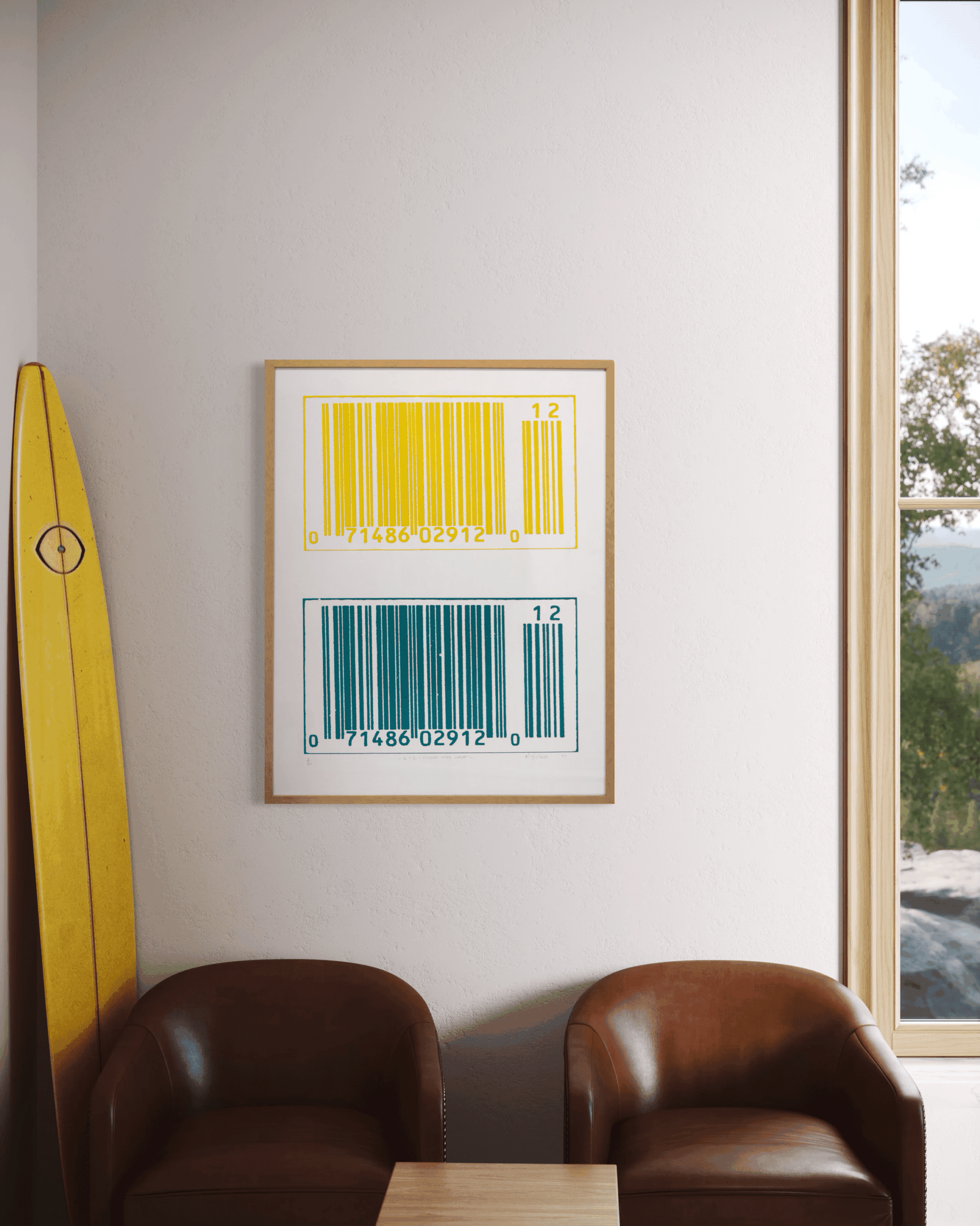 This hand-made silkscreen reinterprets the everyday barcode as a graphic and conceptual form, drawing from the legacy of Pop Art and postwar conceptual practices that elevated commercial symbols into subjects of artistic inquiry. Rendered in contrasting yellow and blue, the vertical bands create a rhythmic composition that oscillates between abstraction and legibility.