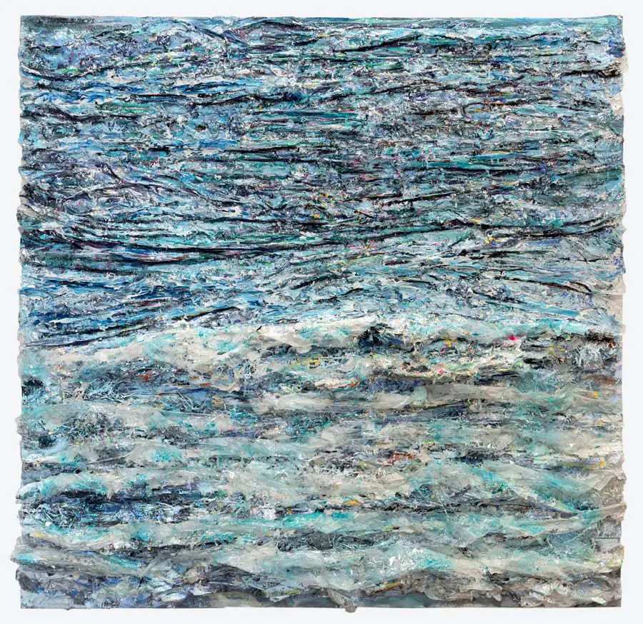 The composition’s texture is a defining feature, as layered media recreate the crests and troughs of ocean waves with remarkable dimensionality. Deep blues dominate the upper portion of the piece, gradually transitioning into lighter tones that suggest the interplay of foam, transparency, and depth in water. The waves appear momentarily frozen—capturing both their power and delicacy, much like light refracting off a crystalline sea.