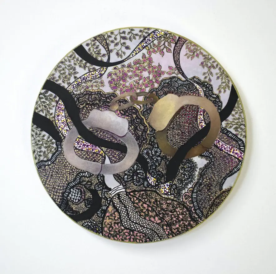 Leigh Salgado’s “Cuffed” is an intricate interrogation of power, control, and femininity, rendered with the artist’s signature precision in hand-cut paper and acrylic. The work juxtaposes the delicacy of lace and floral motifs with the stark presence of handcuffs—objects synonymous with restraint, authority, and submission. Suspended within a labyrinthine web of undulating black ribbons and gilded patterns, the cuffs become both a literal and symbolic focal point, entangled in a world of ornamentation that refuses passivity.