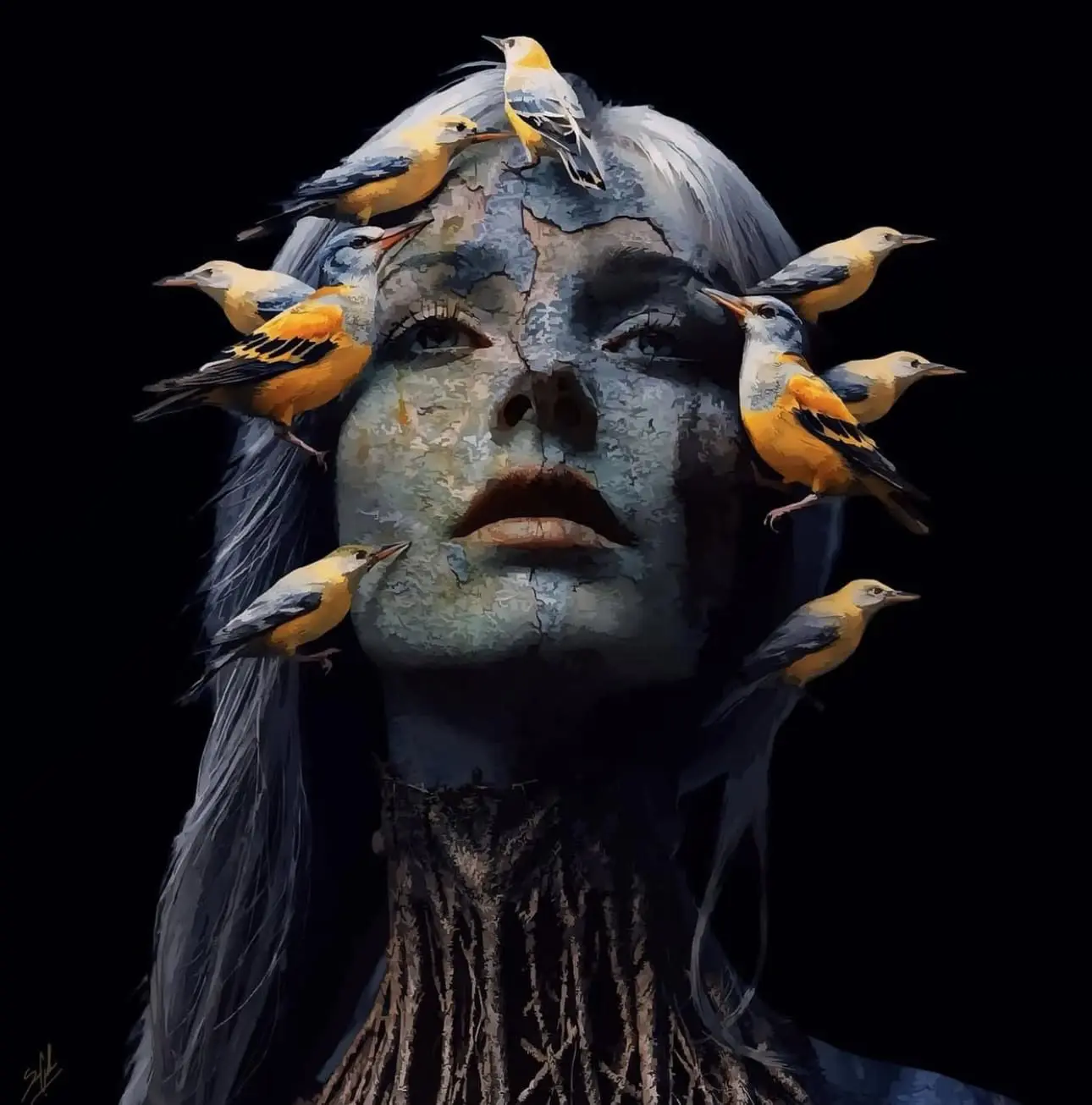 With Curando el Invierno (“Healing the Winter”), Susana Casillas delivers an evocative vision of rebirth and emotional thaw. A woman—her visage cracked and earthen like frozen ground—gazes upward, surrounded by a constellation of vibrant yellow birds. Her skin bears the texture of weathered bark or cracked ice, alluding to the dormancy and quiet suffering of winter, both literal and metaphorical. Casillas’ recurring visual language—the fissured surface of the soul—meets a new counterpoint here: movement, color, and life. The birds, likely orioles, serve as luminous messengers of hope, flitting around the woman’s face, whispering warmth back into her cold silence. They do not merely adorn her—they appear to be tending, healing, awakening. Perhaps most striking is the transformation occurring at the neck, where her body subtly merges into tree roots, grounding her yet also suggesting growth. She is both part of the earth and reaching beyond it, caught between stillness and resurgence. The composition becomes a prayer to spring—not just of the seasons, but of the self.