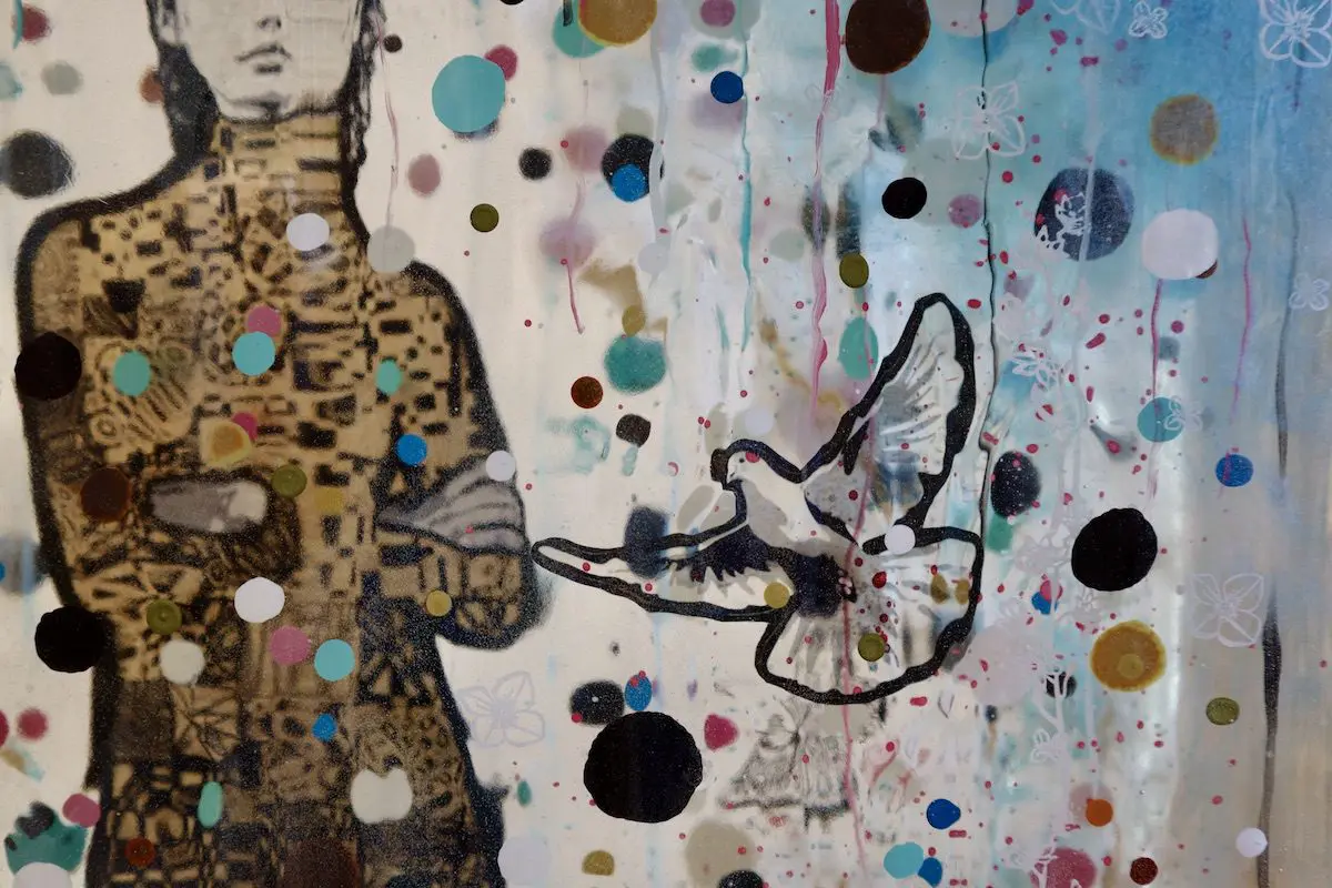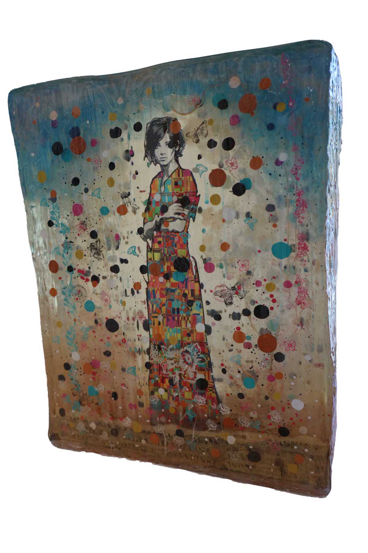 The sculpture “Day Dream” by Jose Cacho is entirely crafted from transparent resin, allowing viewers to peer inside its depth-filled contents. The resin has captured a multitude of vibrant, multi-colored dots and other whimsical elements like butterflies and flowers, seemingly suspended within the cube. At the center stands a figure, depicted in an illustrative manner. The figure, a young woman, is portrayed wearing a colorful, patterned dress that blends seamlessly into the surrounding splashes of color and design elements within the resin. Her expression is contemplative, adding an emotive dimension to the piece.
