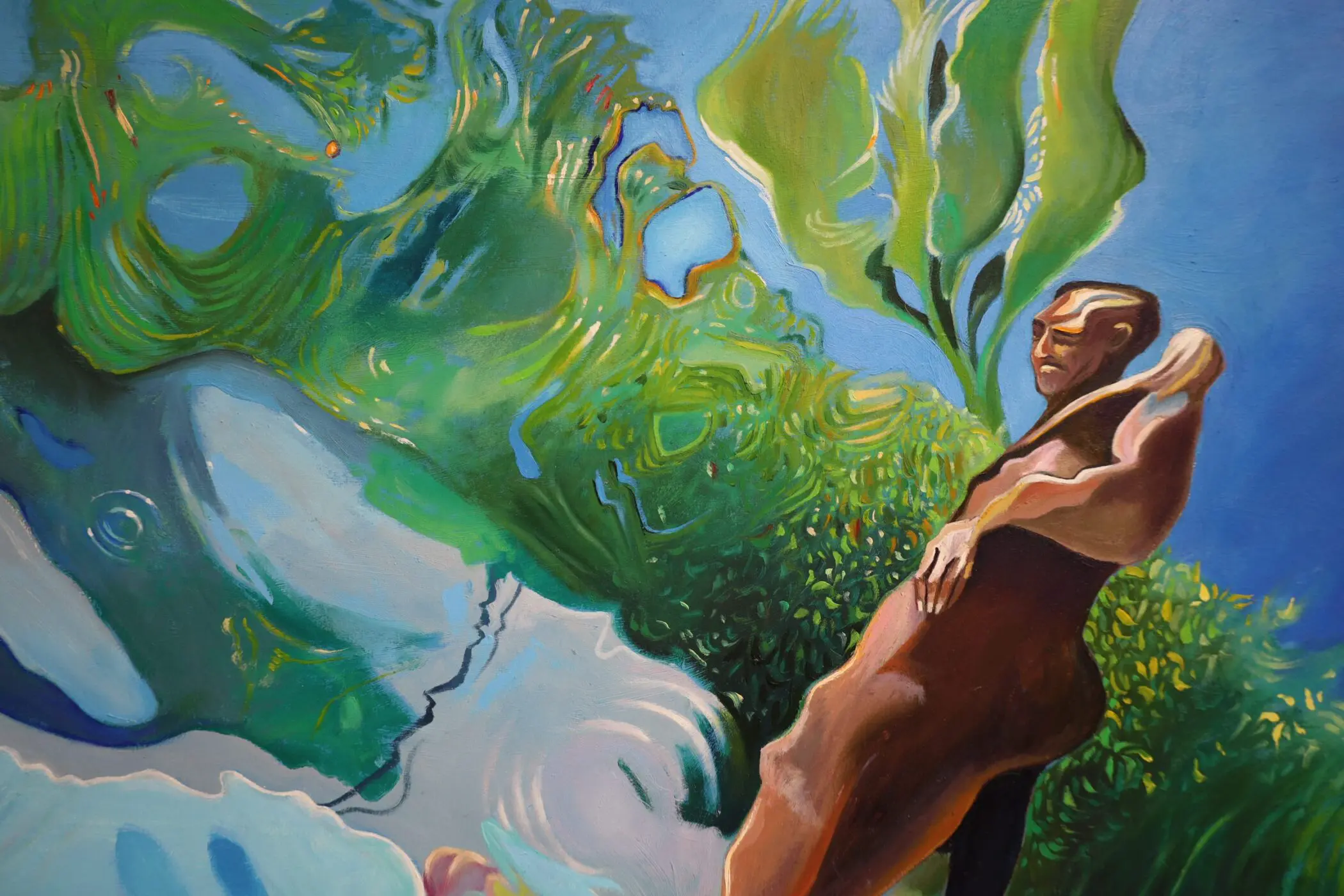 David Jester’s Daydream is an evocative exploration of distorted perception, weightlessness, and the fluid boundaries between reality and illusion. Suspended beneath the water’s surface, the central figure floats in a moment of surrender, their body bathed in soft blue hues and dappled reflections. Above, the standing figure, rendered in earthy tones, looms over the distorted pool edge—an inverted reflection that seems to exist in a different dimension, tethered yet separate from the submerged world below.