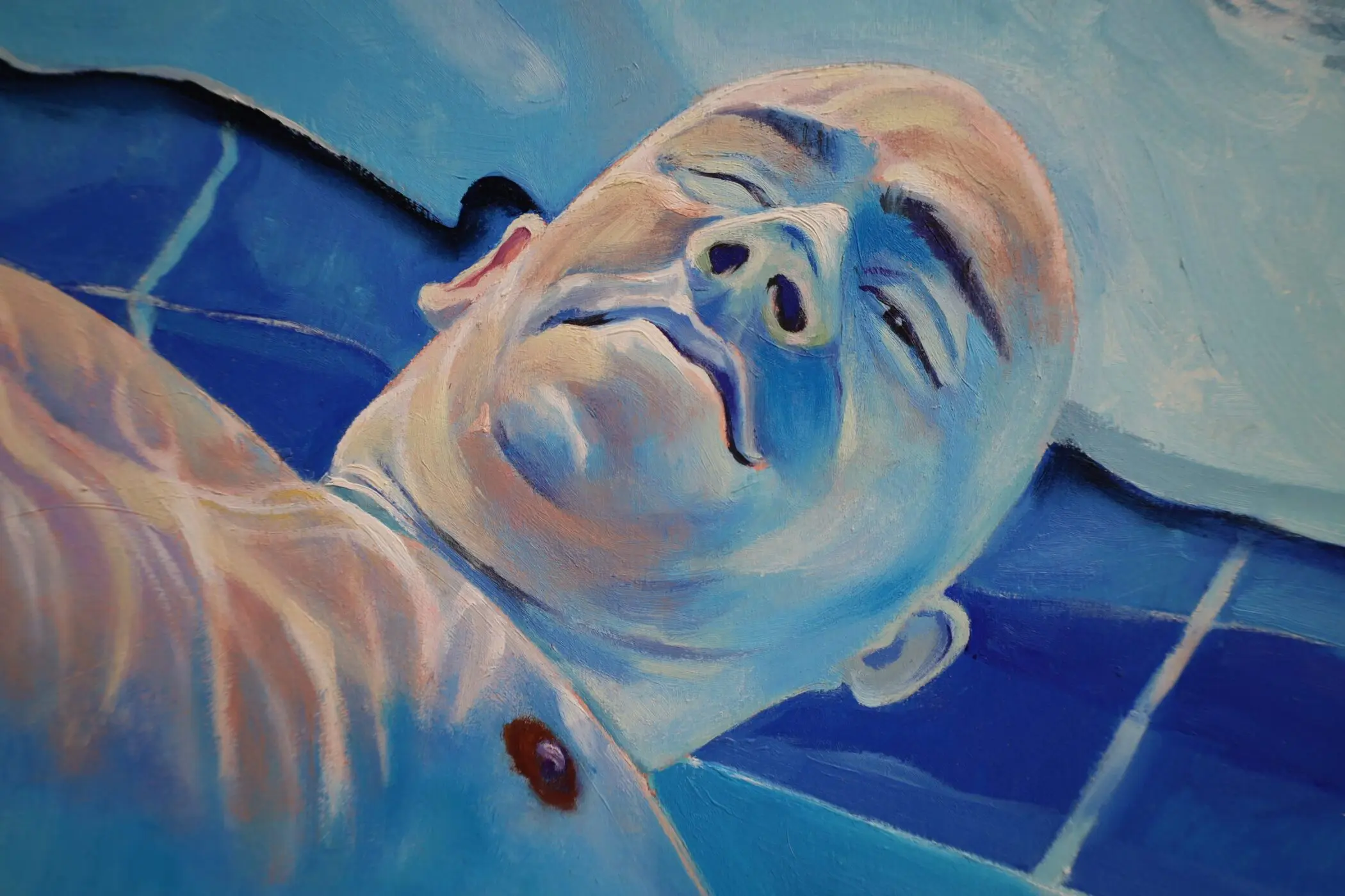 Jester’s masterful handling of water’s refractive properties results in a composition that blurs the line between realism and surrealism. The pool tiles, fractured by rippling light, create an optical illusion of warped geometry, while the reflections of trees and sky above morph into a painterly abstraction. The composition challenges the viewer’s sense of orientation—which figure is real, and which is a reflection? Is the submerged body reaching outward, or simply floating in passive observation?