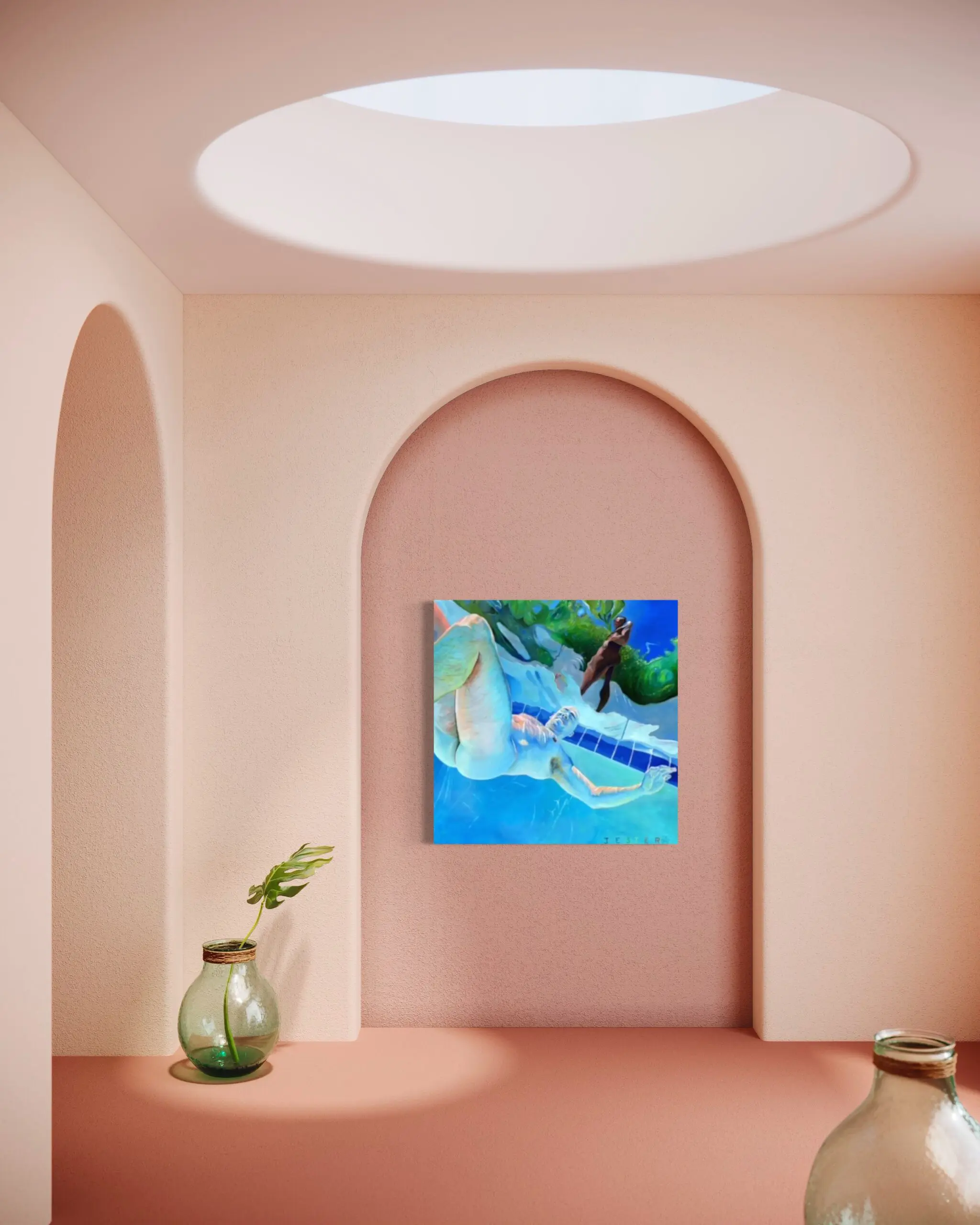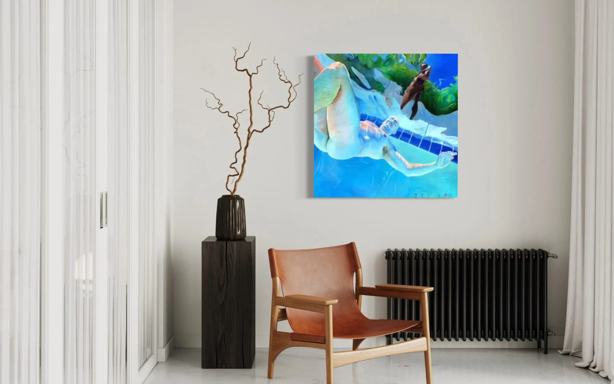With Daydream, Jester creates an experience rather than just an image. The viewer is drawn into the painting’s ethereal liminality, caught between the clarity of the submerged body and the instability of the reflections above. A masterful interplay of physics and emotion, this work resonates as a meditation on perception, self-awareness, and the quiet mysteries hidden beneath the surface of things.