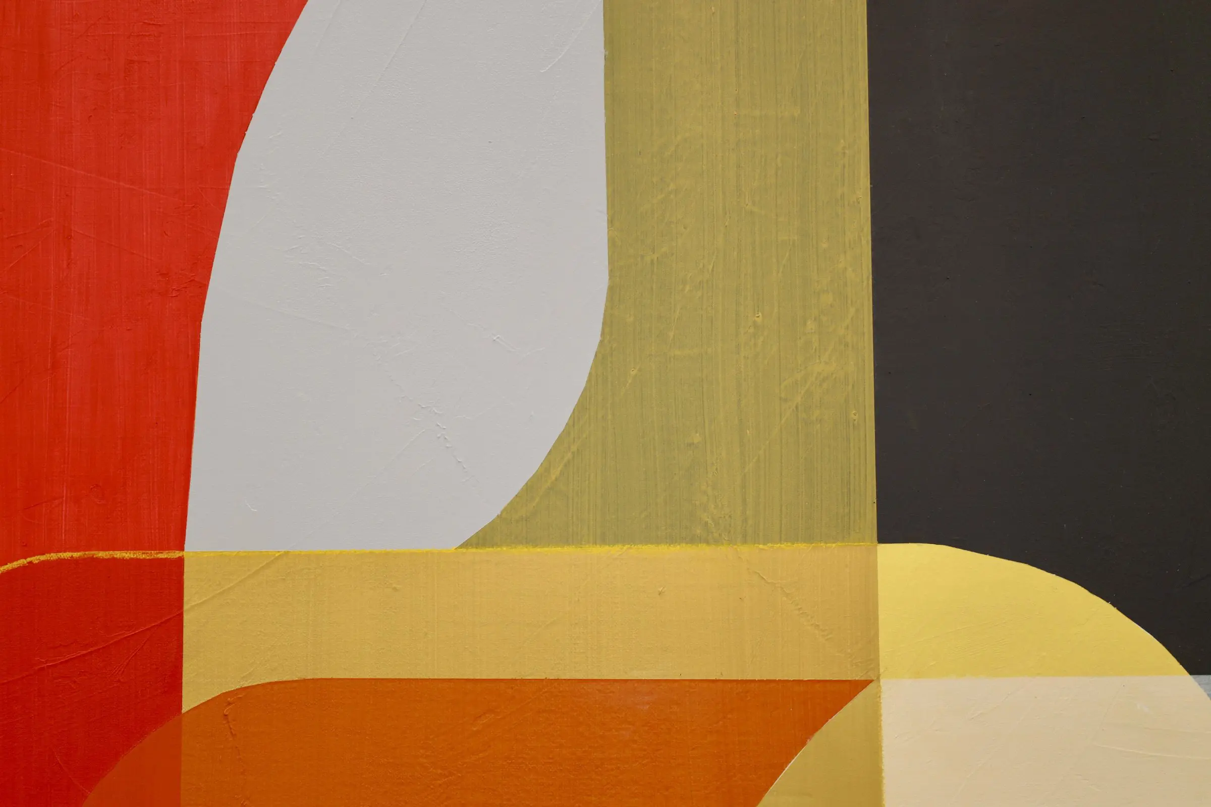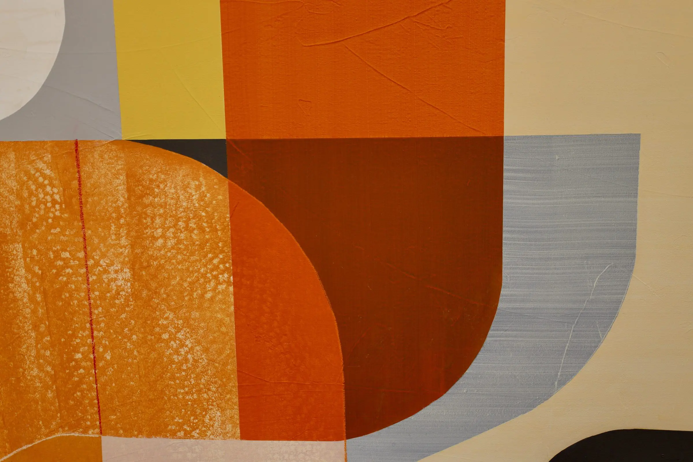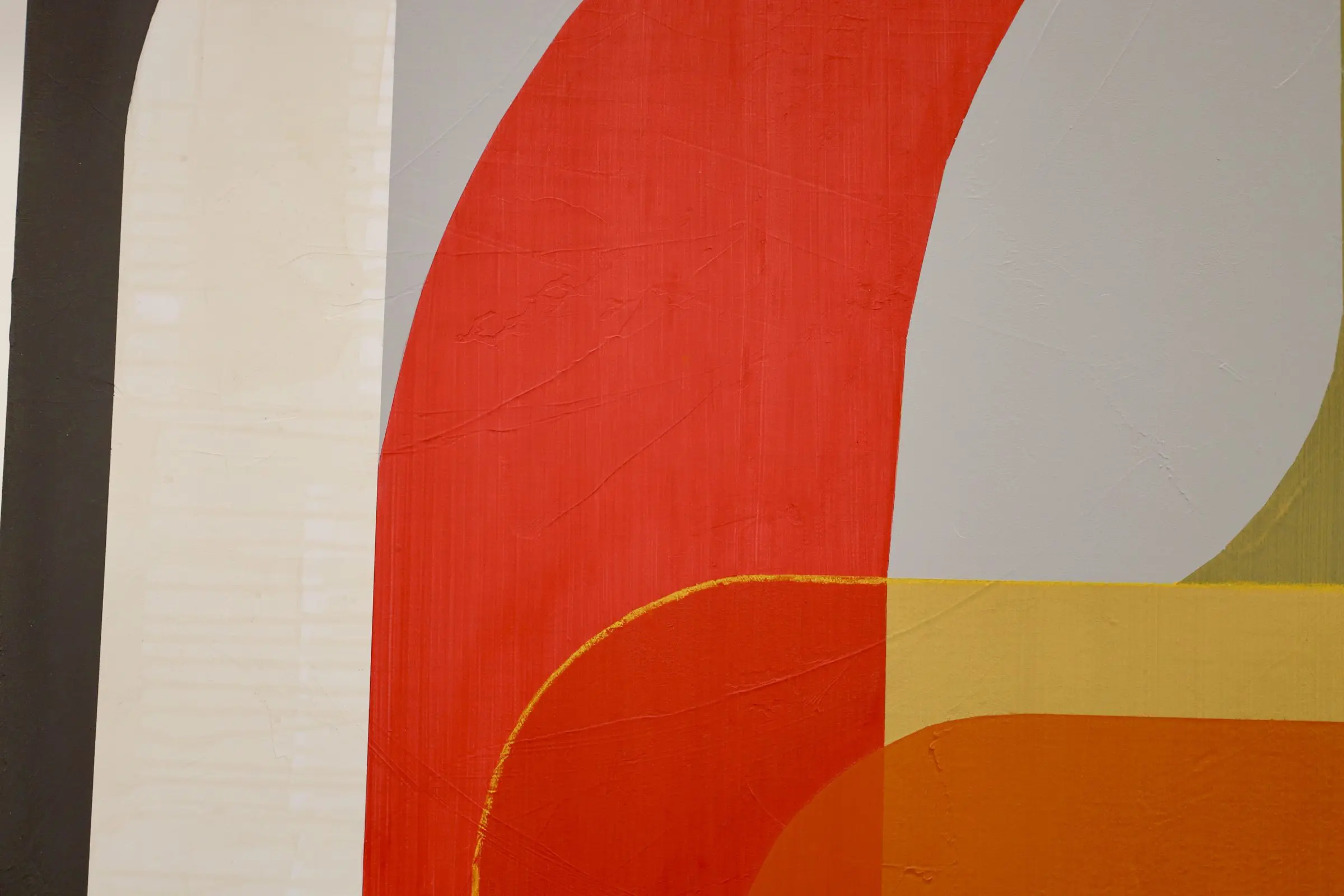 In Tricia Strickfaden’s painting, a fusion of abstraction and color unfolds before the viewer. With a nuanced understanding of mid-century modernist design principles and a mastery of color theory, Strickfaden orchestrates a composition that achieves a unique form of abstraction – one that is both easily approachable and expertly executed, showcasing a balance between accessibility and informed artistic craftsmanship.