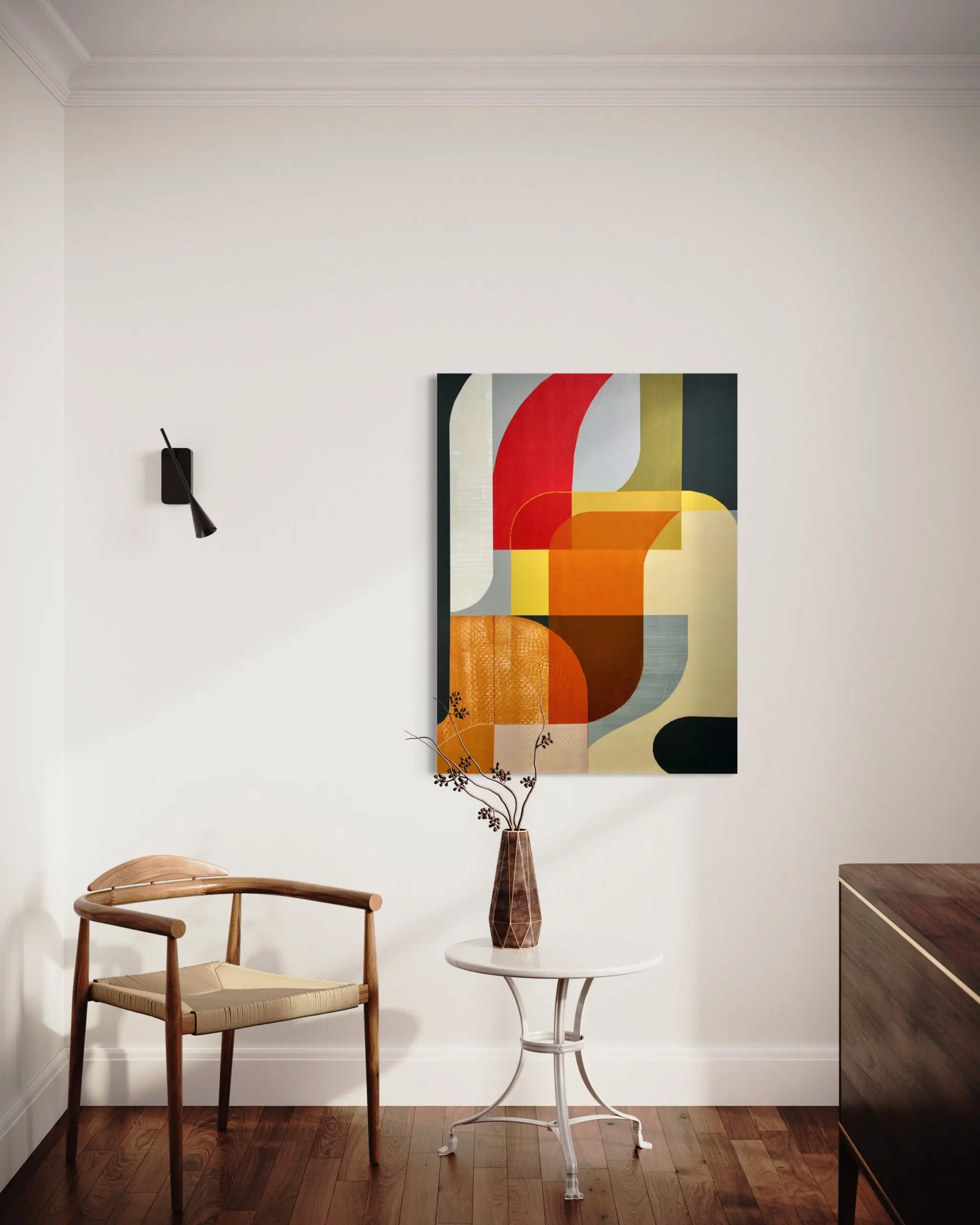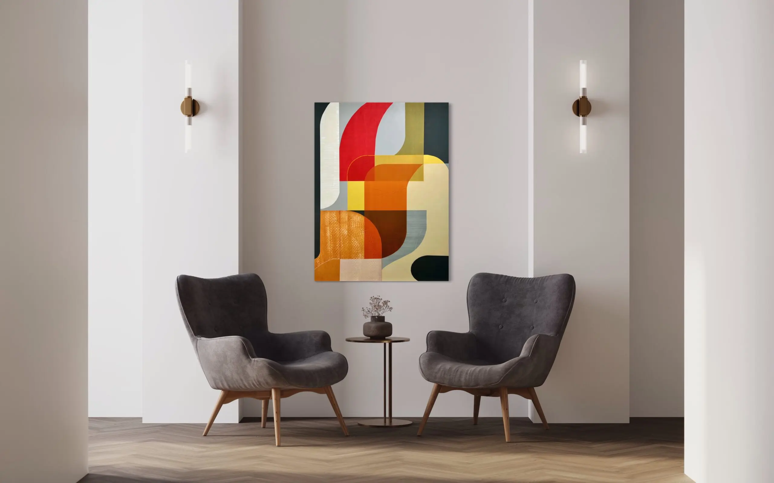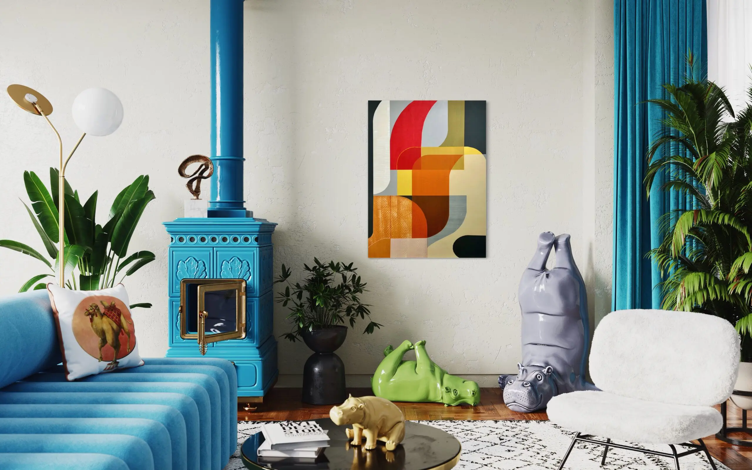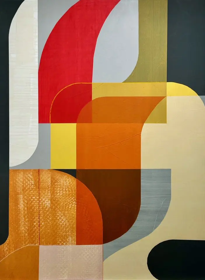 In Tricia Strickfaden’s painting, a fusion of abstraction and color unfolds before the viewer. With a nuanced understanding of mid-century modernist design principles and a mastery of color theory, Strickfaden orchestrates a composition that achieves a unique form of abstraction – one that is both easily approachable and expertly executed, showcasing a balance between accessibility and informed artistic craftsmanship.