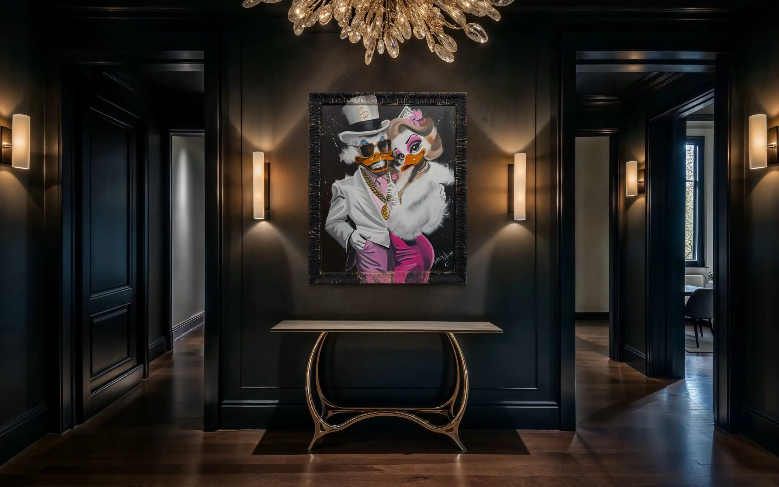 In this vibrant work of pop surrealism, two iconic cartoon duck figures are transformed into a lavish, fashion-forward power couple, dripping in excess, attitude, and glamour. On the right, we meet the female figure styled as Marilyn Monroe reimagined — a sultry, fur-draped diva with dramatic lashes, vintage curls, and a candy-pink aesthetic. She’s not just a cartoon—she’s an icon reborn through the lens of luxury pop art.