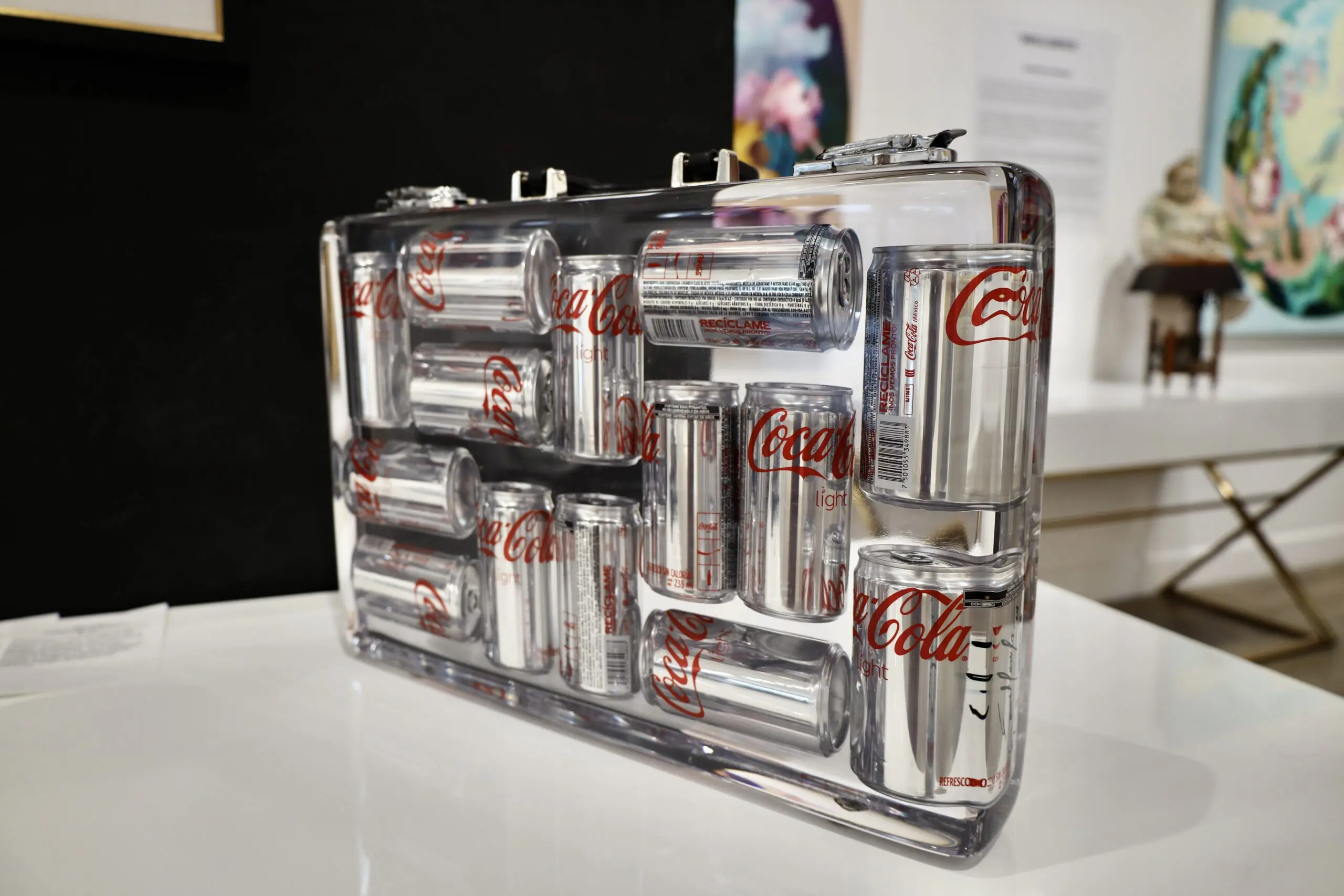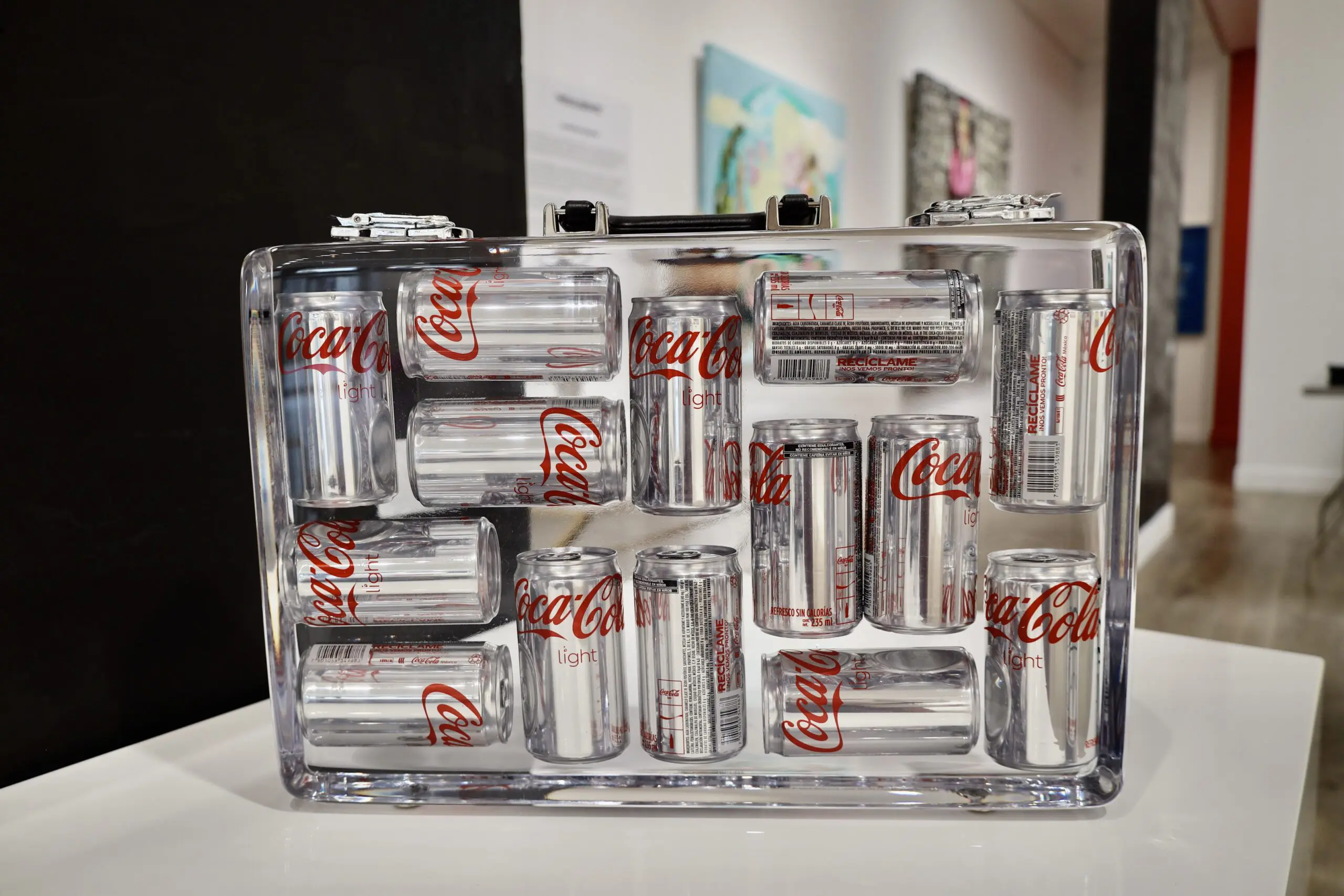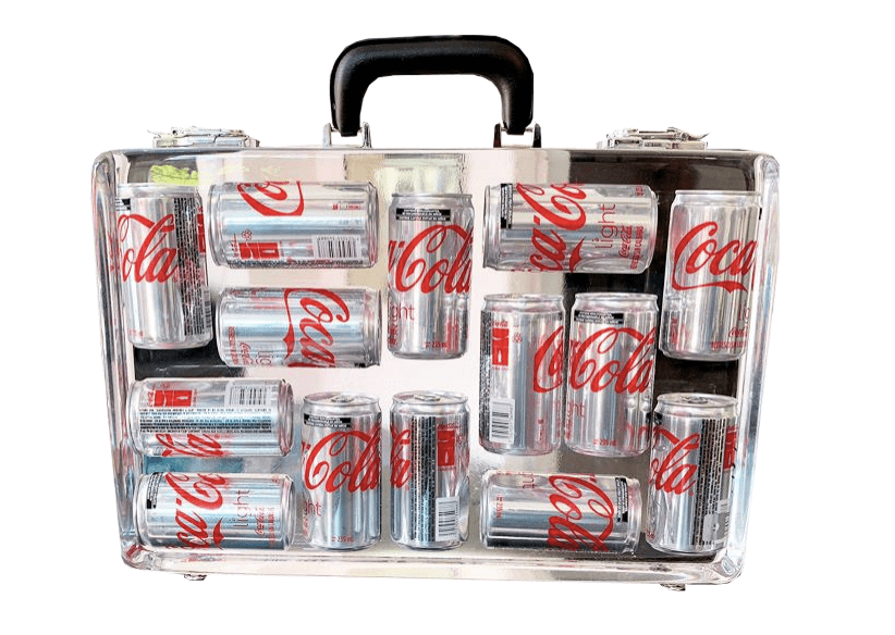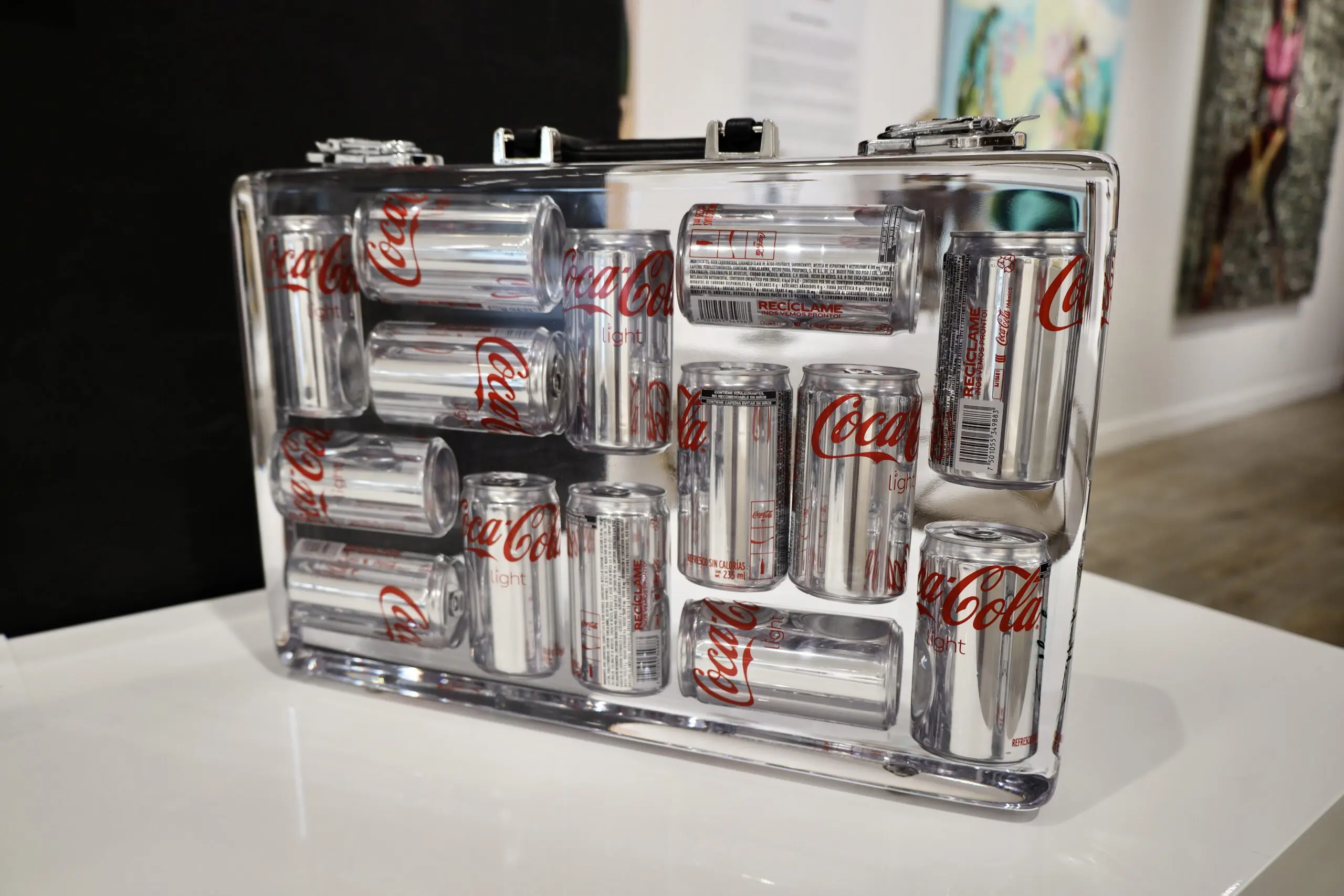 In this piece, a resin briefcase is transformed into a thought-provoking tableau featuring cans of diet Coke arranged meticulously to create a floating effect. The artist,intentionally plays with the viewer’s desires and temptations by presenting this display in a humorous manner.