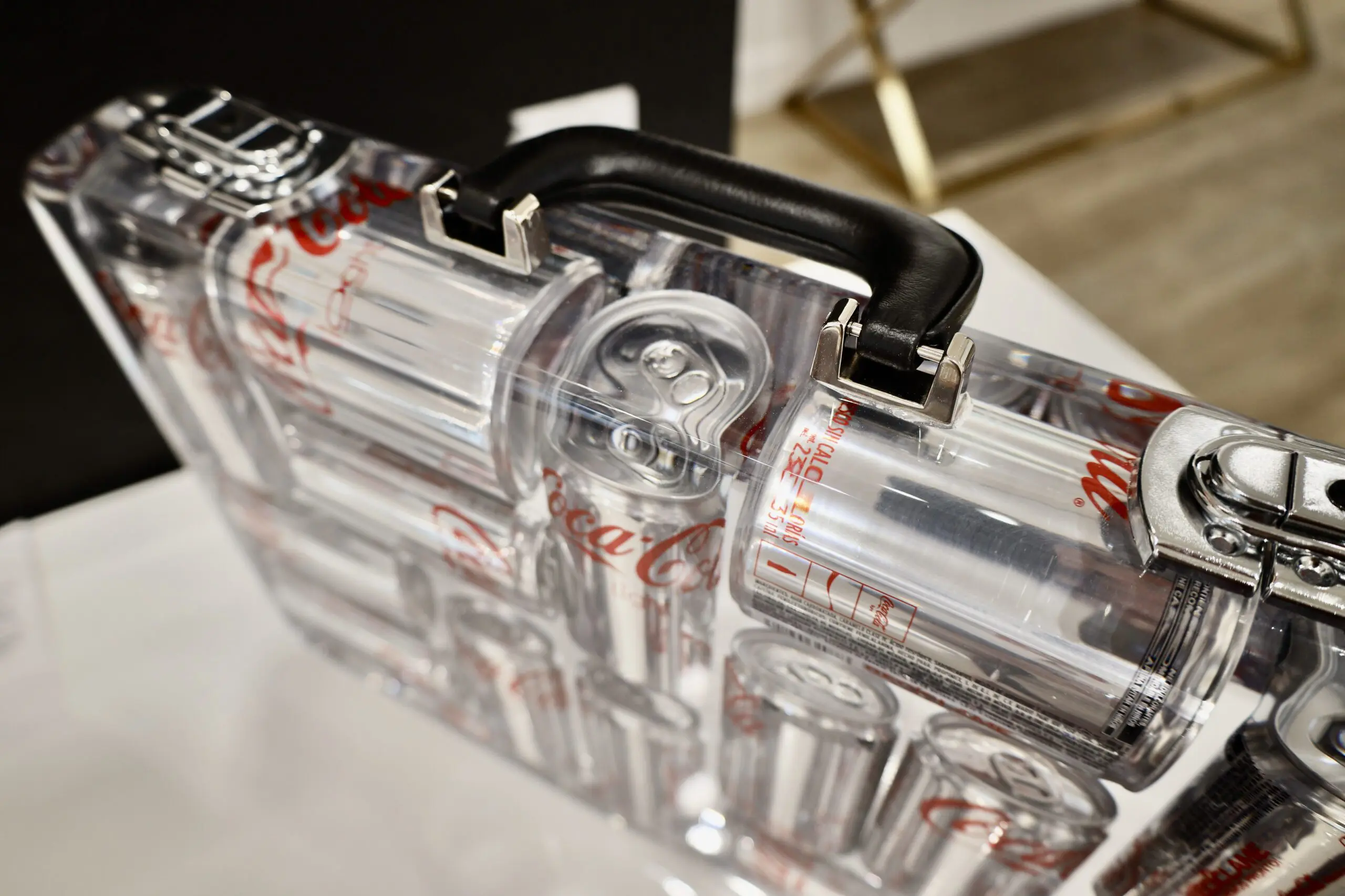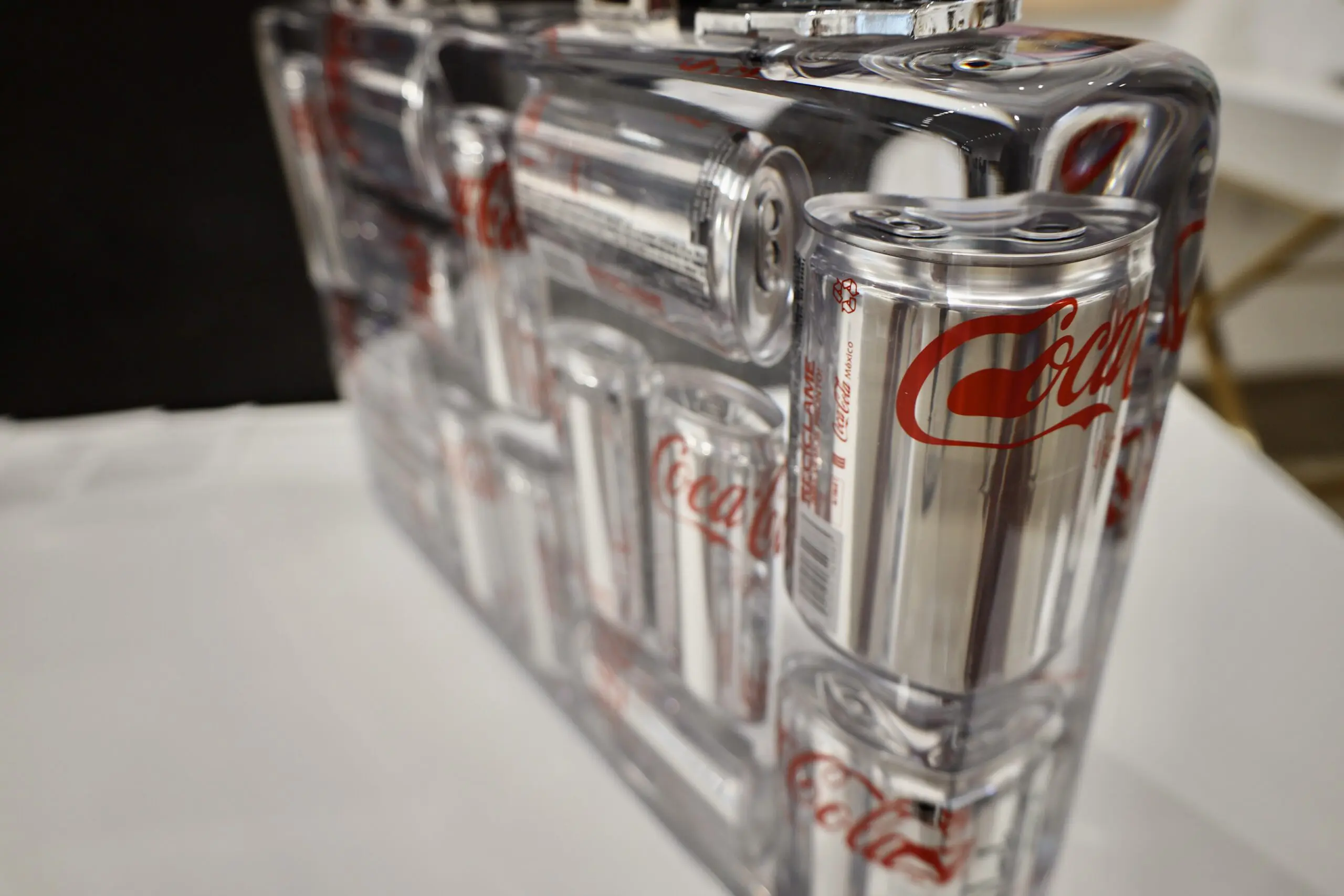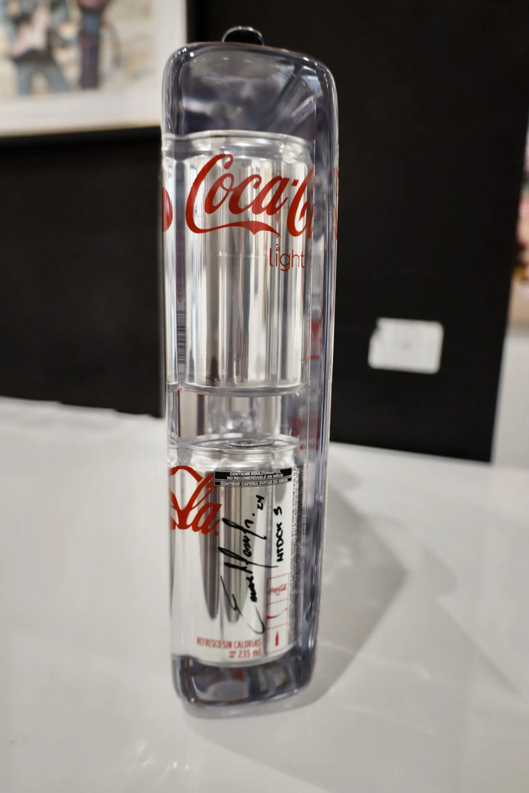In this piece, a resin briefcase is transformed into a thought-provoking tableau featuring cans of diet Coke arranged meticulously to create a floating effect. The artist,intentionally plays with the viewer’s desires and temptations by presenting this display in a humorous manner.