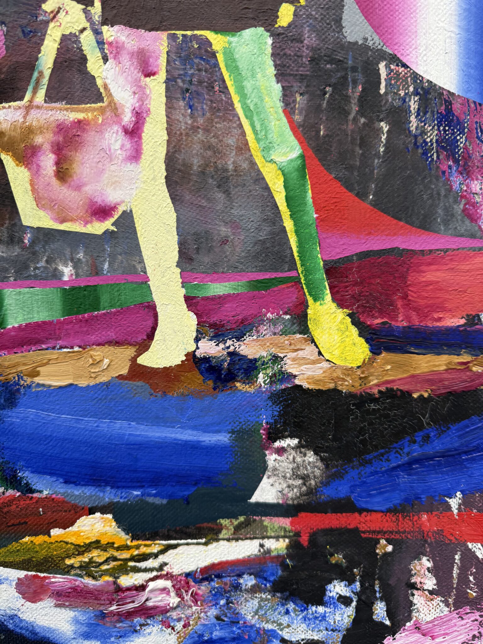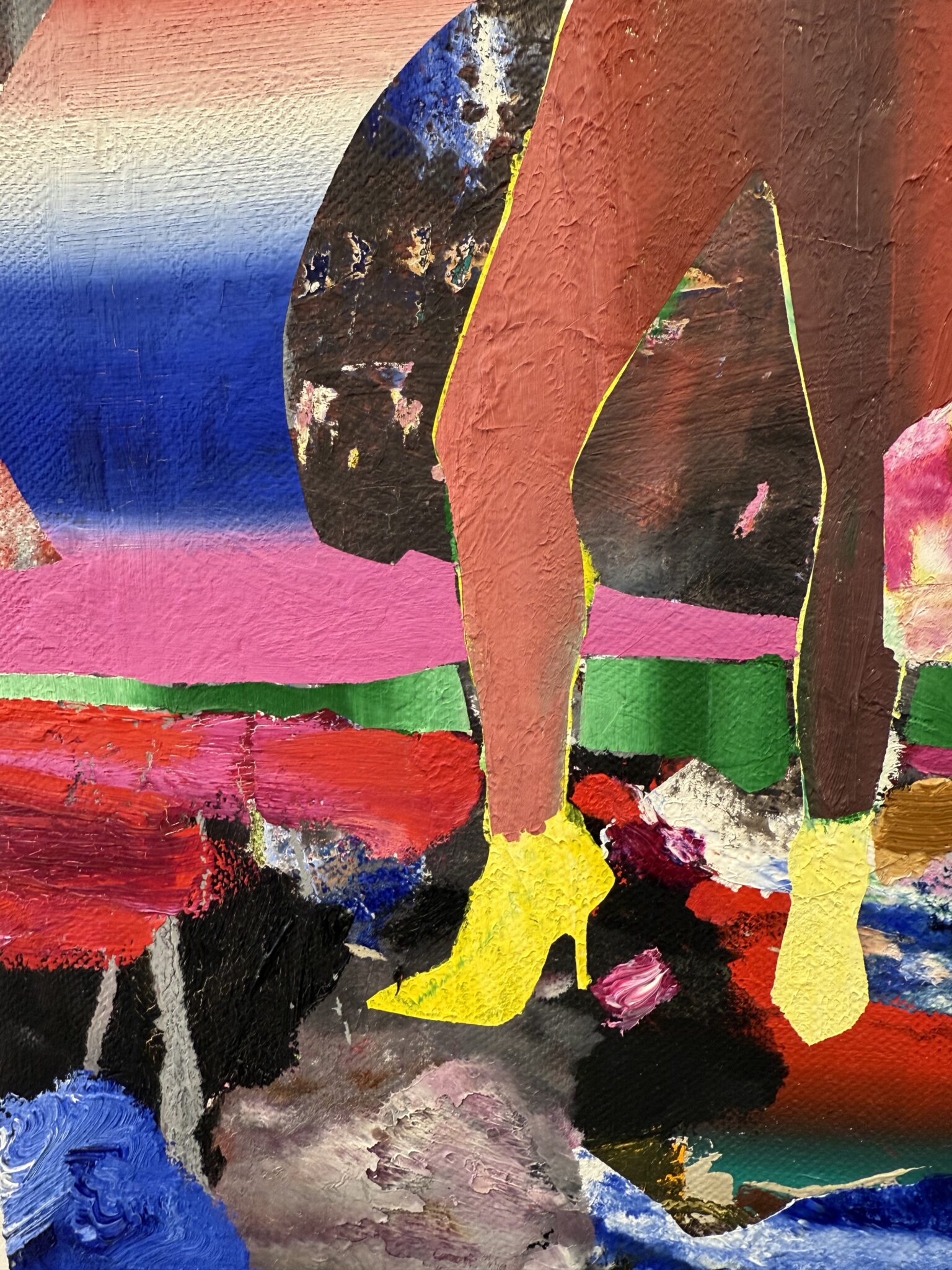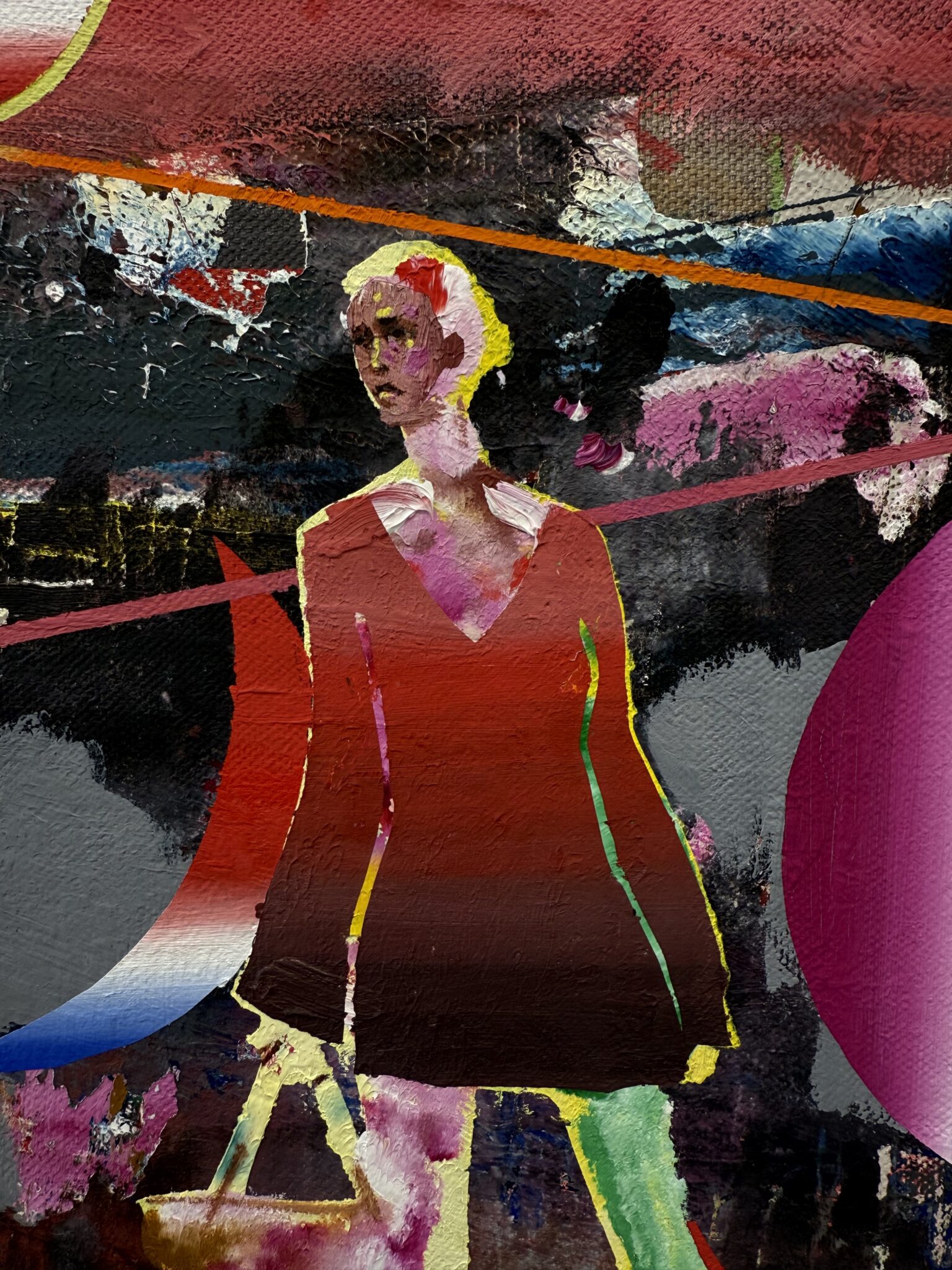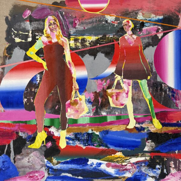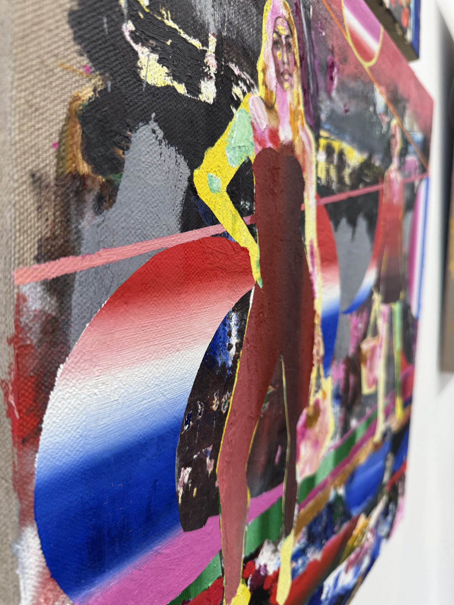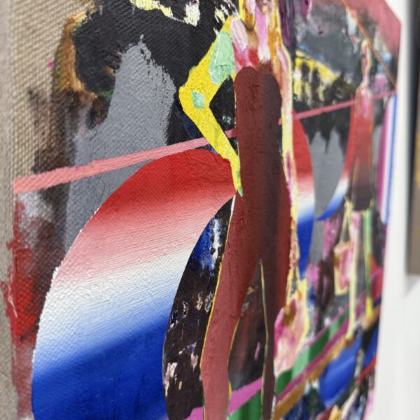 “Disintegrate My Blue Skies” by Justin Price explores the push and pull between melancholy and joy through layered abstraction and figurative detail. The composition features two women whose faces are painted with realistic precision, while their bodies dissolve into a vivid patchwork of color. Surrounding them, the textured background exists on the same visual plane—blurring the boundary between figure and space—its dense layering creating a sense of depth, movement, and emotional complexity.