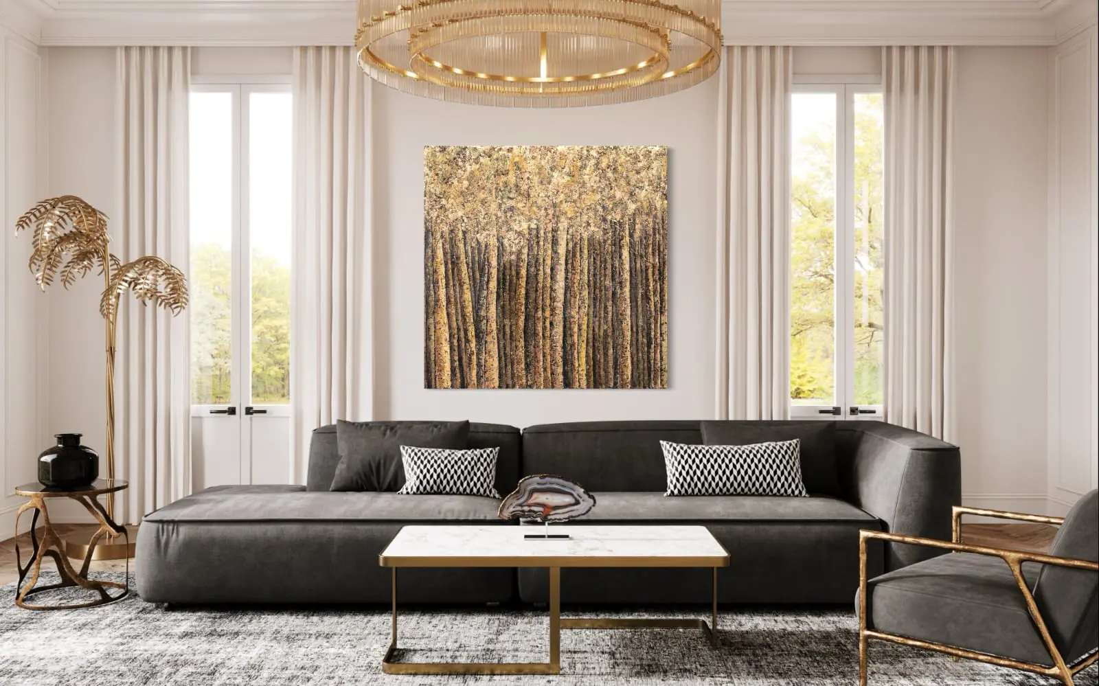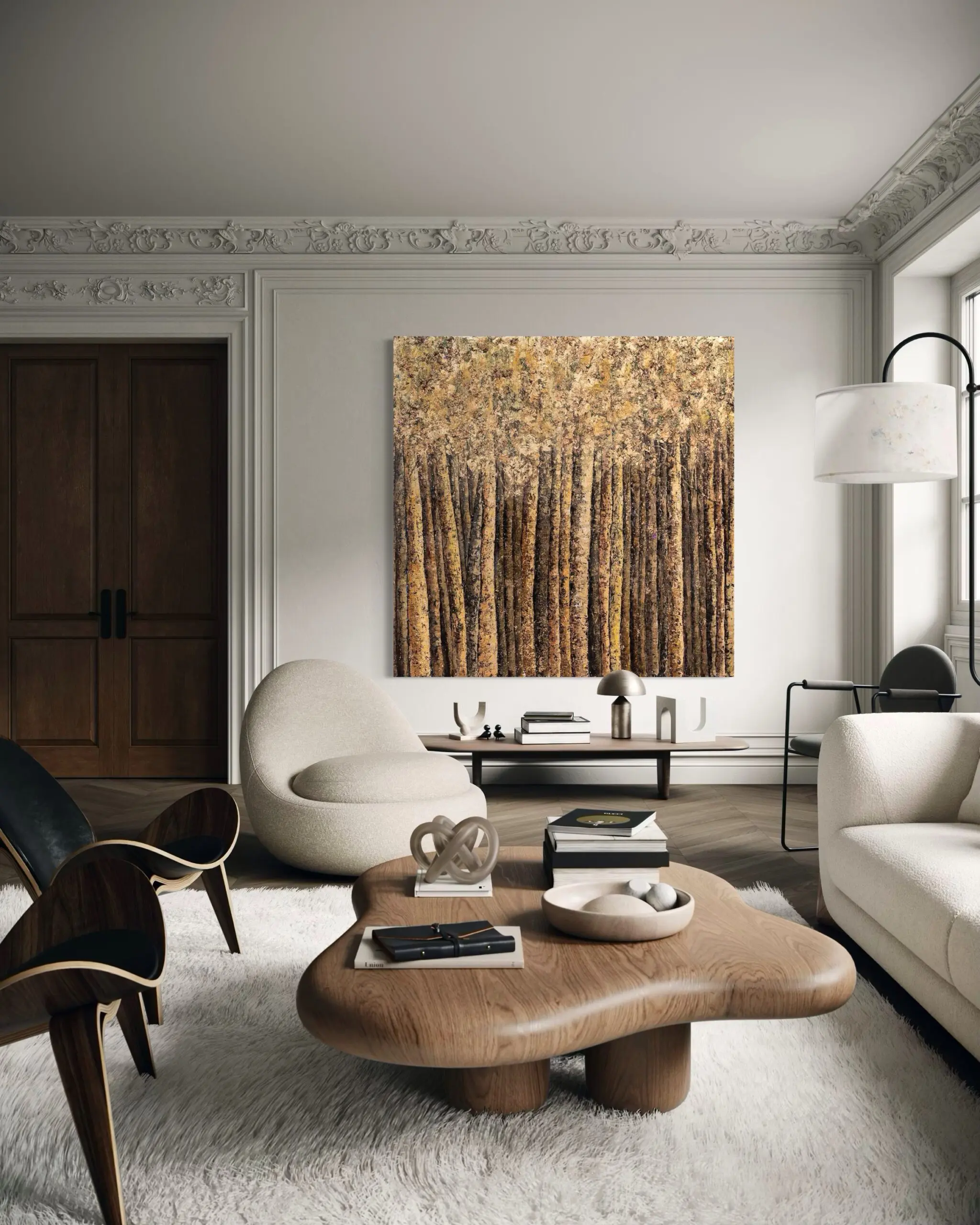 The painting’s surface is thick with materiality, its sculptural impasto layers reinforcing the organic essence of the scene. The trees, though steadfast in form, dissolve into a shimmering expanse of golden hues, evoking the fleeting beauty of autumn’s transition. The artist’s palette—a harmonious fusion of ochres, deep browns, and metallic golds—suggests an alchemical transformation, where the forest transcends the physical realm, becoming a space imbued with memory and mysticism.