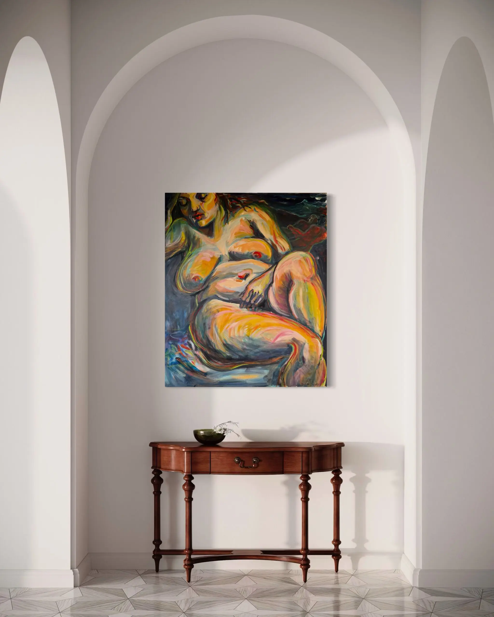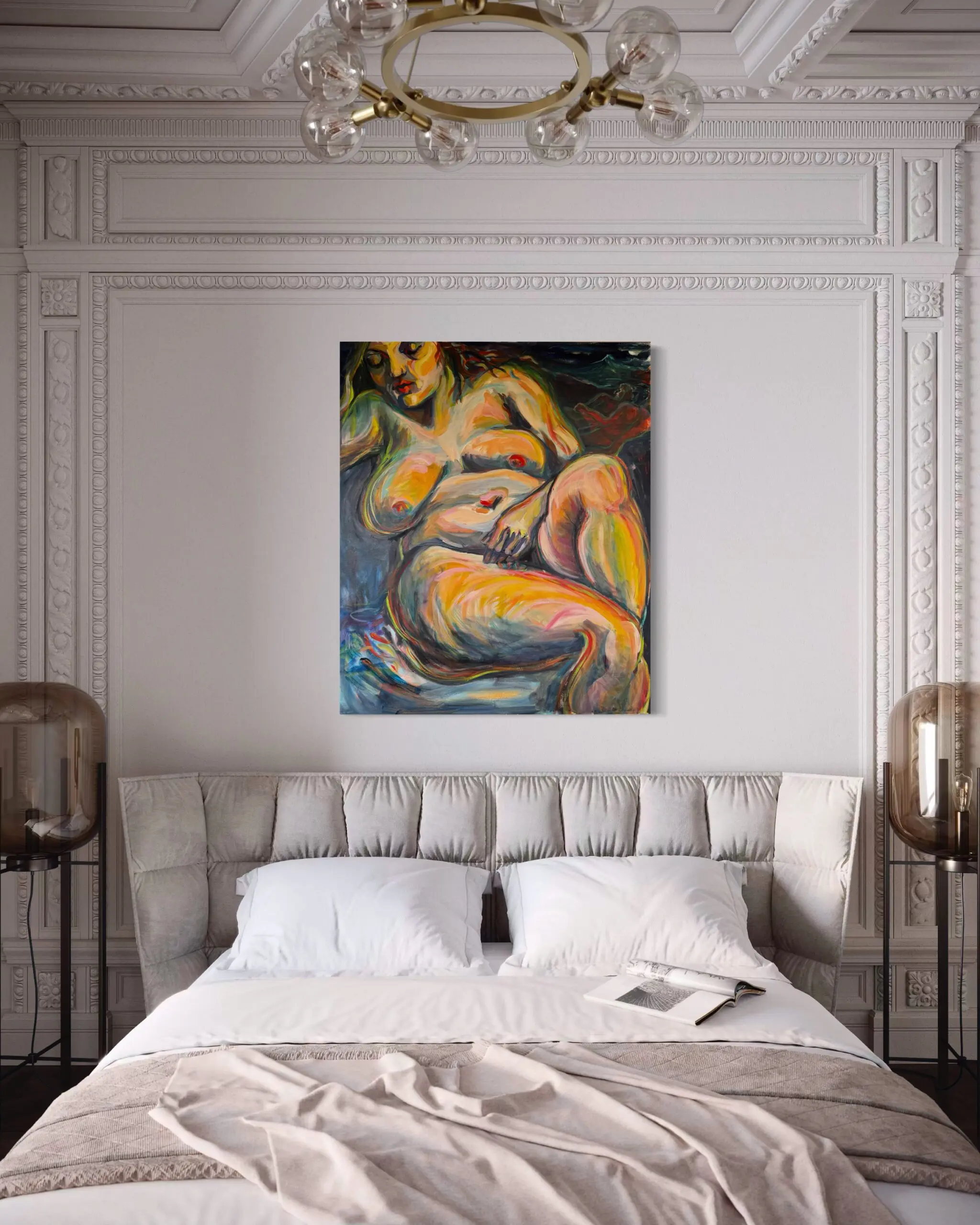 “Dreaming” is a masterful exploration of the female form, fusing expressionist brushwork, bold color contrasts, and emotive depth into a singular, striking composition. This evocative artwork captures the sensuality and psychological intensity of a reclining figure, its contours carved through sweeping, gestural strokes. The dynamic play of warm oranges, yellows, and pinks against cool blues and deep shadows amplifies the tension between light and form, creating an electrifying energy within the composition.