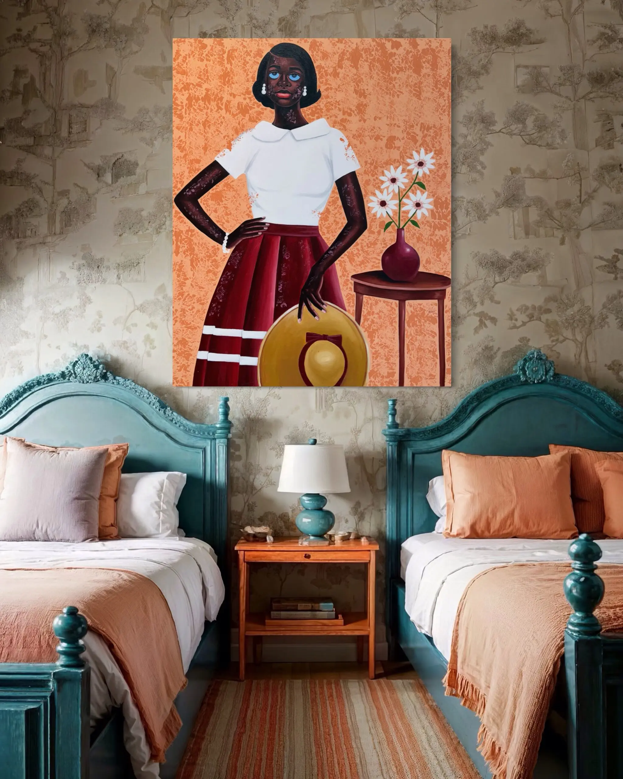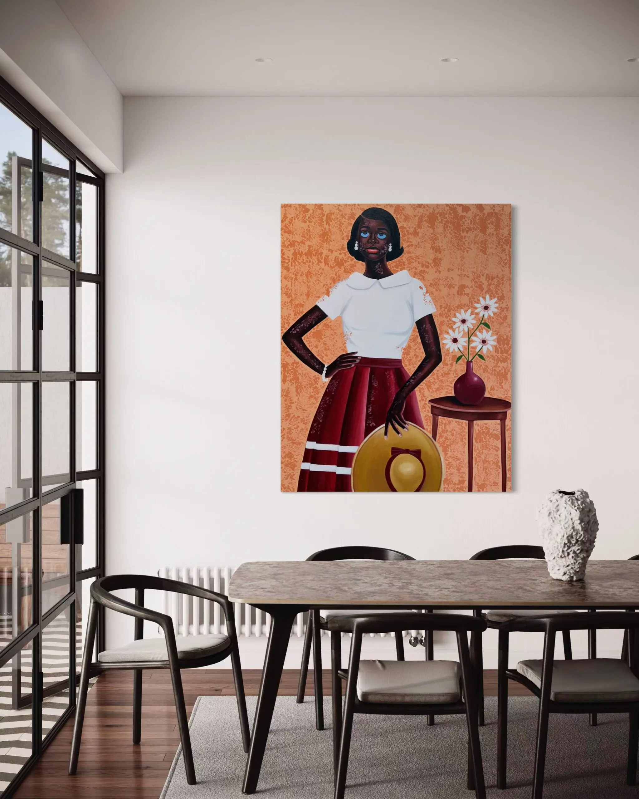 A poised woman stands with one hand on her hip, radiating elegance and quiet strength. She is dressed in a crisp white blouse paired with a deep red skirt, while a wide-brimmed golden hat rests gracefully at her side. Her piercing blue eyes, rendered in Letsu signature style, immediately captivate the viewer, suggesting both resilience and vulnerability. To her right, a wooden table holds a red vase filled with white flowers, a delicate detail that softens the composition and adds symbolic resonance of femininity and renewal. The warm terracotta background, textured with subtle patterns, frames the subject in a timeless and dignified setting, allowing the figure to command presence while embodying grace.