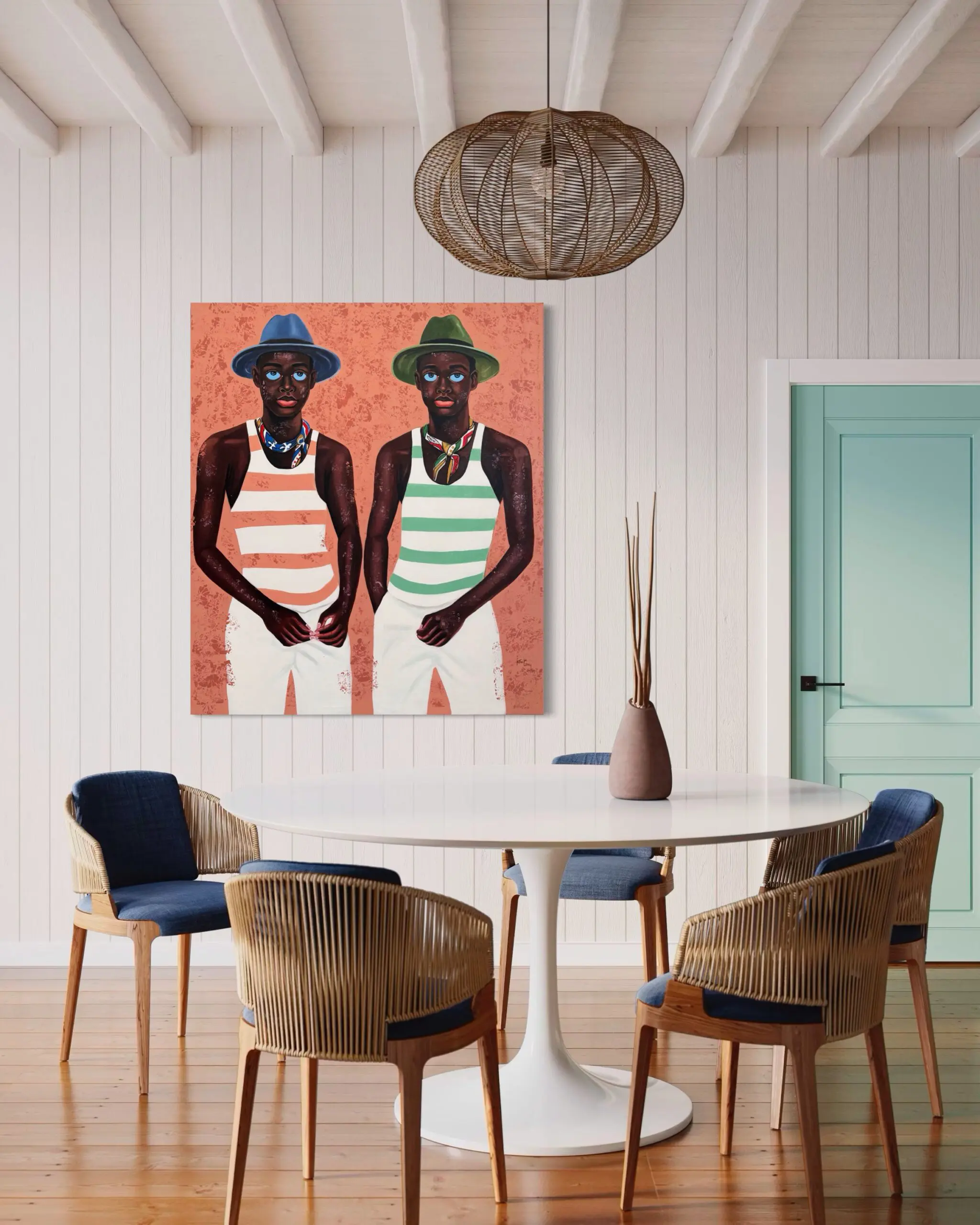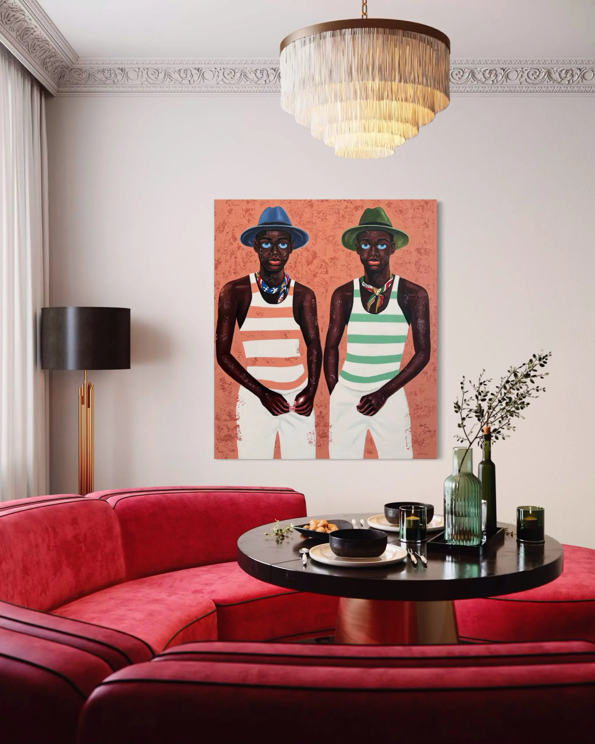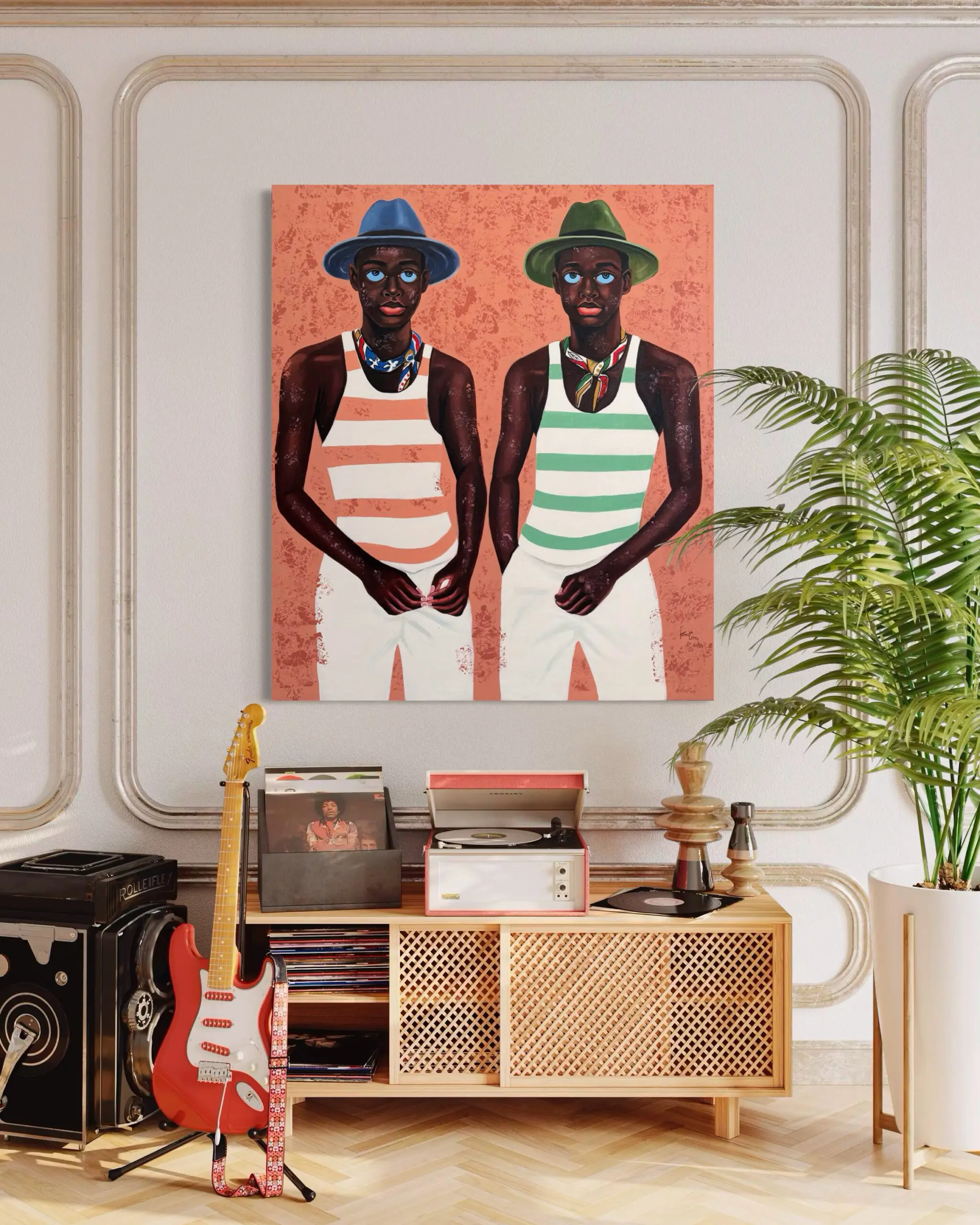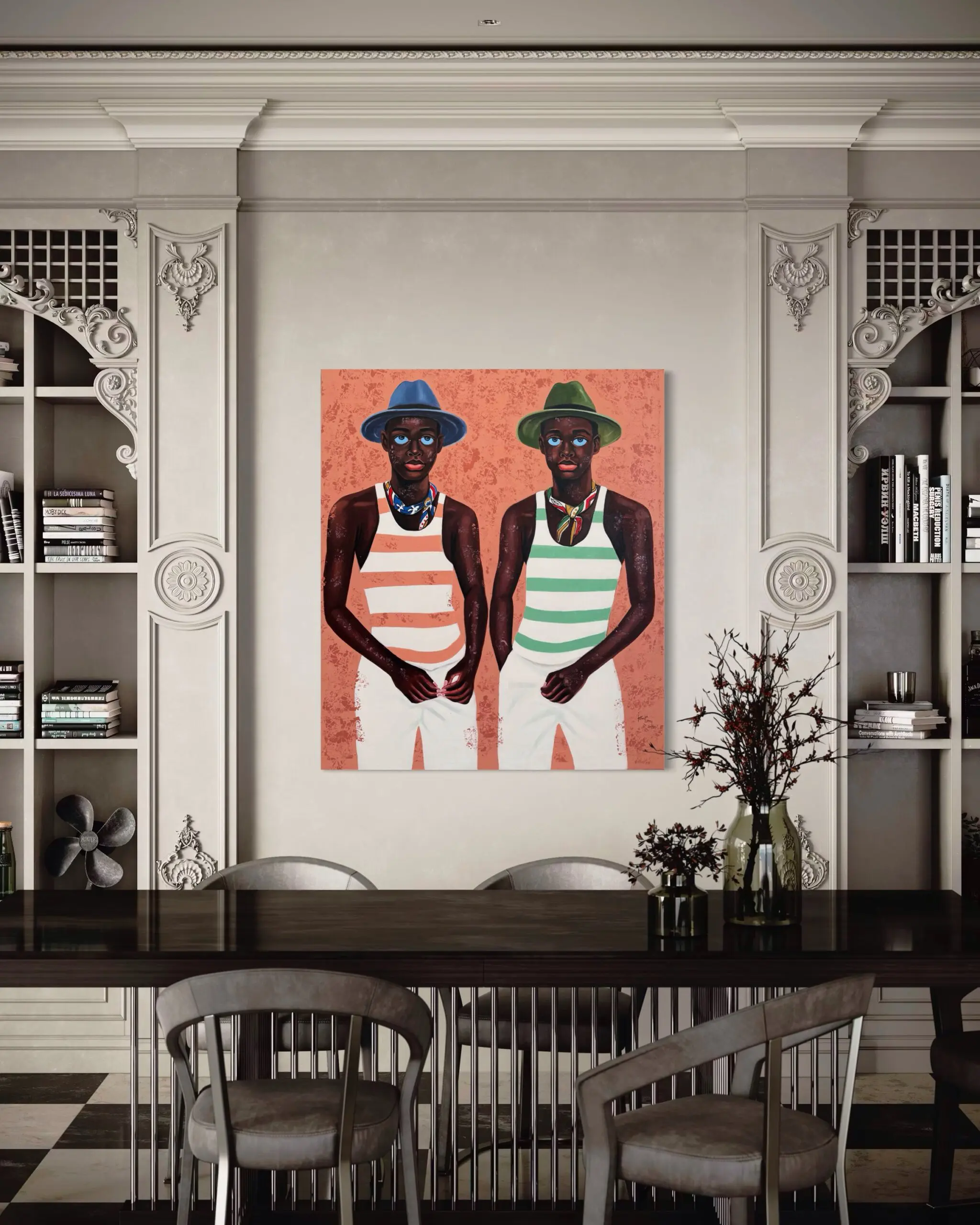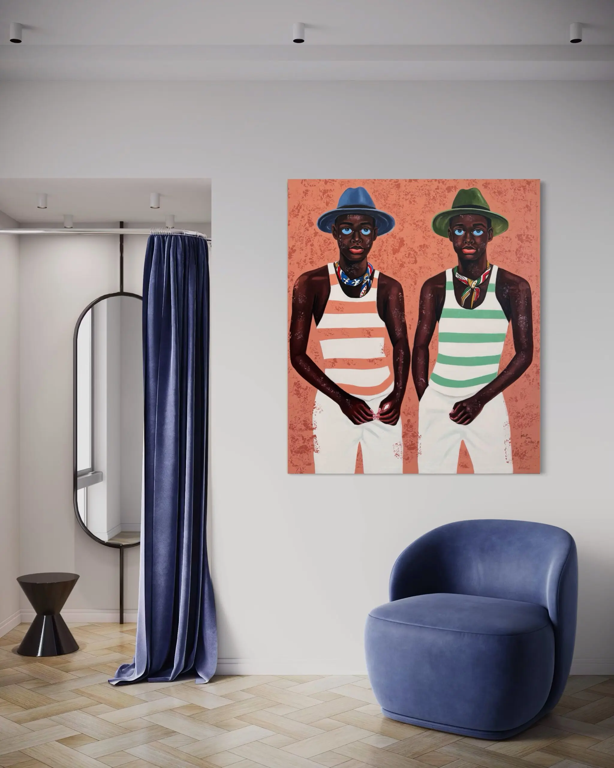 In this work, two young men stand shoulder to shoulder, their mirrored stance suggesting both kinship and individuality. Each figure is dressed in a striped shirt, accented by a patterned scarf and a vividly colored hat — one red, one green — emphasizing contrast within symmetry. Their sharply defined blue eyes pierce through the composition, creating an immediate emotional connection with the viewer. The terracotta-toned background, subtly textured with brushwork, adds warmth and grounding, placing the subjects in a space that feels timeless and monumental.