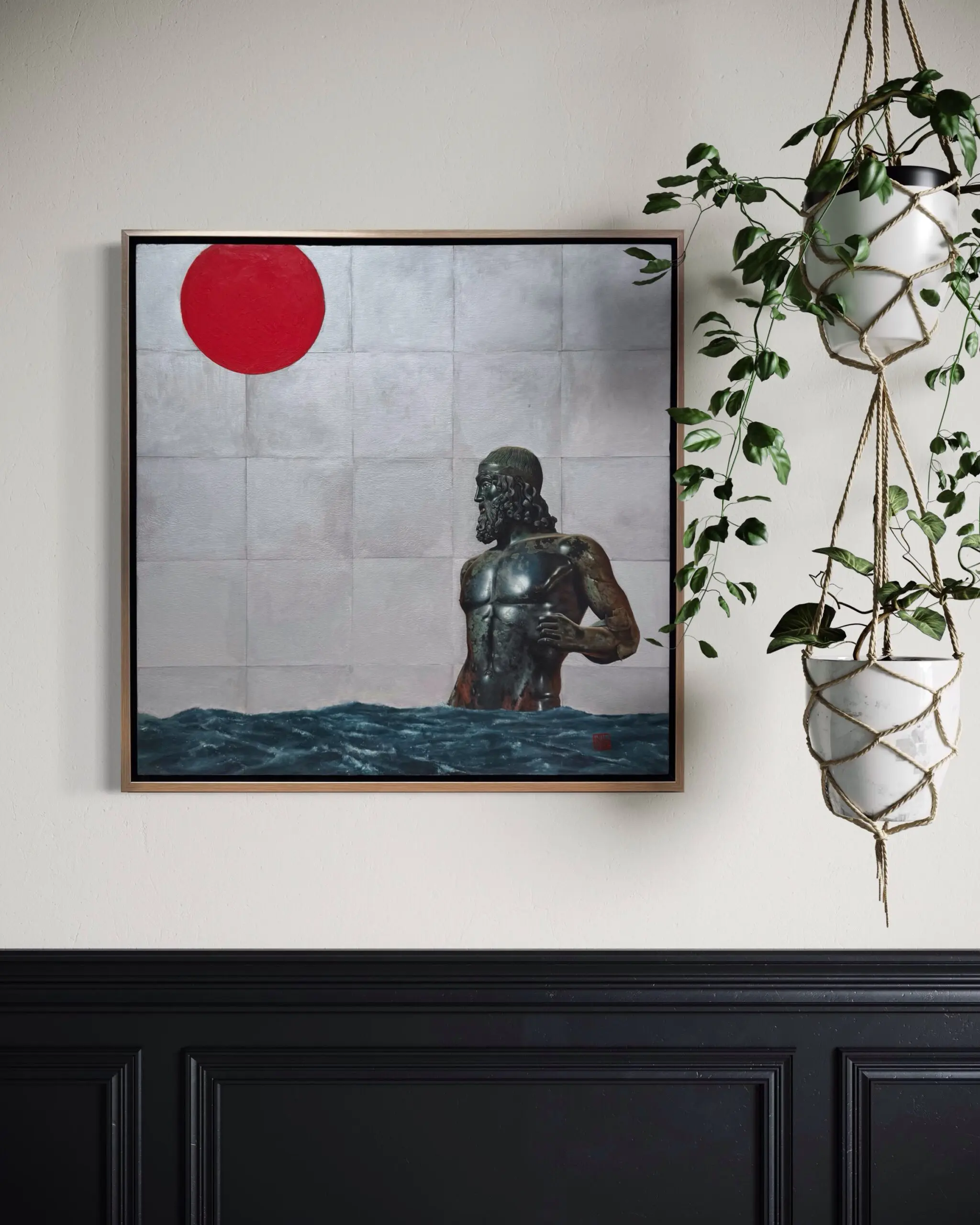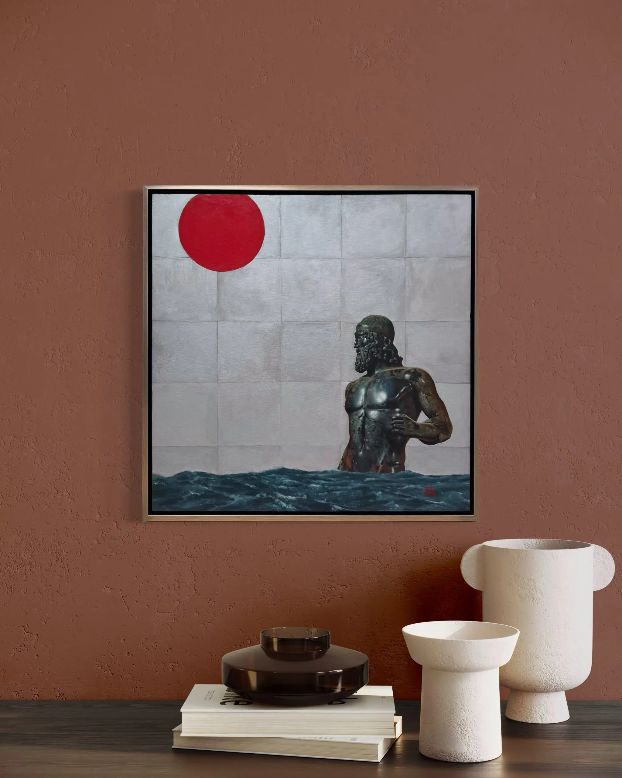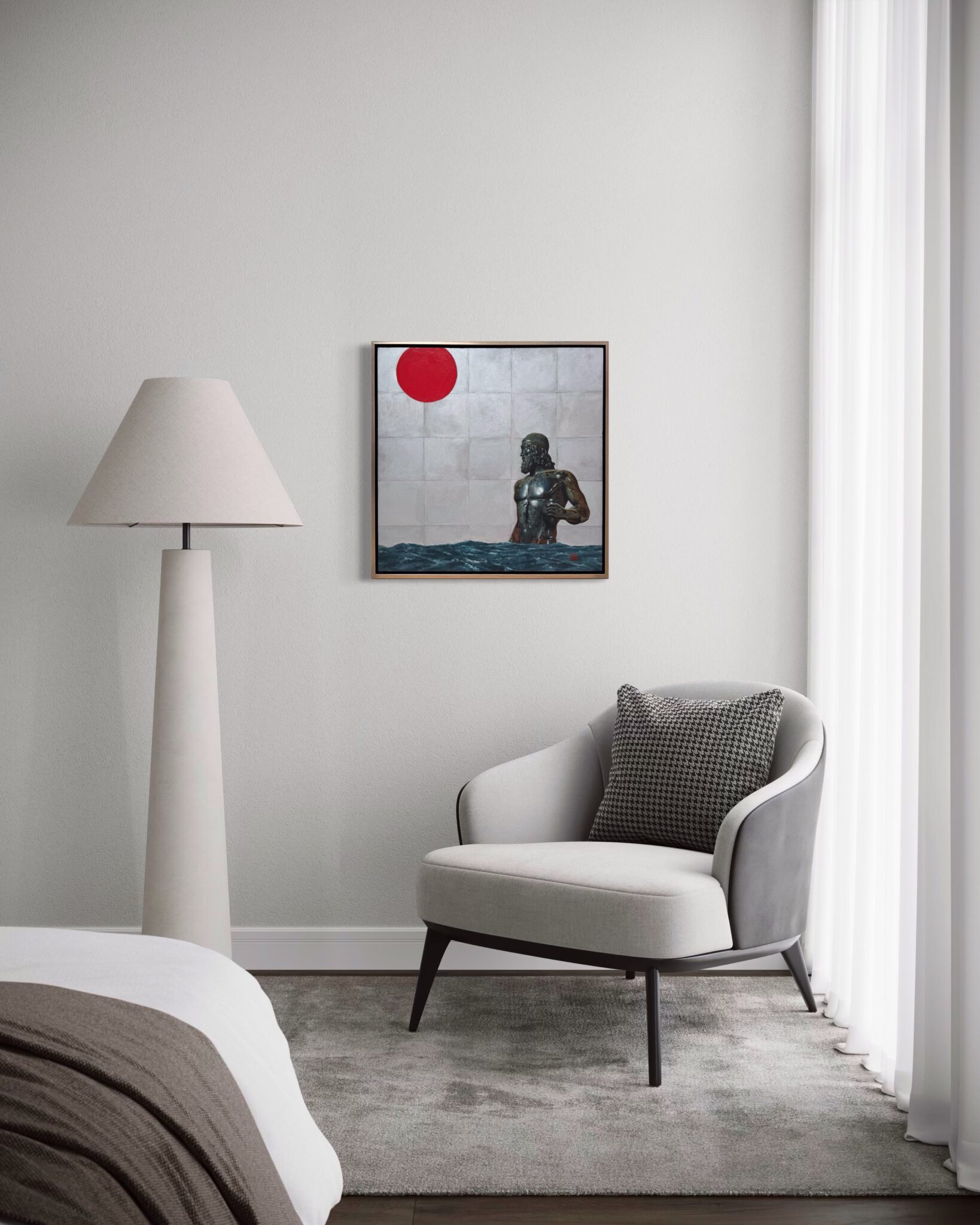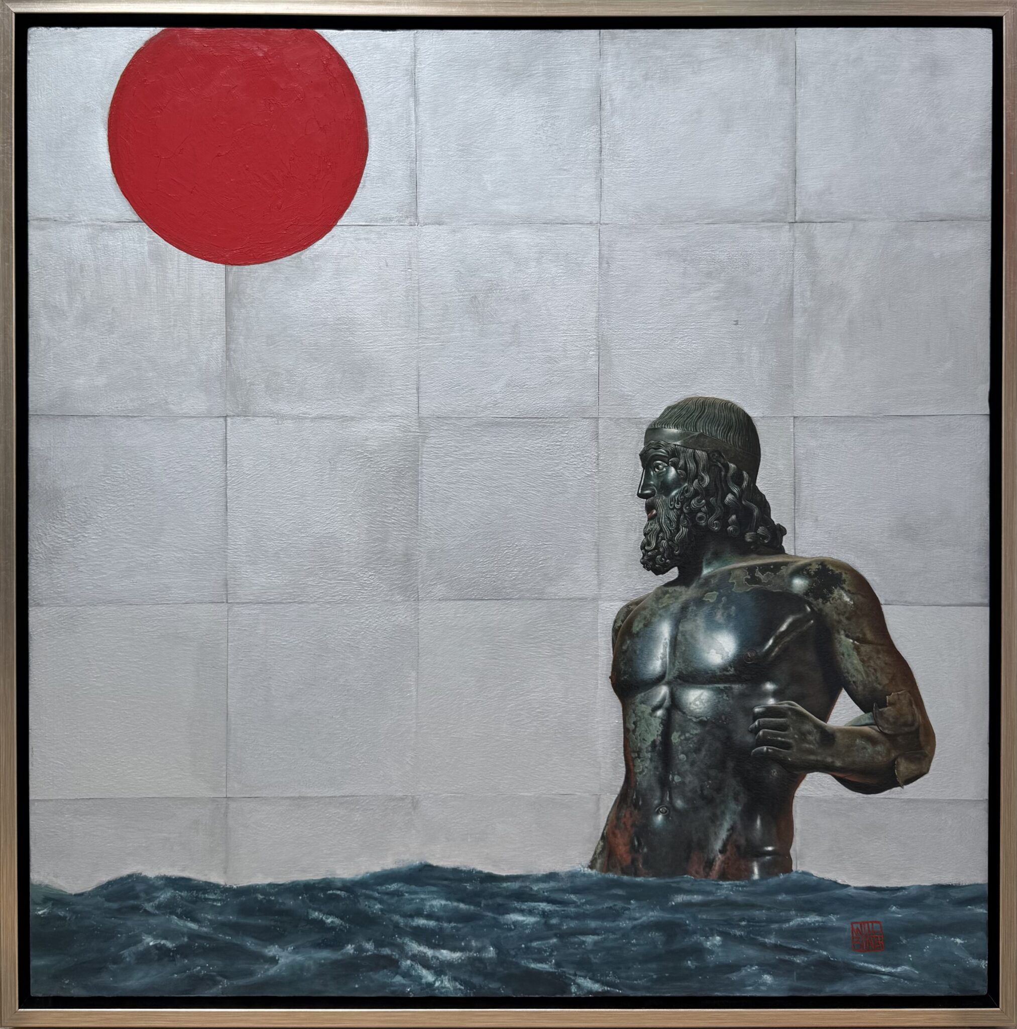 “East Meets West” by Will Binder merges ancient Greek philosophy with modern ideas, capturing a moment of timeless cultural harmony. At the center is a highly realistic depiction of an ancient Greek bronze statue, rendered with meticulous attention to detail—the patina, sculptural contours, and subtle textures of the bronze surface are brought to life with masterful precision.