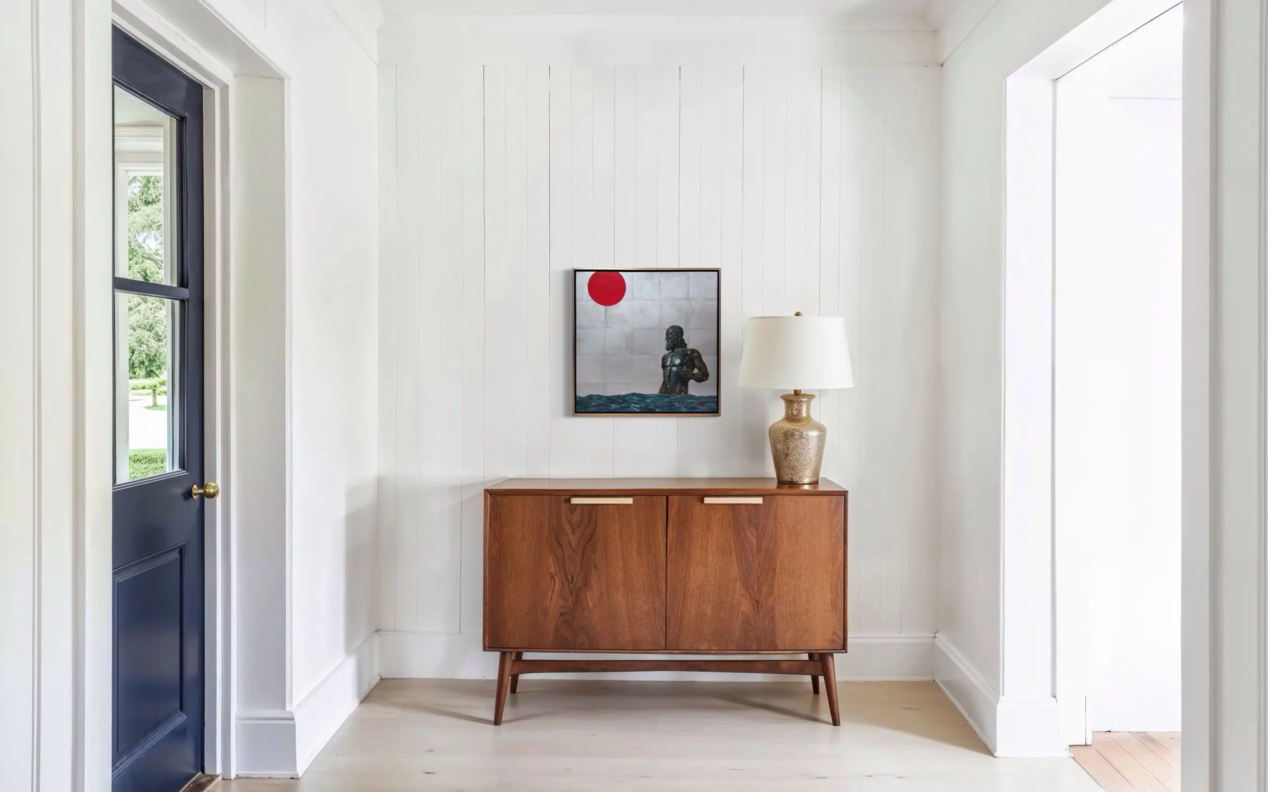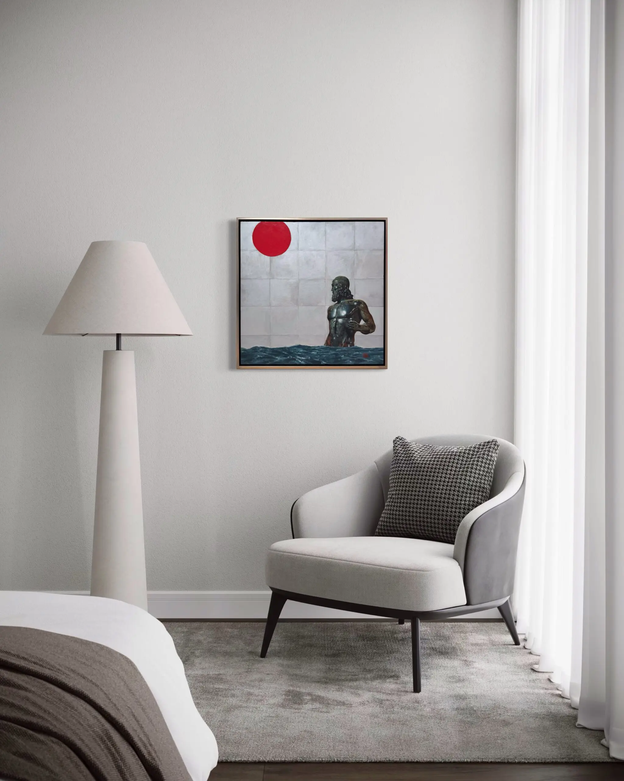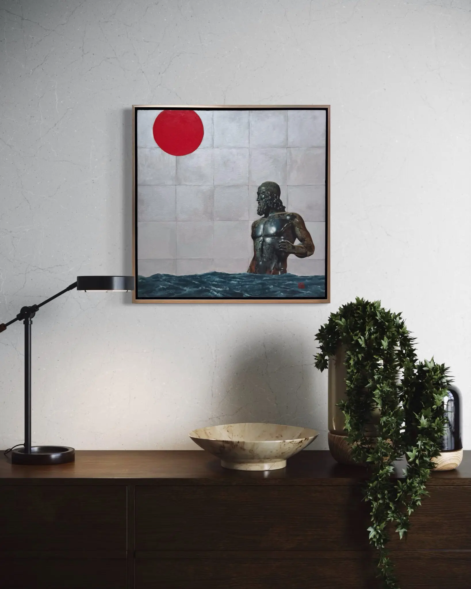 The background features a washed tile pattern, flowing ocean tides, and a bold red sun, painted in a simplified style that contrasts beautifully with the intricate realism of the statue. This contrast guides the viewer’s eye between elements, creating a balanced composition with multiple focal points and a calming visual rhythm.