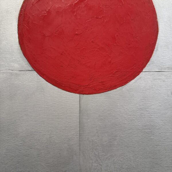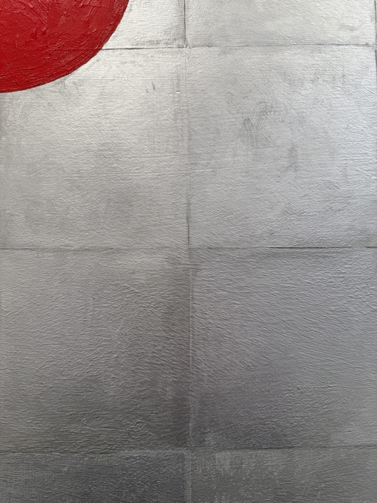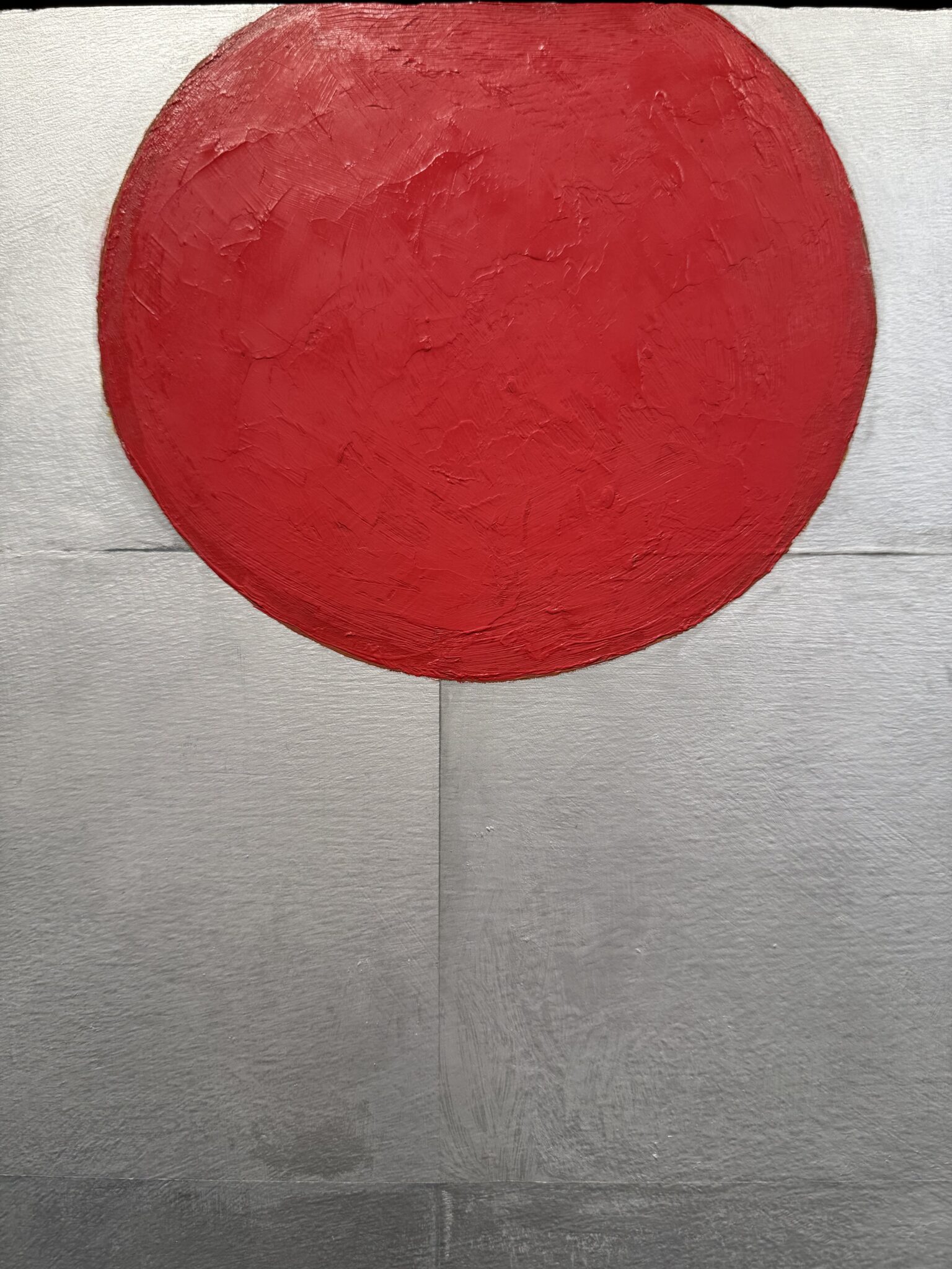 The background features a washed tile pattern, flowing ocean tides, and a bold red sun, painted in a simplified style that contrasts beautifully with the intricate realism of the statue. This contrast guides the viewer’s eye between elements, creating a balanced composition with multiple focal points and a calming visual rhythm.