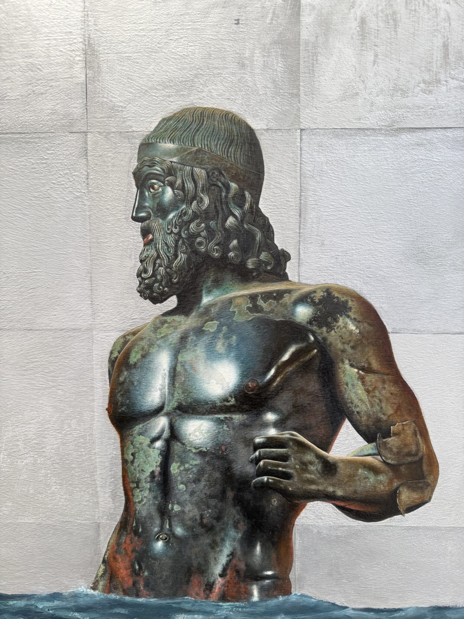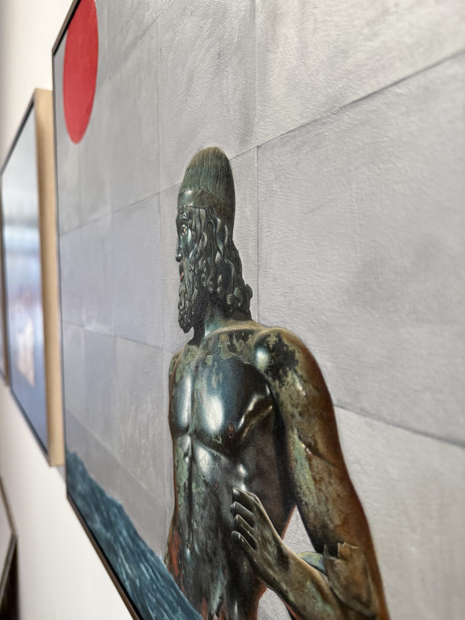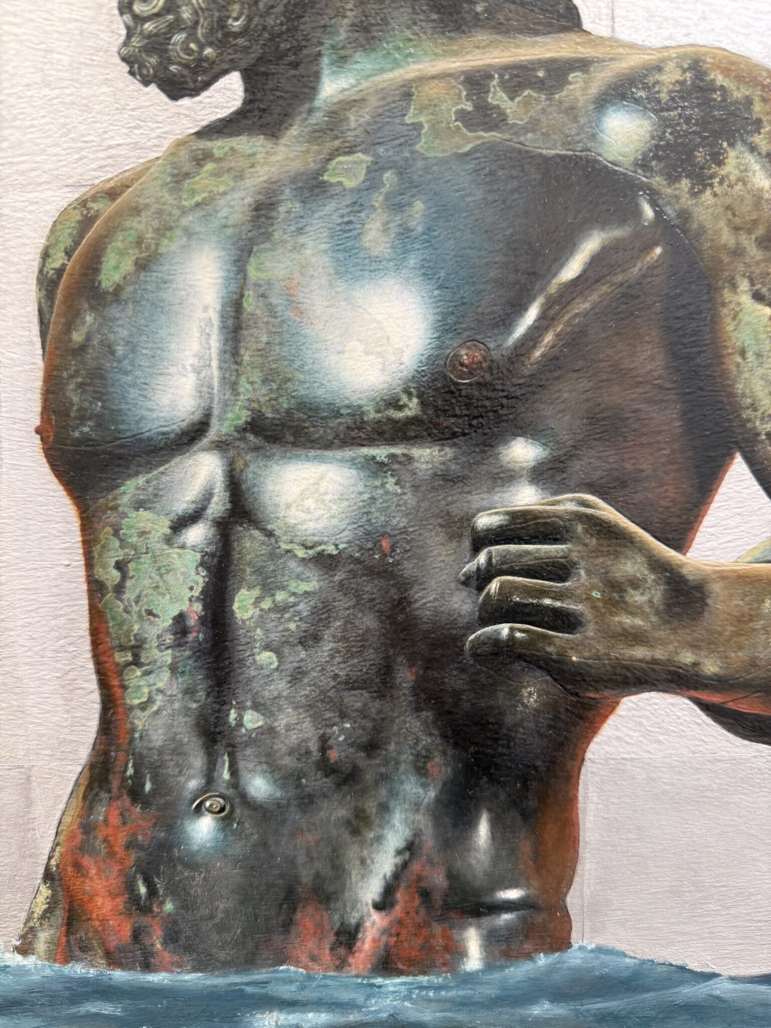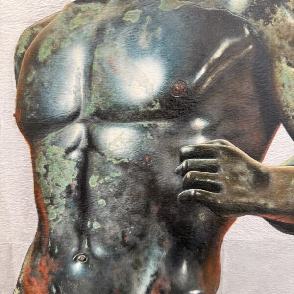 The subject carries deep historical significance—authentic Greek bronze statues are incredibly rare, as many were lost when the Romans melted them down to create weapons and coins. Binder’s choice to portray this form not only honors classical craftsmanship but also connects the past to the present through contemporary design.