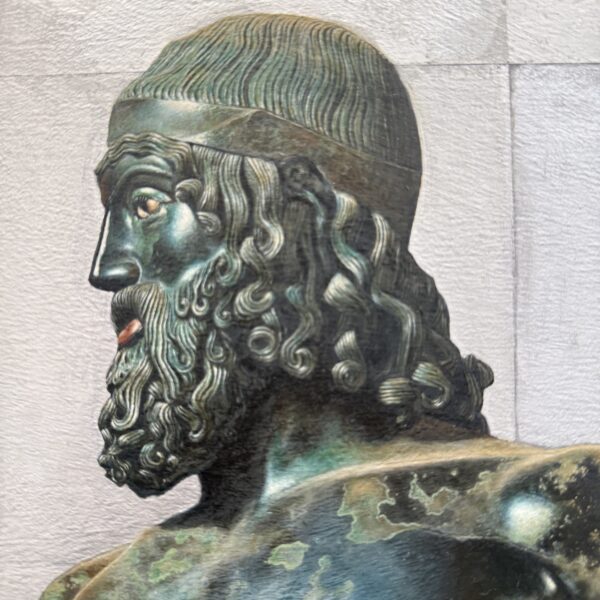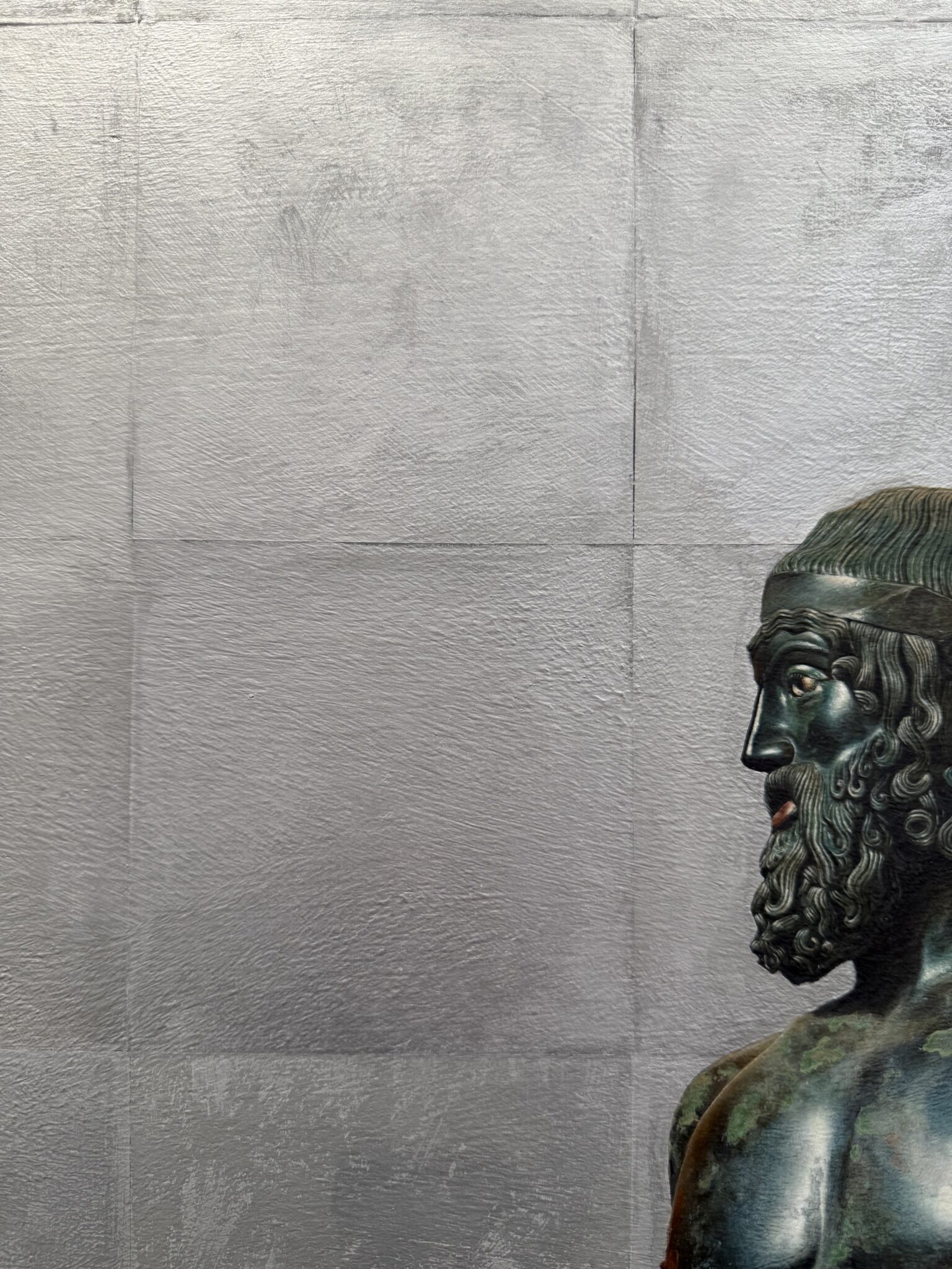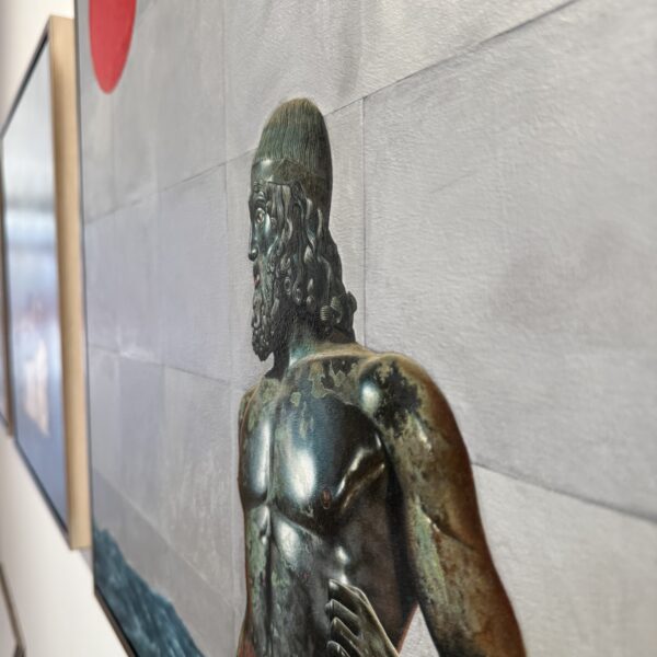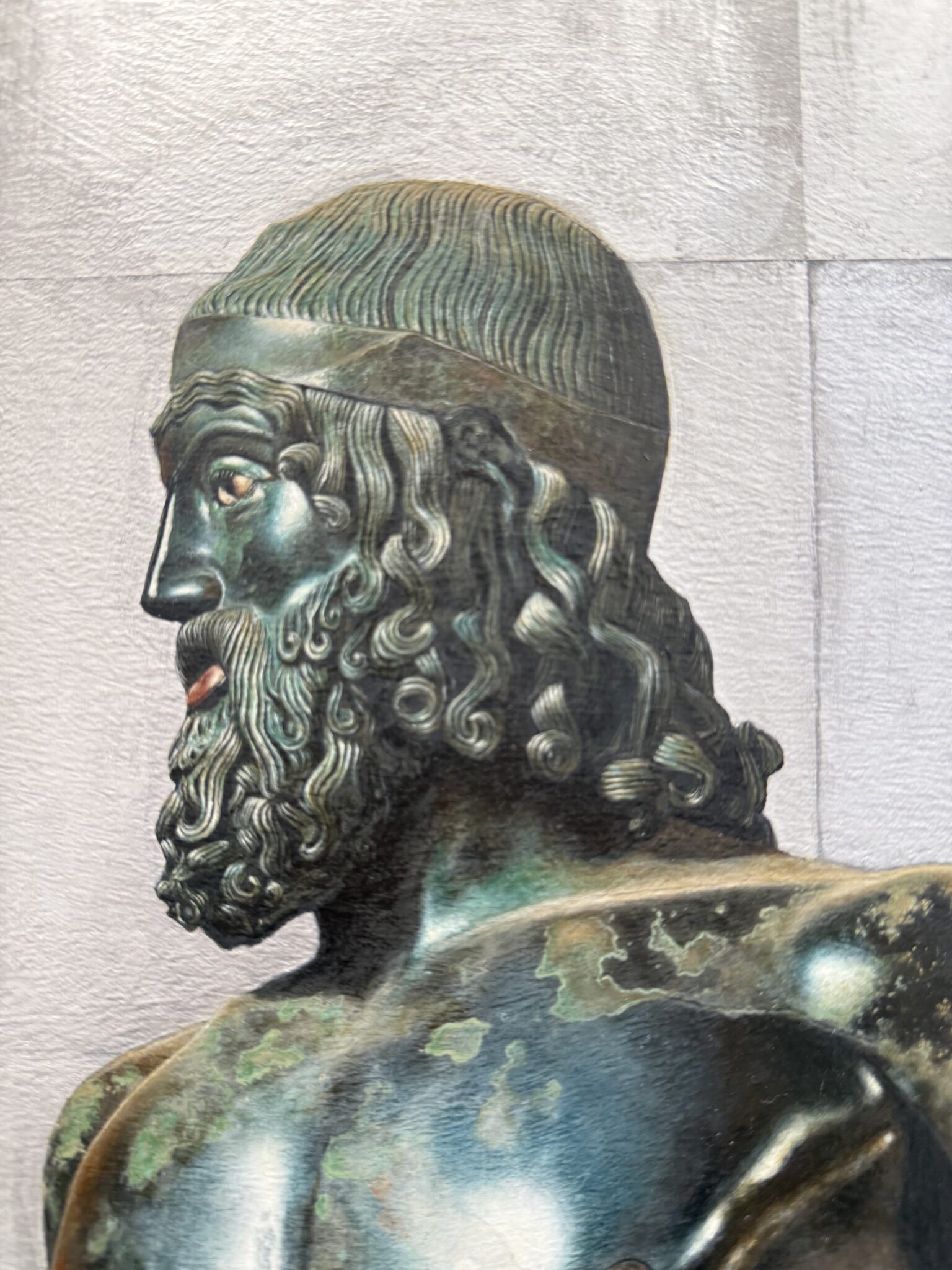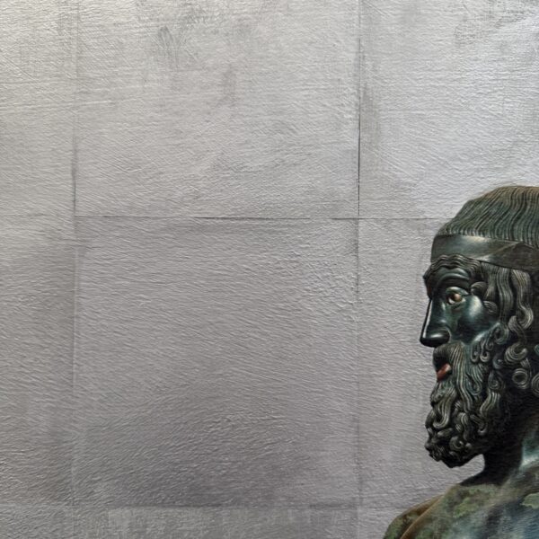 The subject carries deep historical significance—authentic Greek bronze statues are incredibly rare, as many were lost when the Romans melted them down to create weapons and coins. Binder’s choice to portray this form not only honors classical craftsmanship but also connects the past to the present through contemporary design.