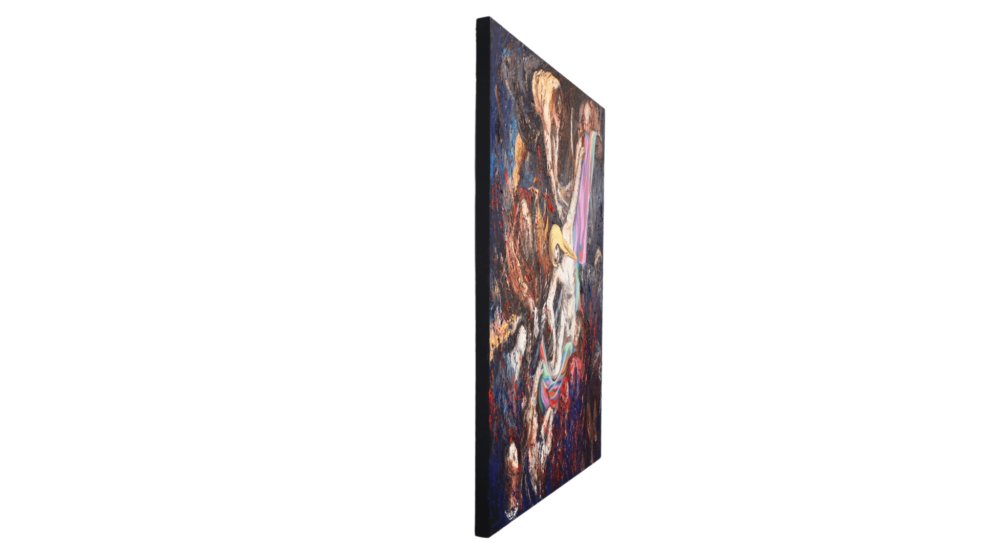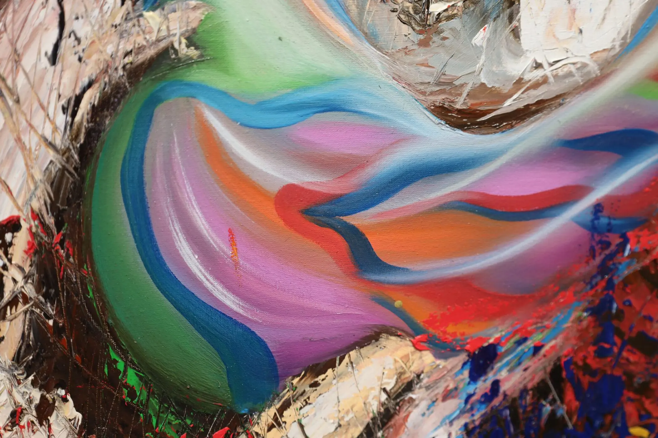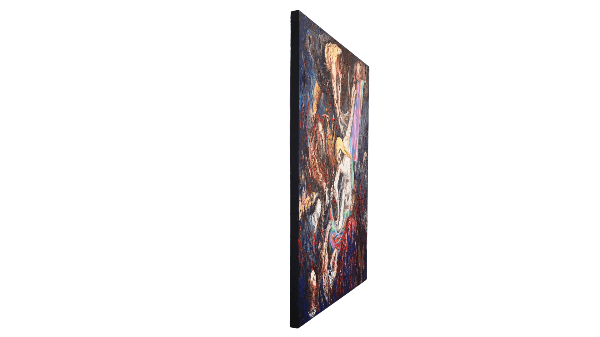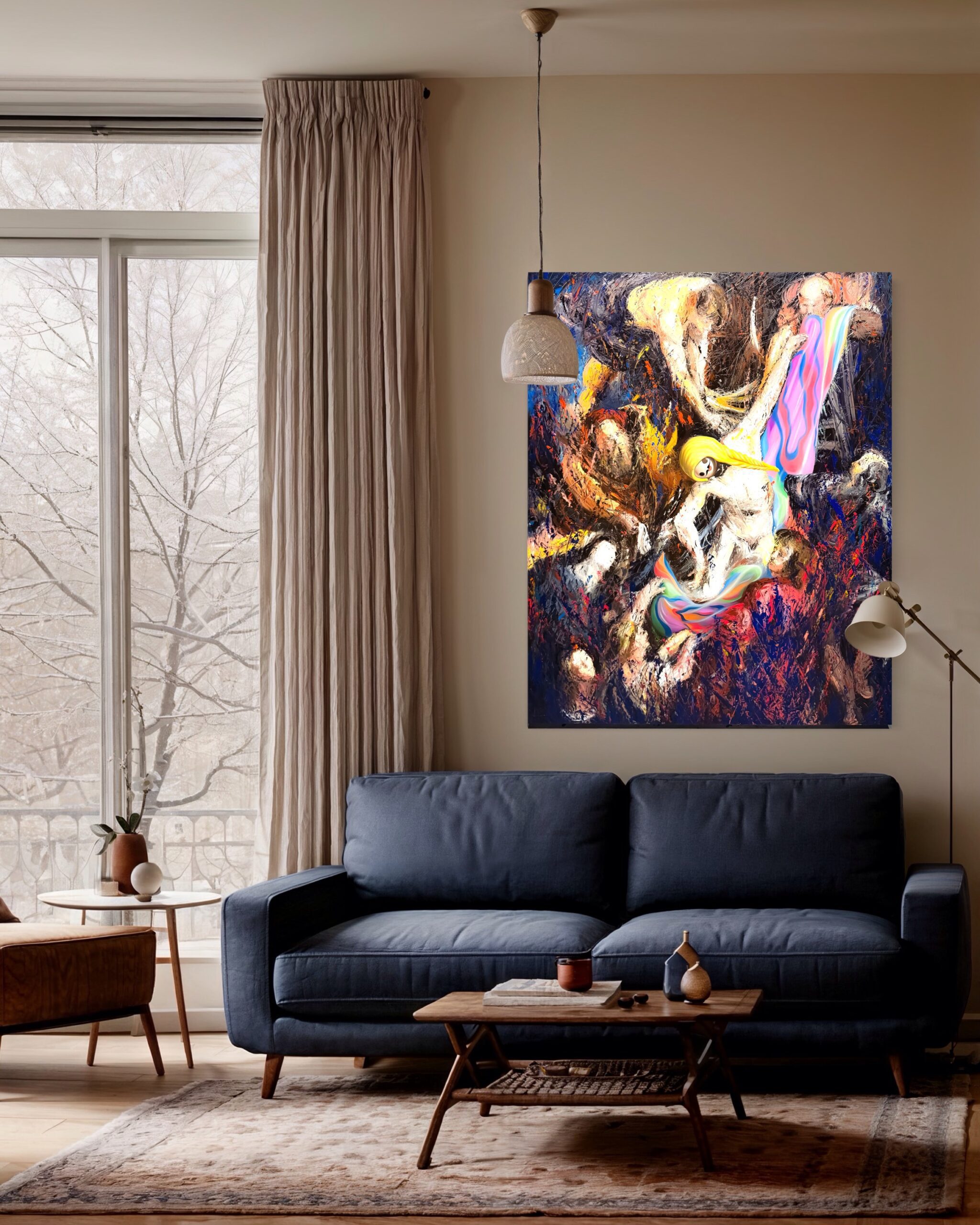 In “Ego Demons vs Spiritual Being,” Madrigal captures raw emotions through abstract expressionism. Bold contrasts and various brushstrokes create movement and passion. At the center, a white figure emerges from chaos, surrounded by swirling shades of blue, yellow, and pink, conveying intensity and emotional depth.
