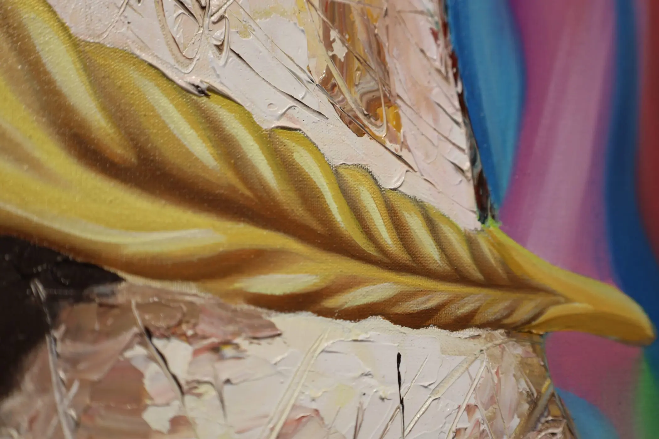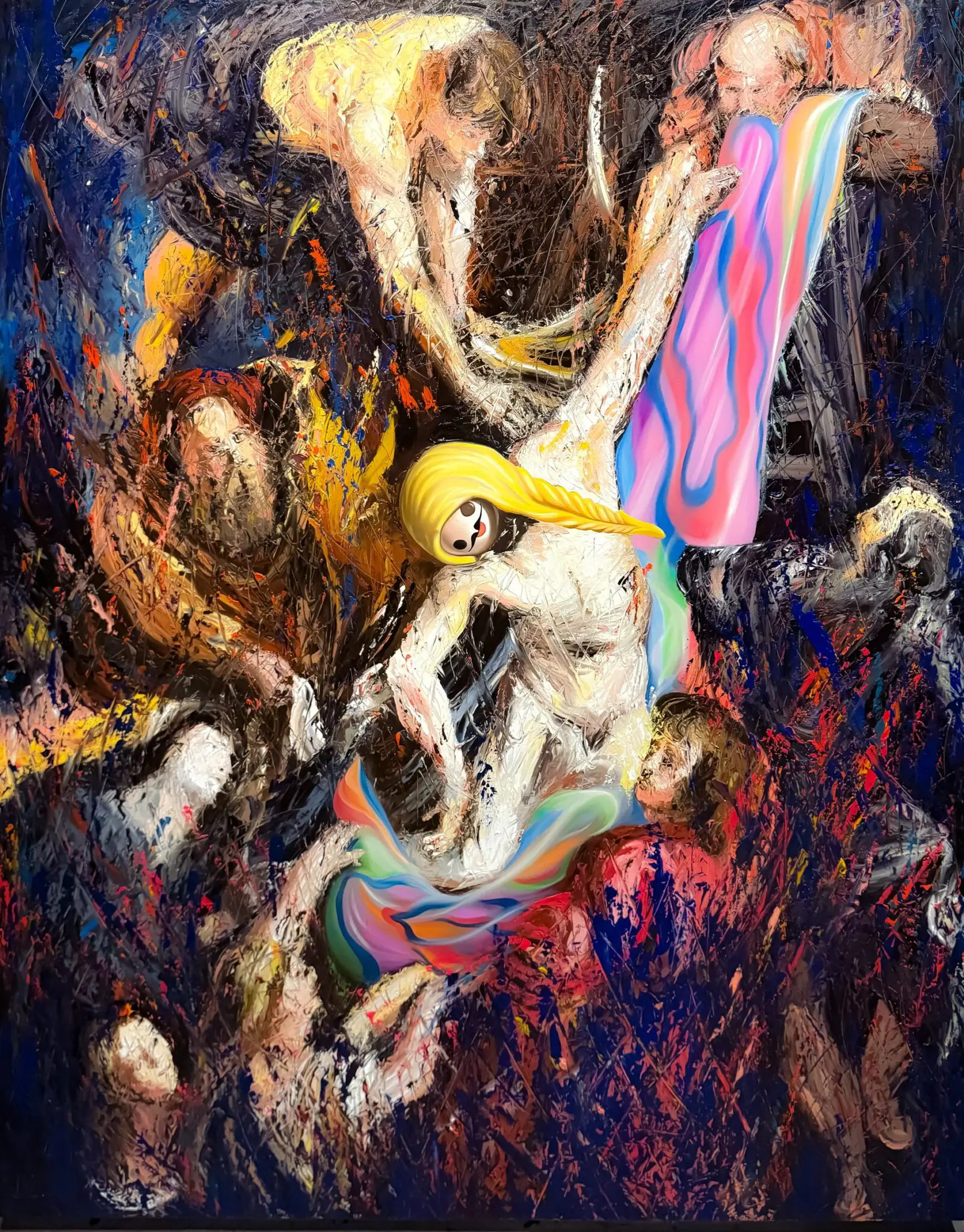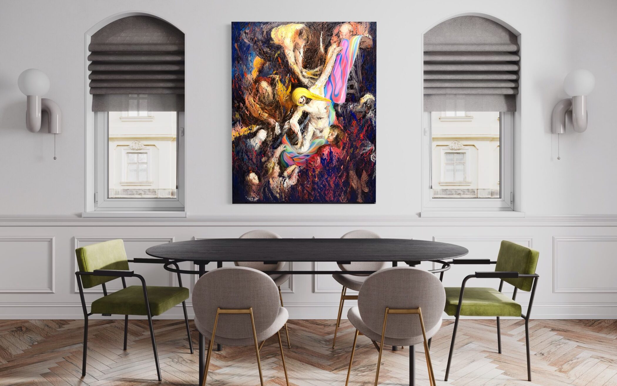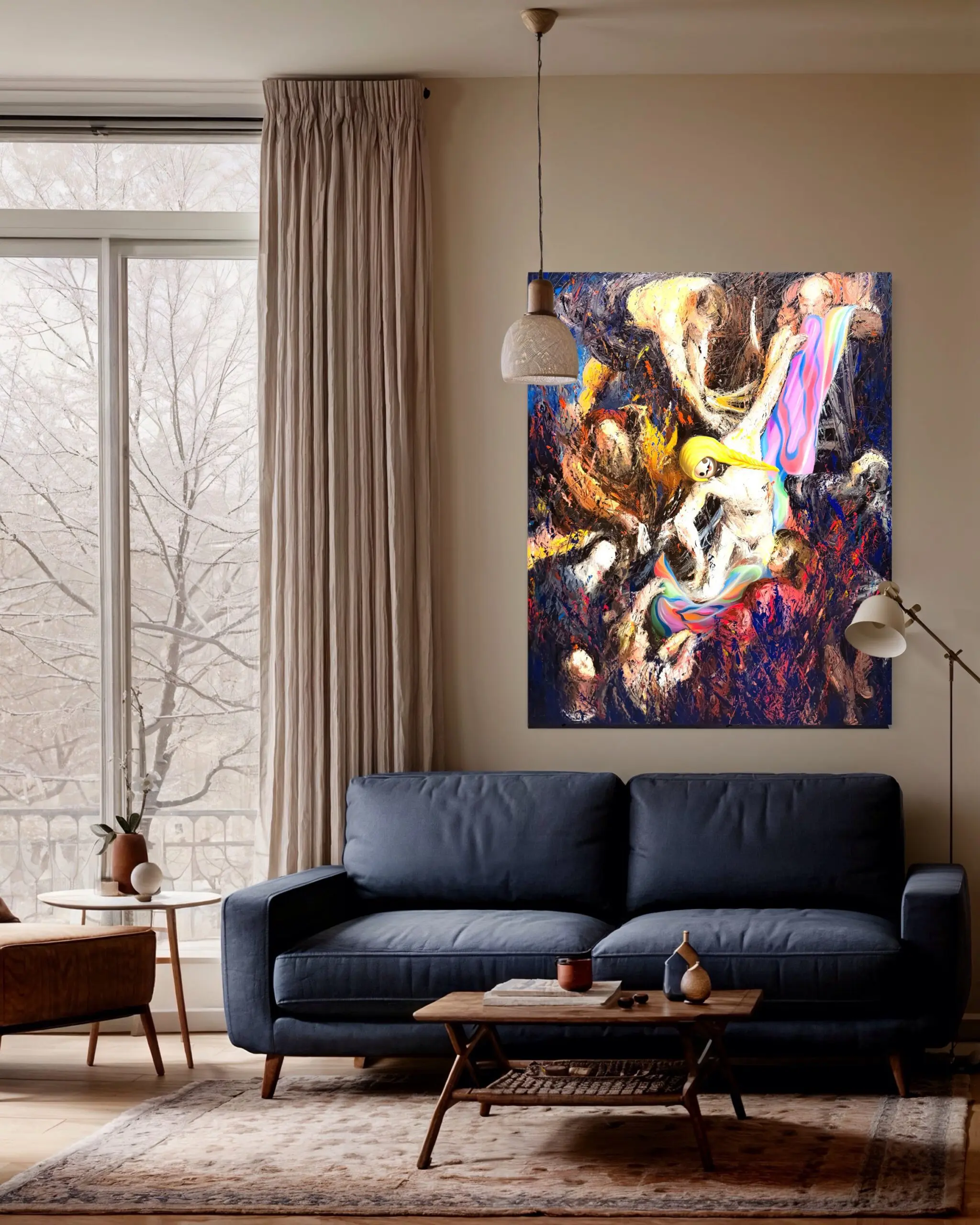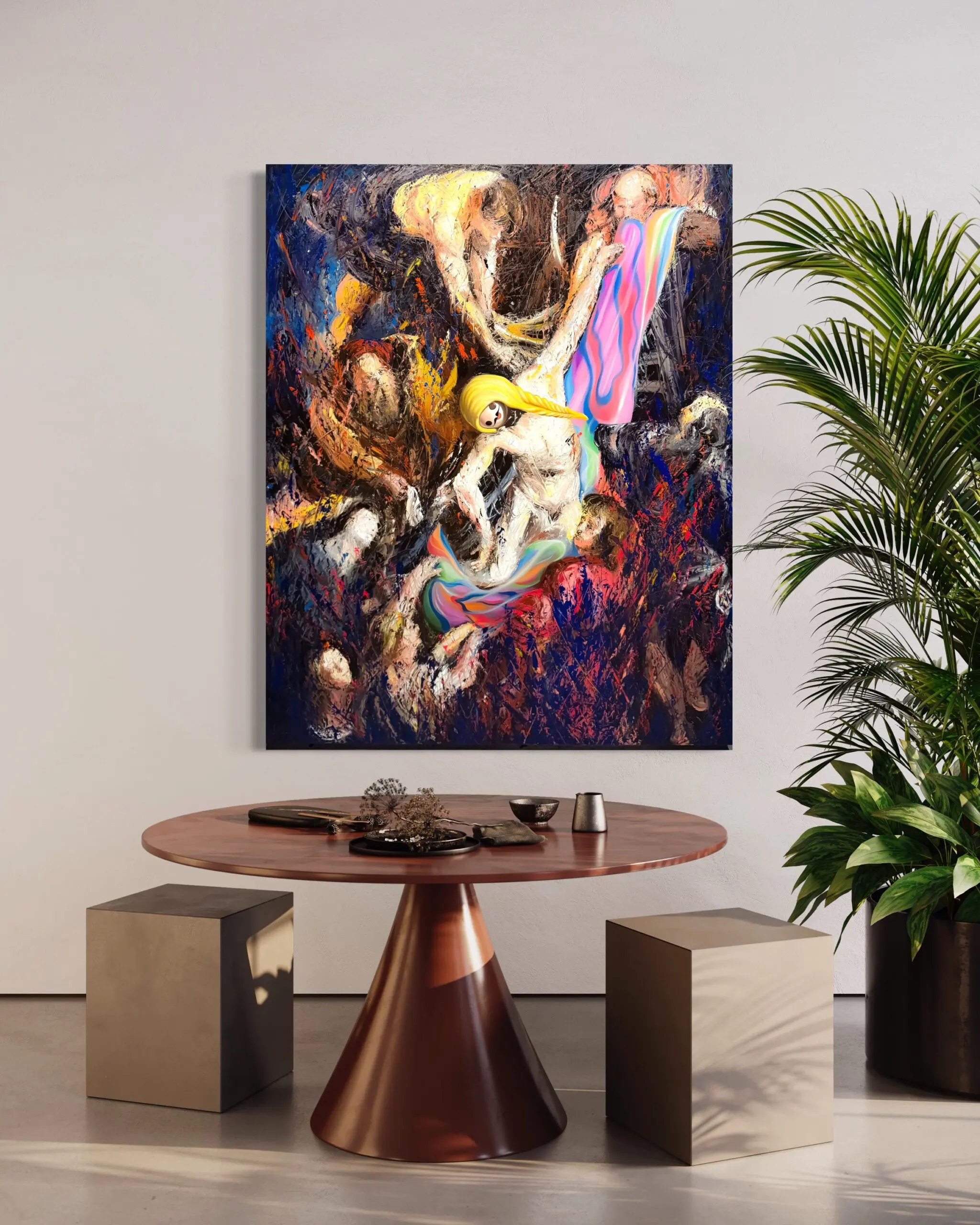 In “Ego Demons vs Spiritual Being,” Madrigal captures raw emotions through abstract expressionism. Bold contrasts and various brushstrokes create movement and passion. At the center, a white figure emerges from chaos, surrounded by swirling shades of blue, yellow, and pink, conveying intensity and emotional depth.