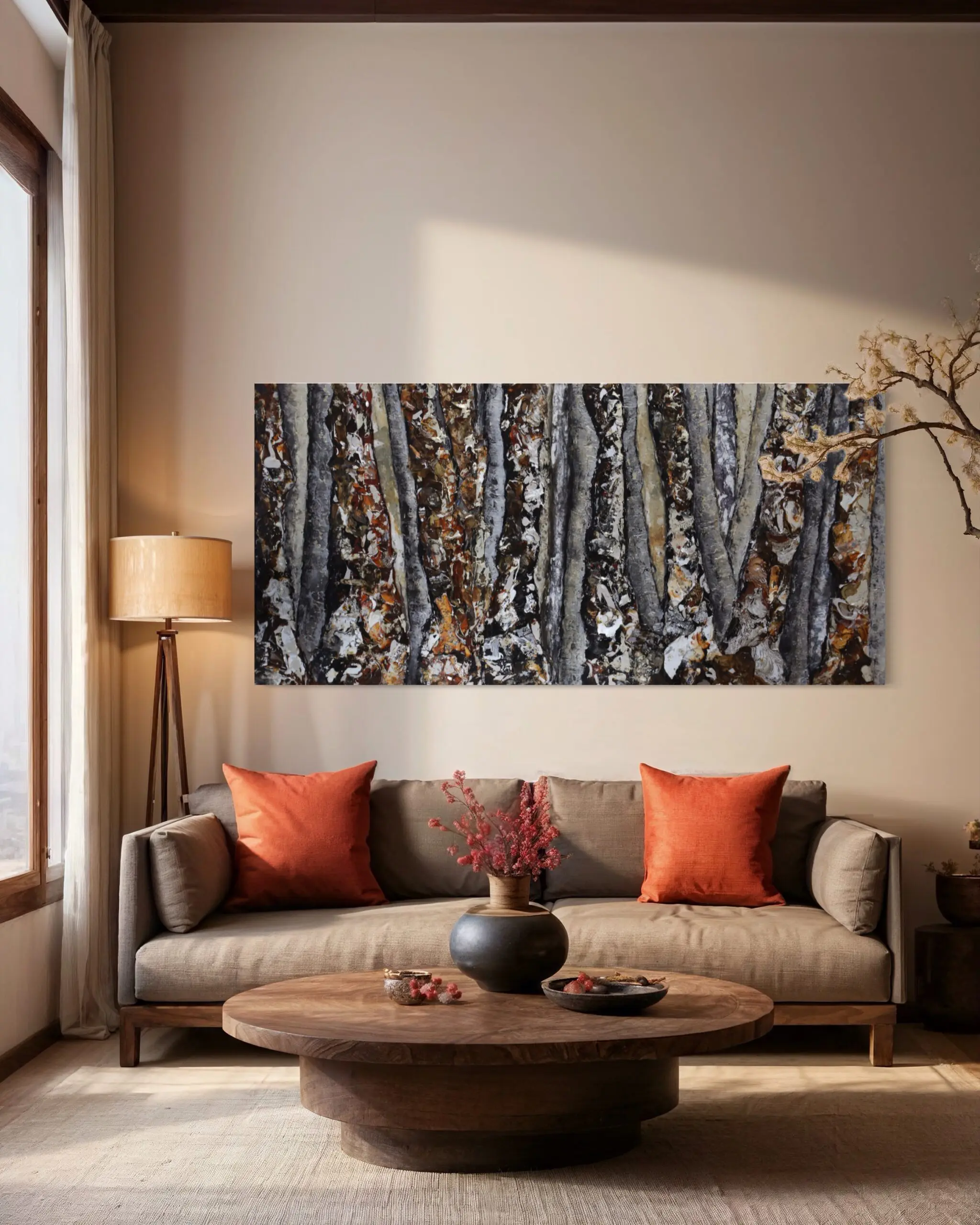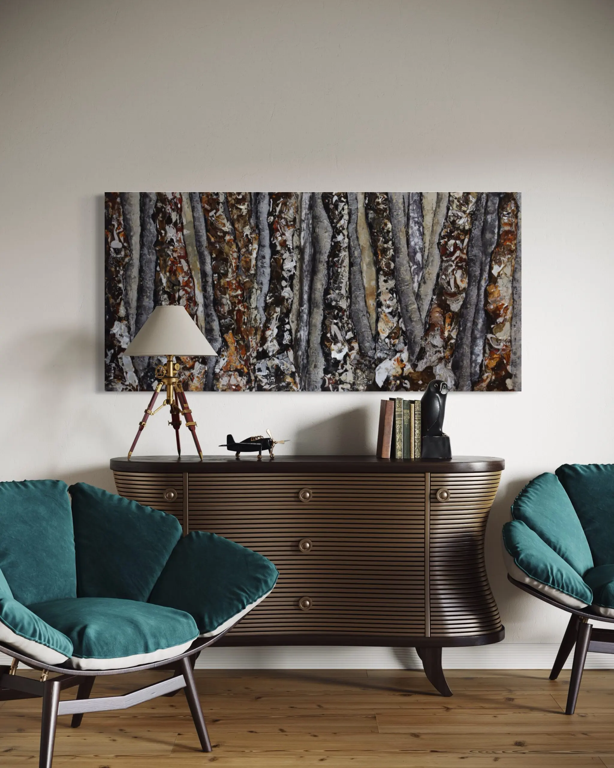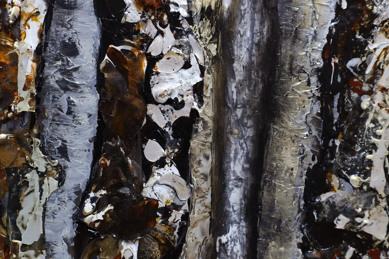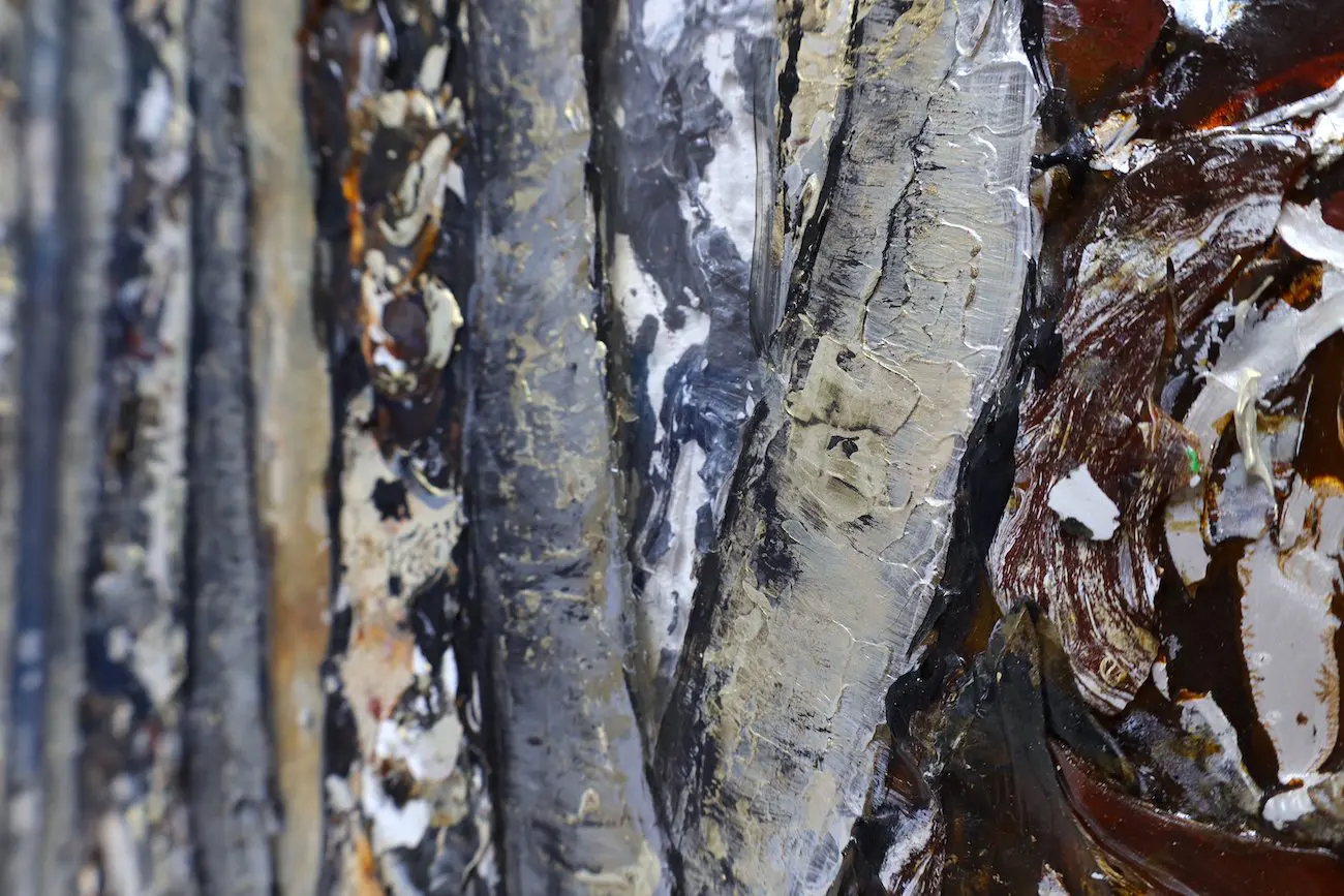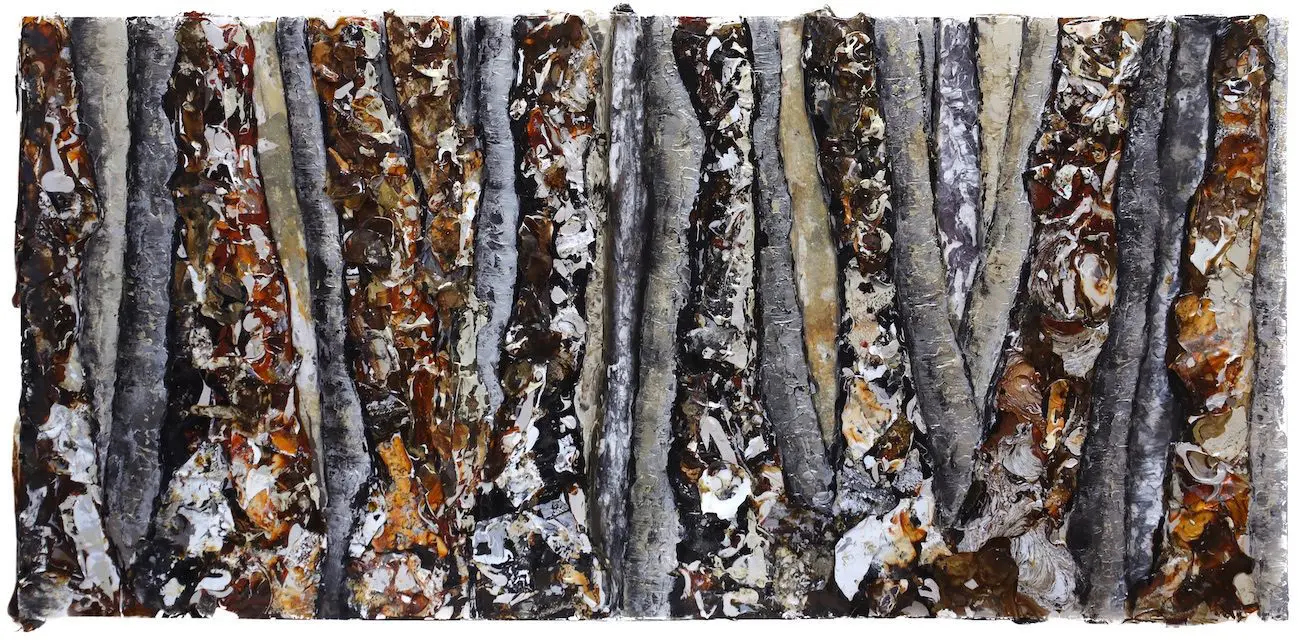 The vertical arrangement of tree trunks establishes a rhythmic structure, while the thick layers of paint add dimension, making the surface feel almost sculptural. Glossy textures catch the light, enhancing the sense of movement within the natural patterns of bark and organic matter. Some areas appear weathered and cracked, while others gleam with fluidity, evoking the interplay of resilience and change in the natural world.