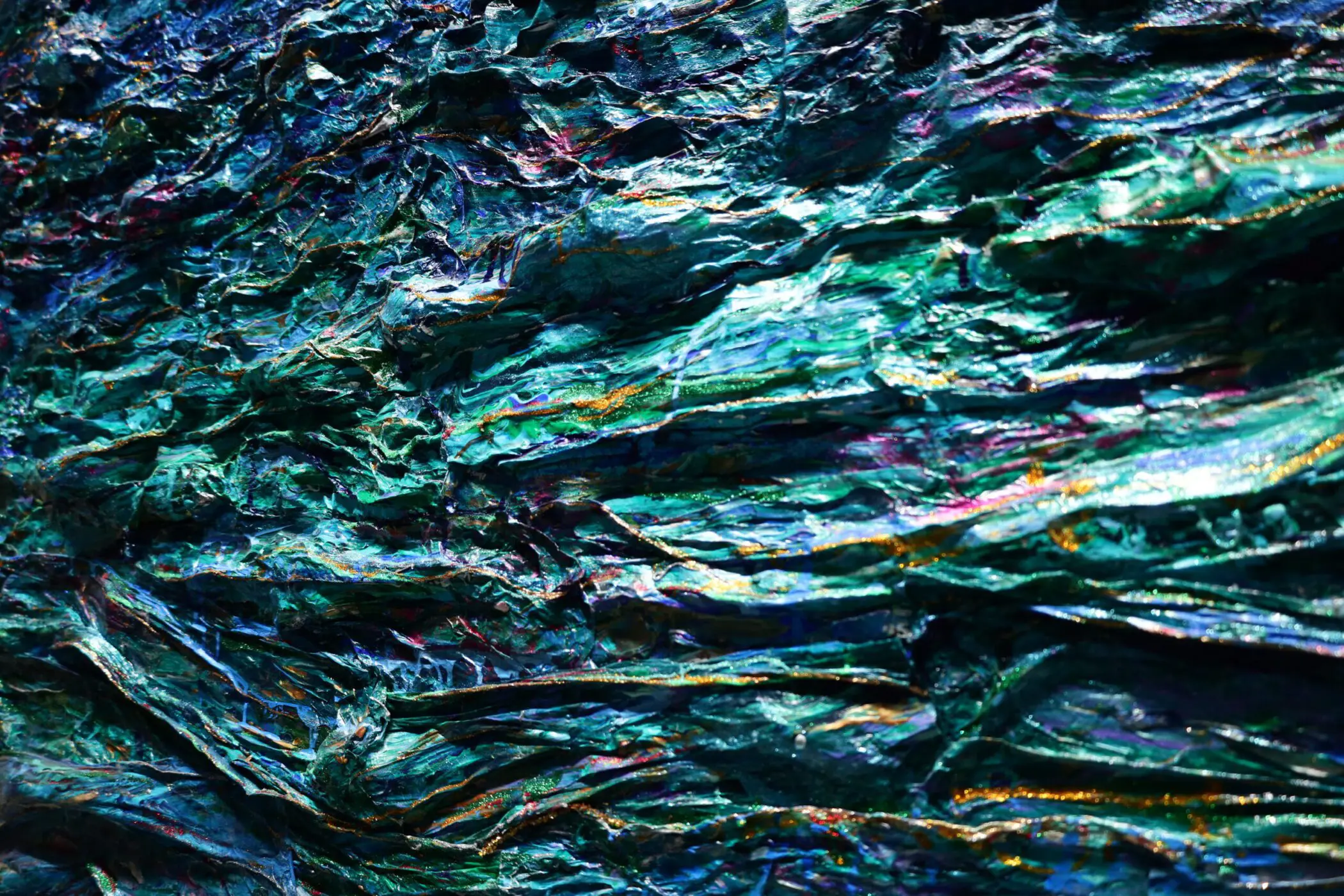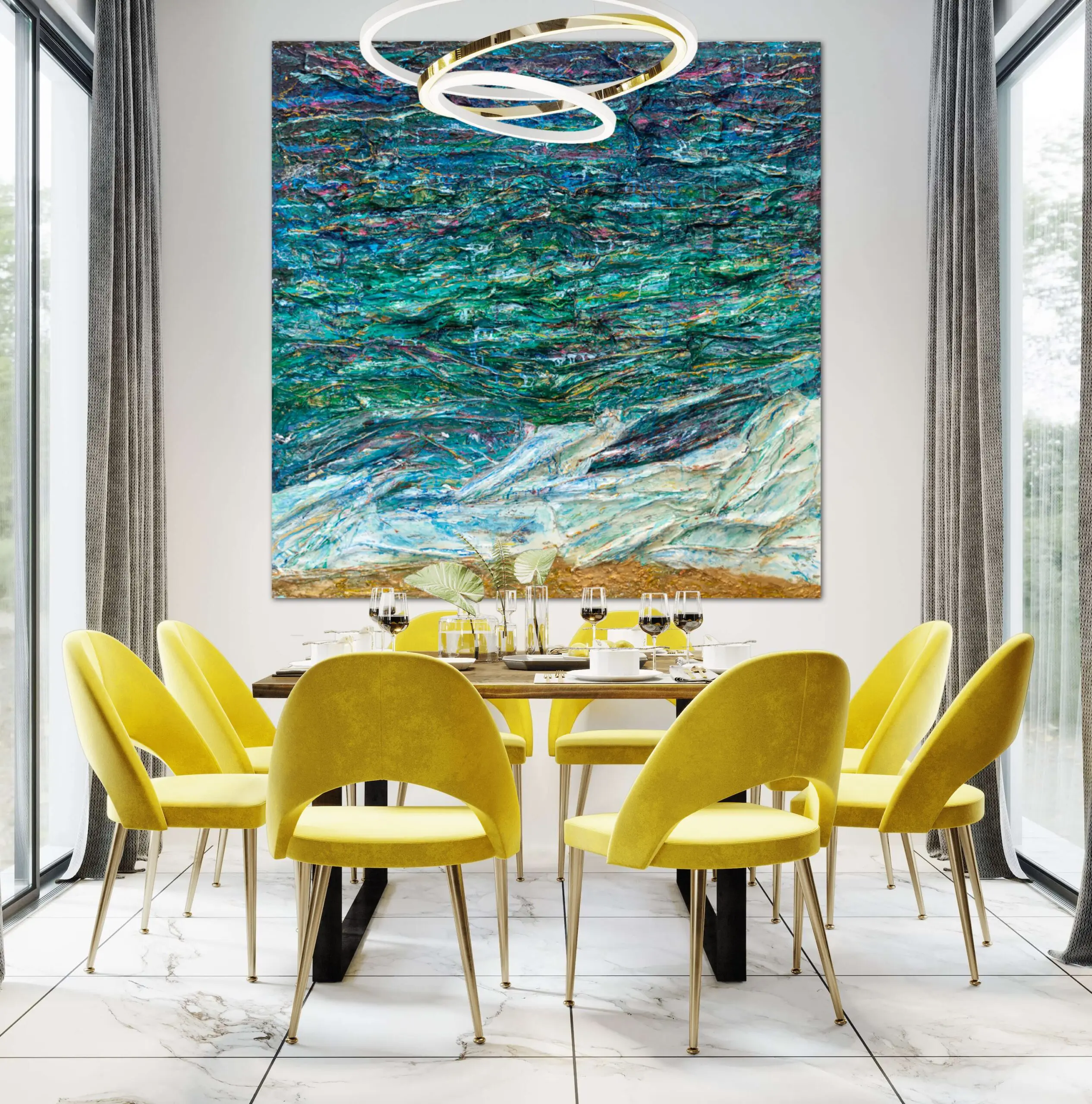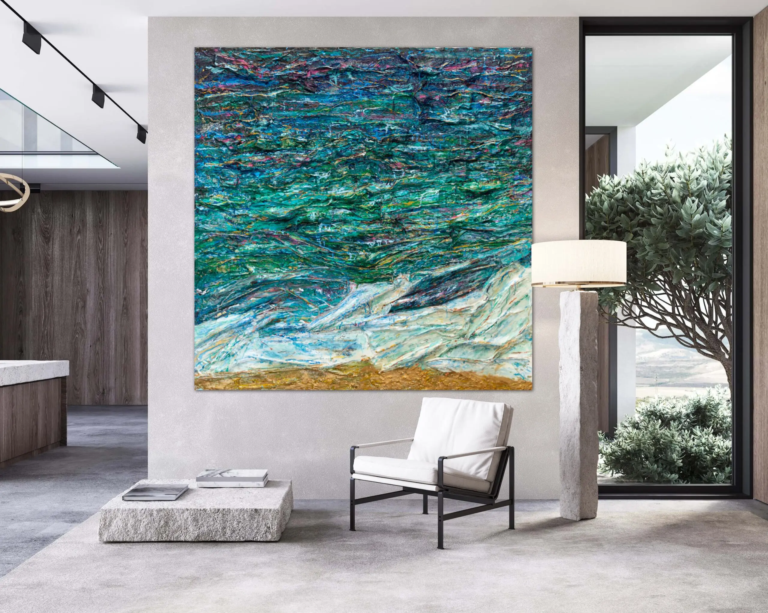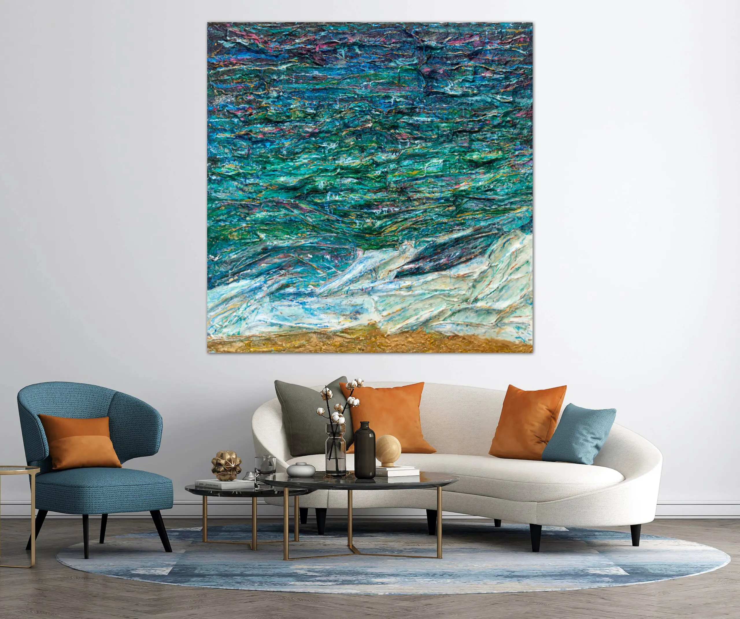 At first glance, the composition is a study in movement. The textured strokes, layered and sculptural, evoke the churning rhythms of an untamed tide. The upper portion of the painting is rich with deep jewel tones—emerald greens, sapphire blues, and hints of violet—creating a sense of depth reminiscent of an ocean’s hidden mysteries. As the eye travels downward, the colors lighten, breaking into frothy whites and sandy neutrals, suggesting the meeting of water and land, the moment where movement dissolves into stillness.
