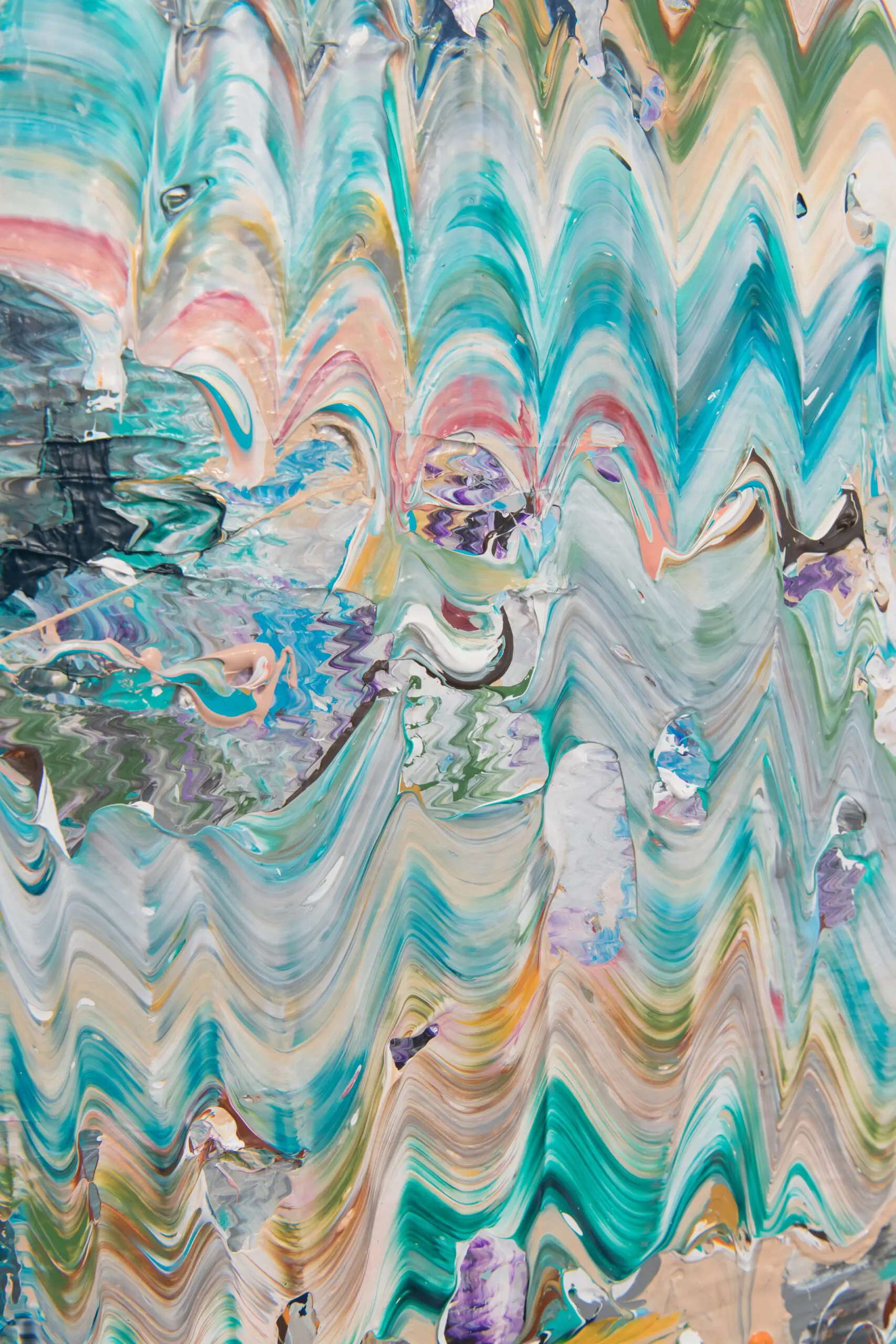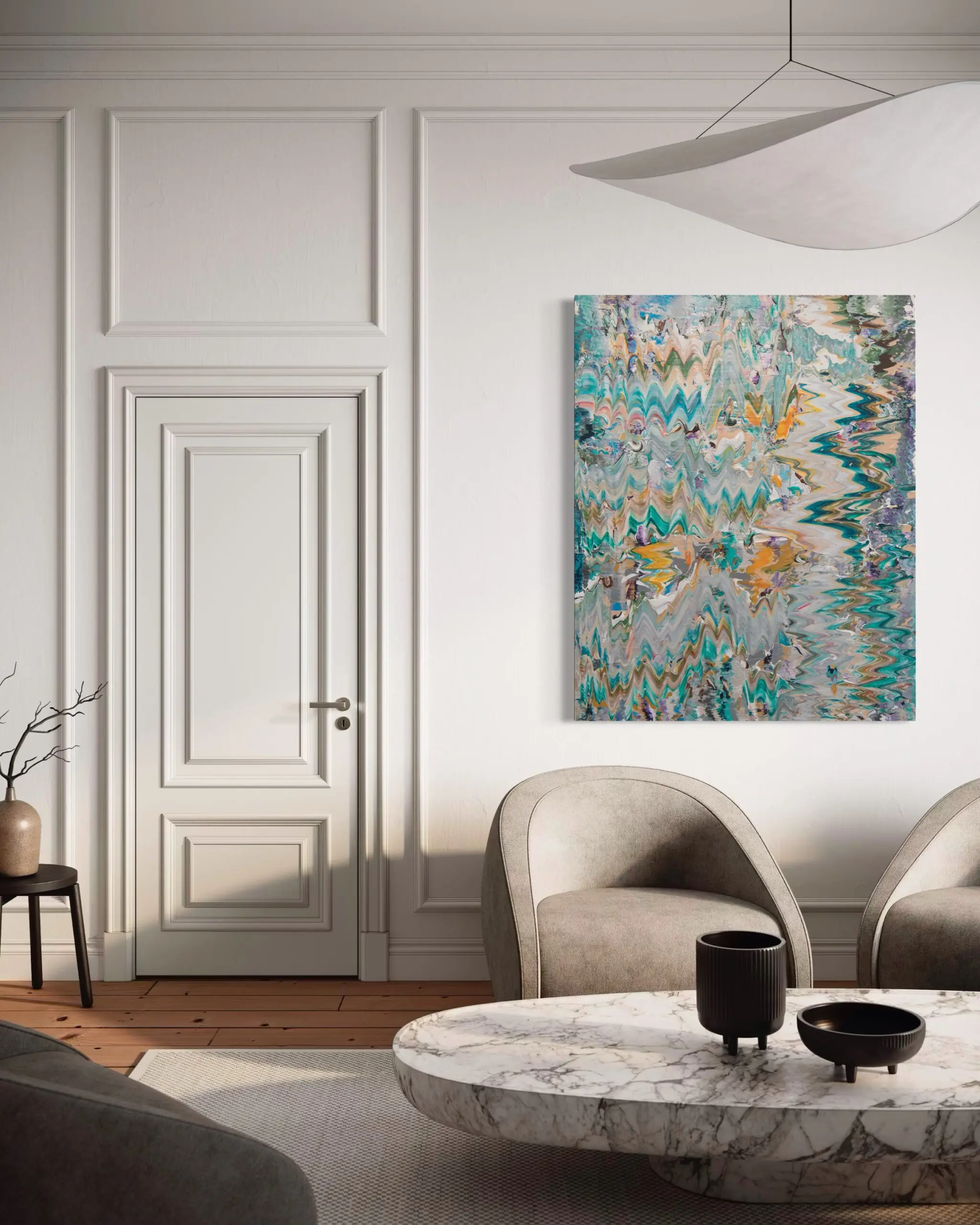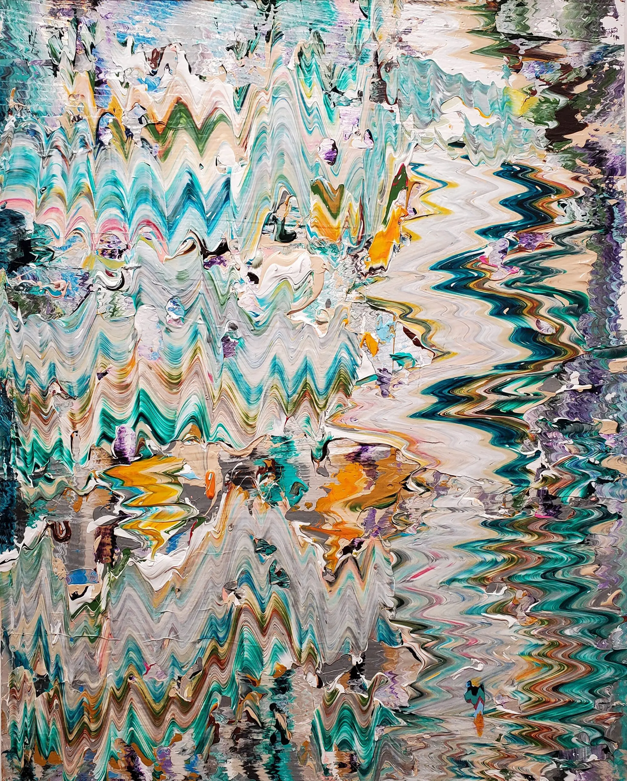 As the title of the painting implies, it captures the migration of energy radiating in all directions. The vibrant dialogue between electric orange and green draws the viewer’s gaze toward the center, only to be redirected by the playful wiggly effect of the green to the right. The grounding presence of gray, lilac, and brown tones serves as neutral backdrops, allowing the striking green and orange to take center stage. Other surprising hues subtly weave throughout the composition, inviting the viewer to explore the mystery and intricacy of less dominant colors that coexist harmoniously without competing with the more primary shades.