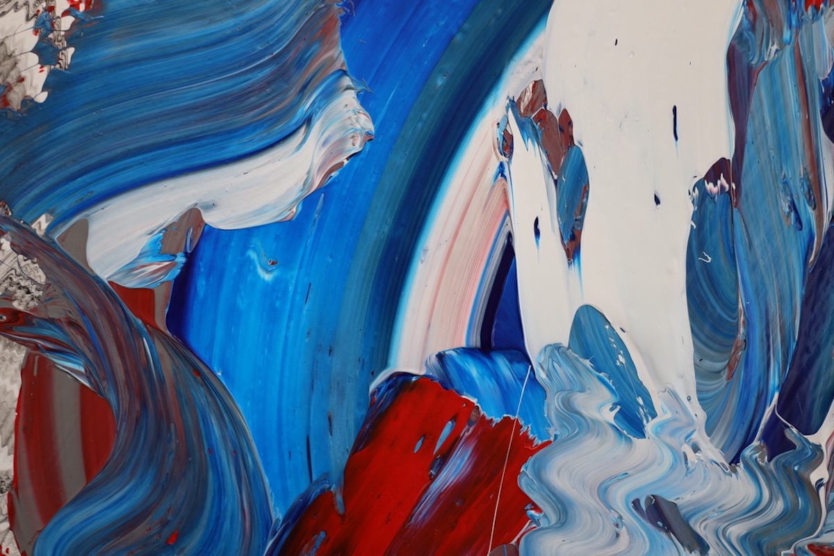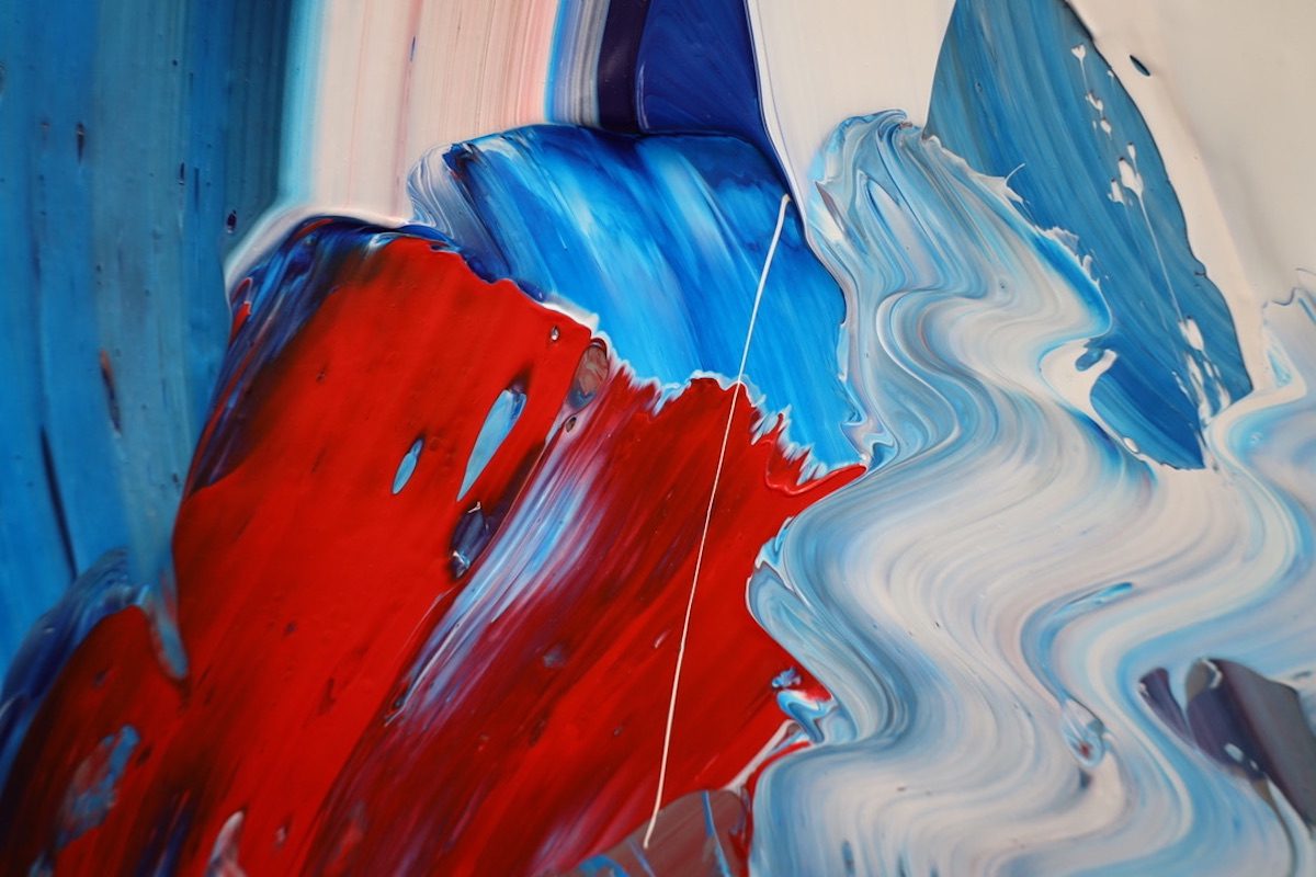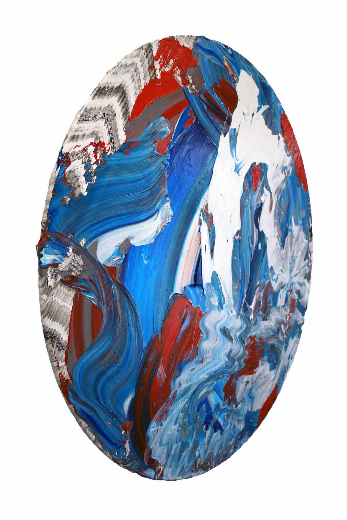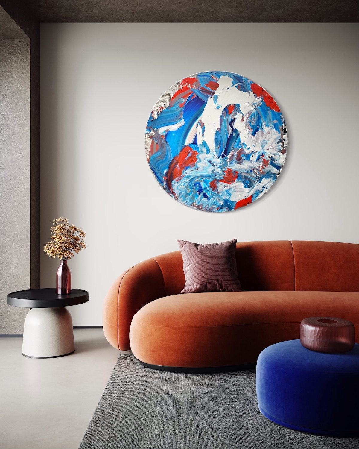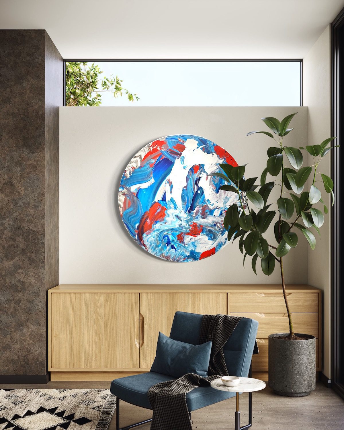 Robert Standish’s circular work “Energy Within” is a prime example of the artist’s exceptional talent for imbuing a work of art with a palpable sense of presence. Employing a restrained palette of blues, oranges, black, and white, Standish deploys his signature wet-on-wet technique to conjure layers of color that appear to swirl and rotate across the canvas. The circular format of the composition amplifies the work’s sense of motion, as the viewer’s eye is drawn into a vortex of shifting hues and undulating brushstrokes.