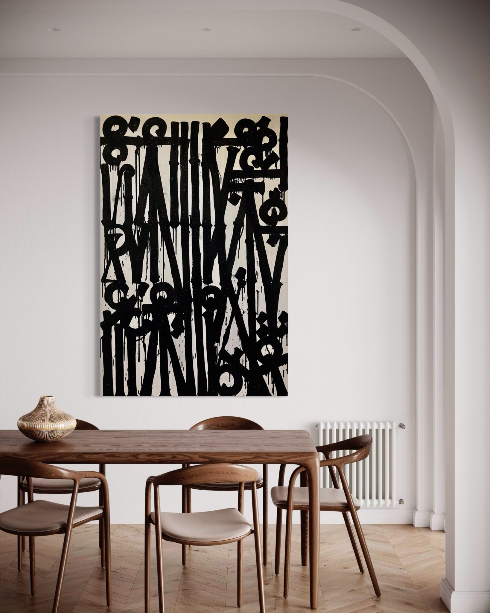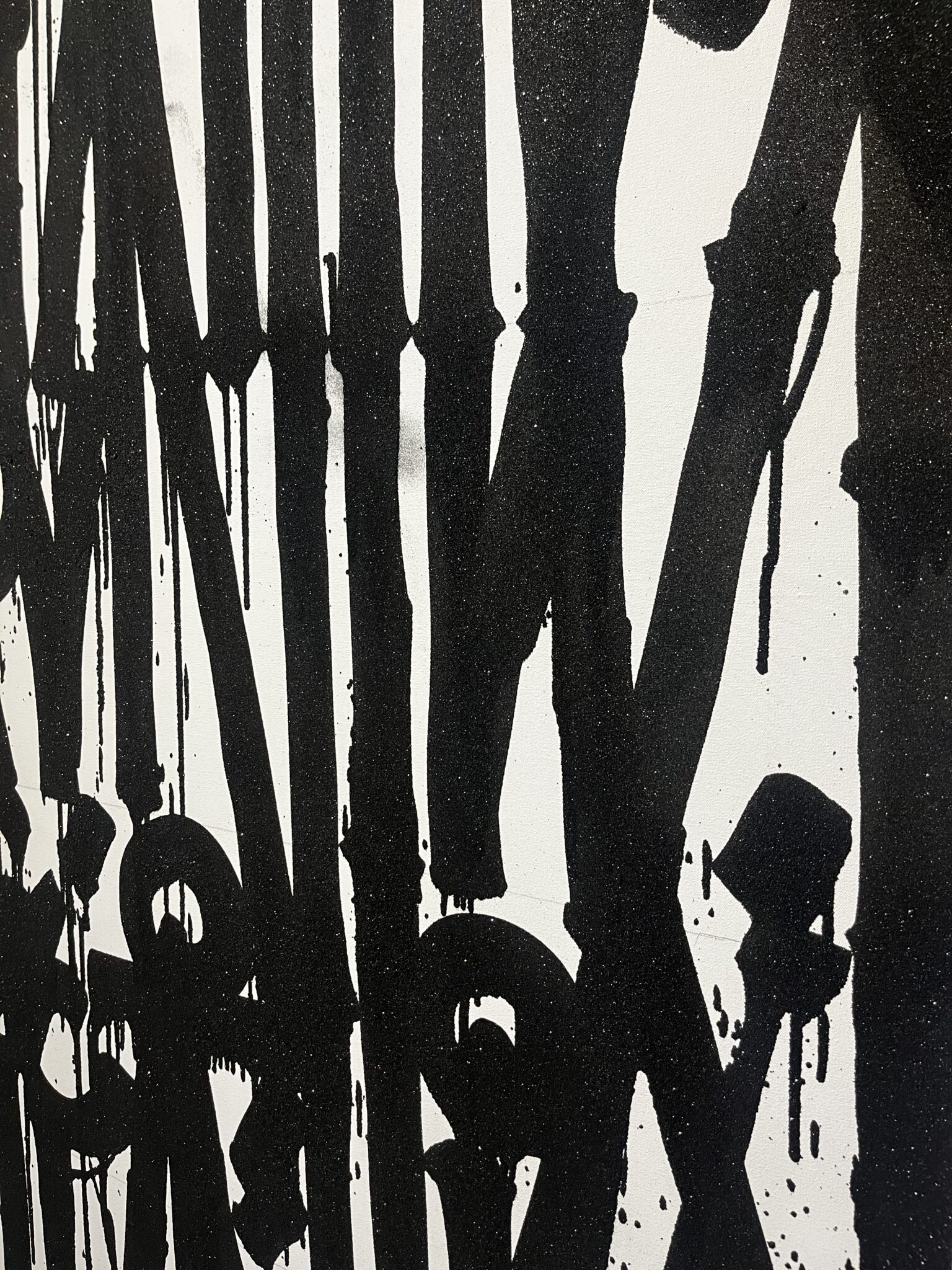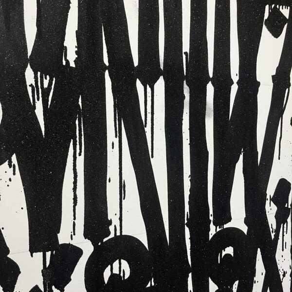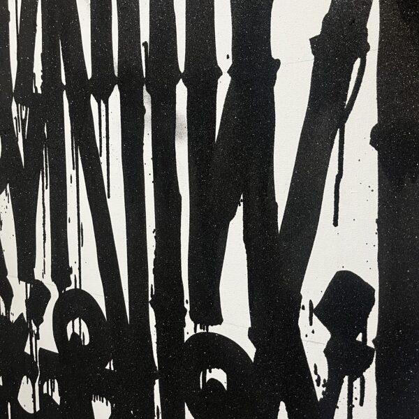 In Eternal Sunshiners, RETNA wields a bold black-and-white palette to powerful effect. His signature script, painted in thick black enamel, stretches across a bright white ground with commanding presence. The vertical arrangement of glyphs creates a rhythmic grid, while drips soften the rigidity of the forms, adding a raw, expressive layer to the composition.