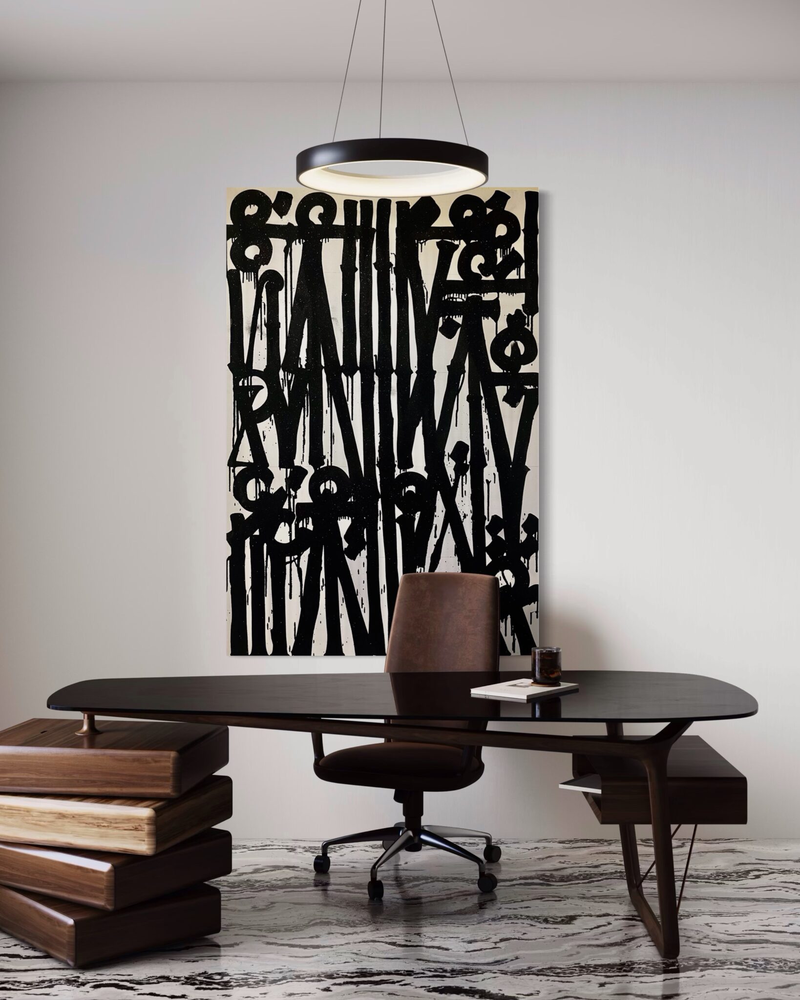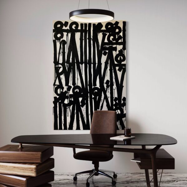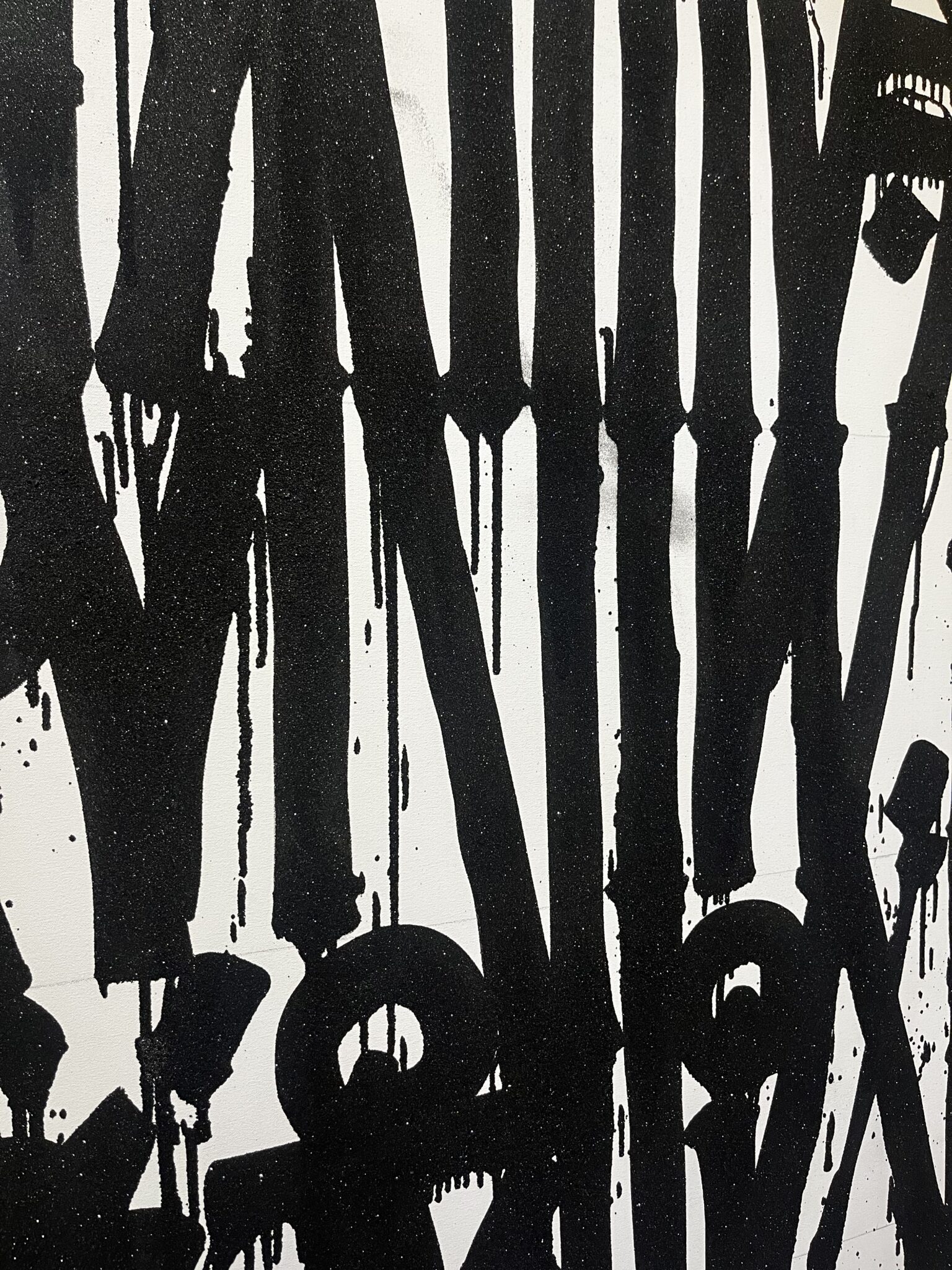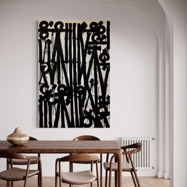 In Eternal Sunshiners, RETNA wields a bold black-and-white palette to powerful effect. His signature script, painted in thick black enamel, stretches across a bright white ground with commanding presence. The vertical arrangement of glyphs creates a rhythmic grid, while drips soften the rigidity of the forms, adding a raw, expressive layer to the composition.