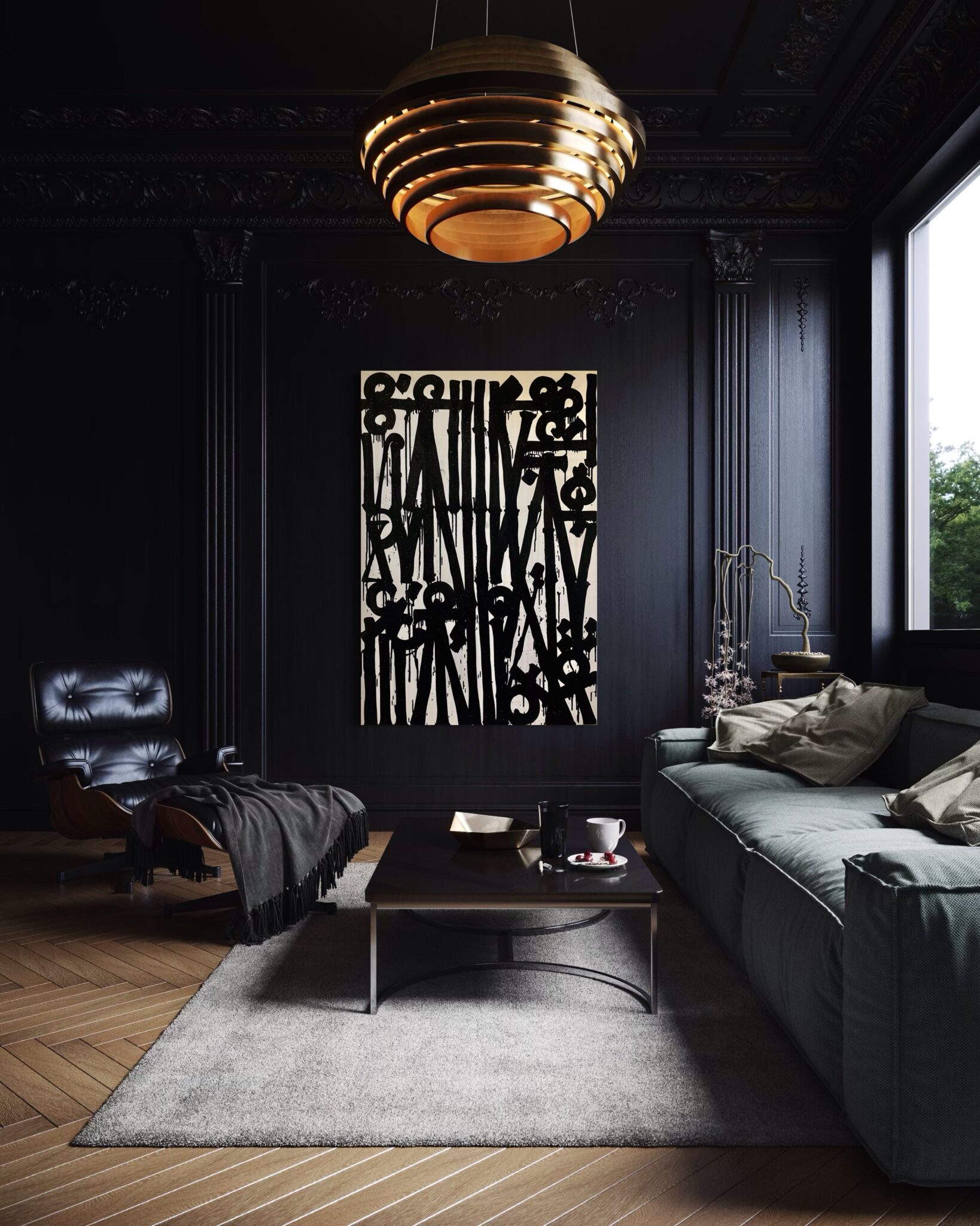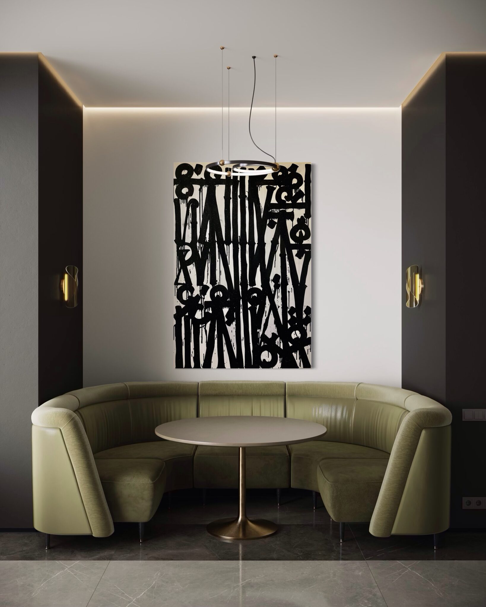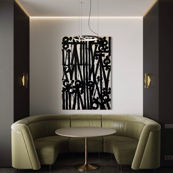 Crystalline elements catch the light across the surface, lending a subtle shimmer that contrasts with the dense opacity of the lettering. The interplay of high contrast and texture heightens the visual impact, turning each mark into both symbol and structure. RETNA’s language—drawn from a synthesis of global calligraphic traditions—transcends written meaning, communicating through form, repetition, and motion.
