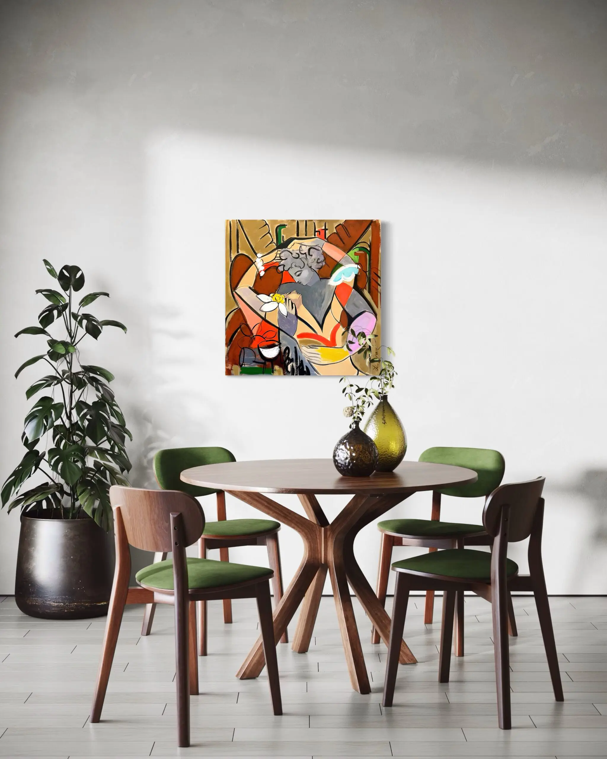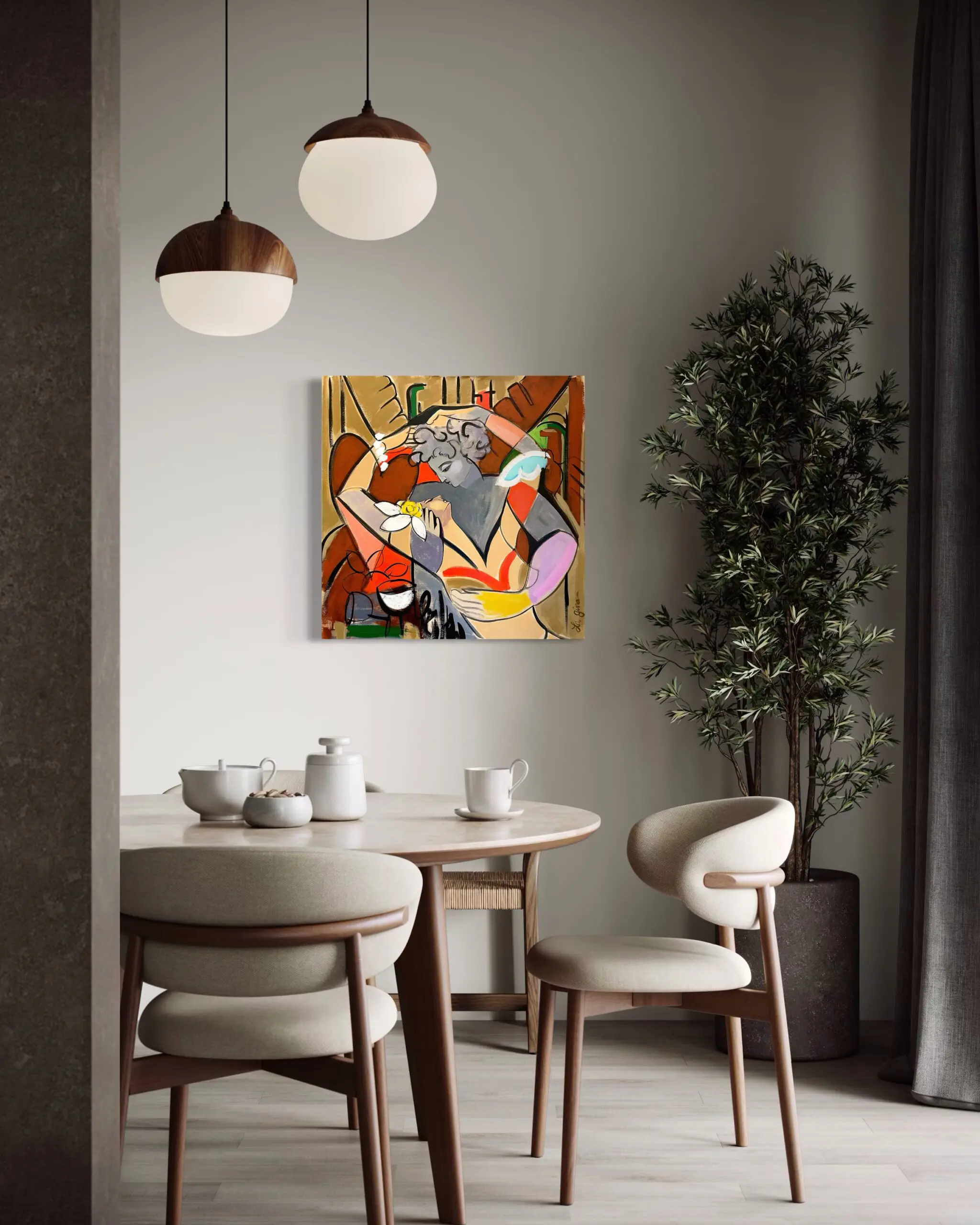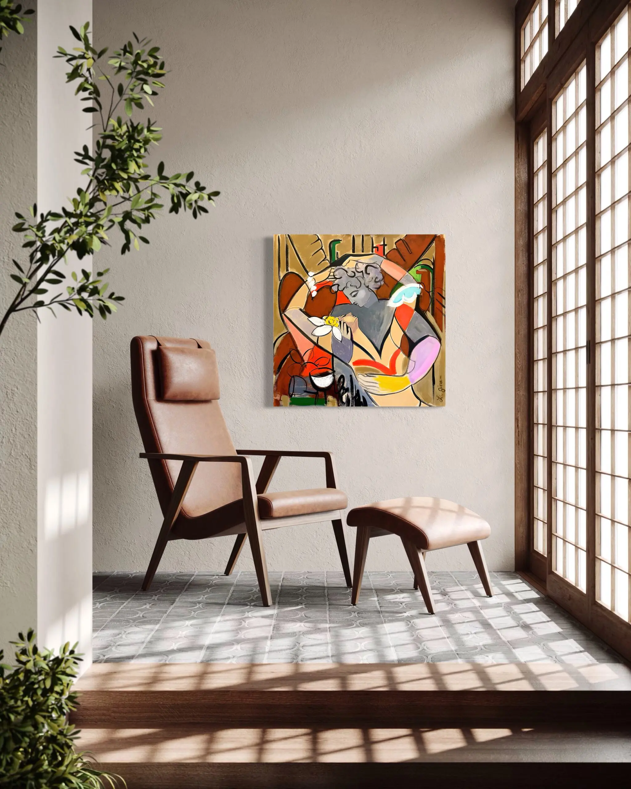 “Eternal” is a mesmerizing Cubist composition, where fragmented forms, interwoven lines, and rhythmic energy come together to depict an intimate embrace that transcends time and physicality. The artist masterfully blends geometric abstraction with emotional depth, constructing a visually dynamic yet deeply symbolic meditation on love, connection, and eternity.