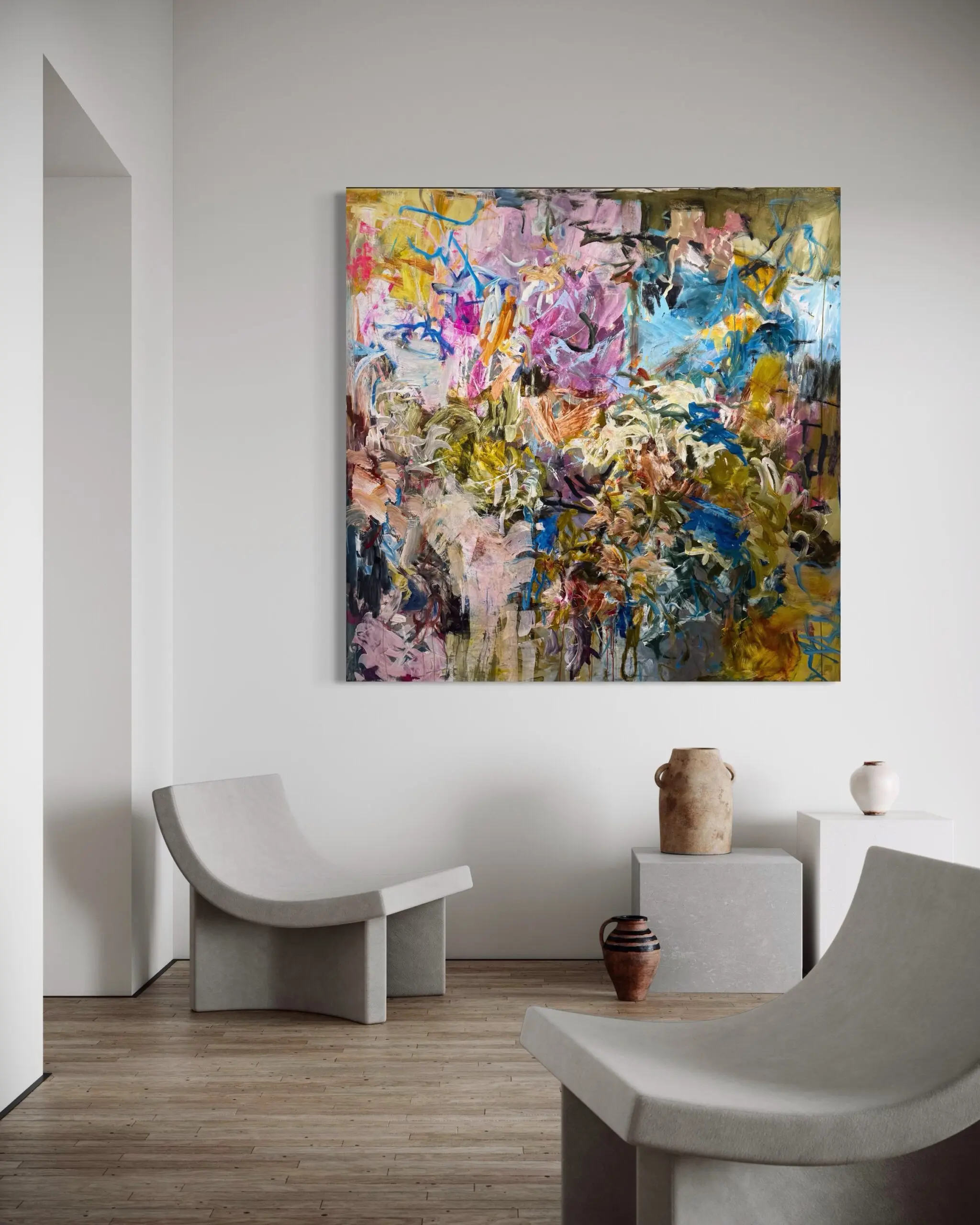 “Fall In Love” pulsates with a rich palette of golden yellows, deep blues, soft whites, and vibrant purples, each blending seamlessly yet standing boldly in contrast. Swirling, gestural strokes give the piece a sense of fluidity, as though all the elements of nature—wind, water, fire—have been captured in a single moment on canvas. The interplay between light and dark, opacity and translucency, adds to the complexity, inviting viewers to lose themselves in its shifting layers and evolving forms.