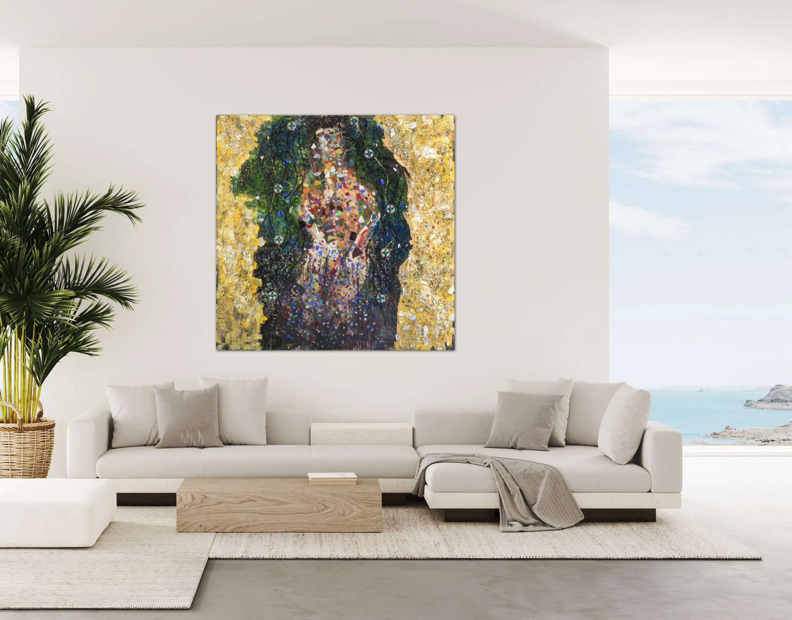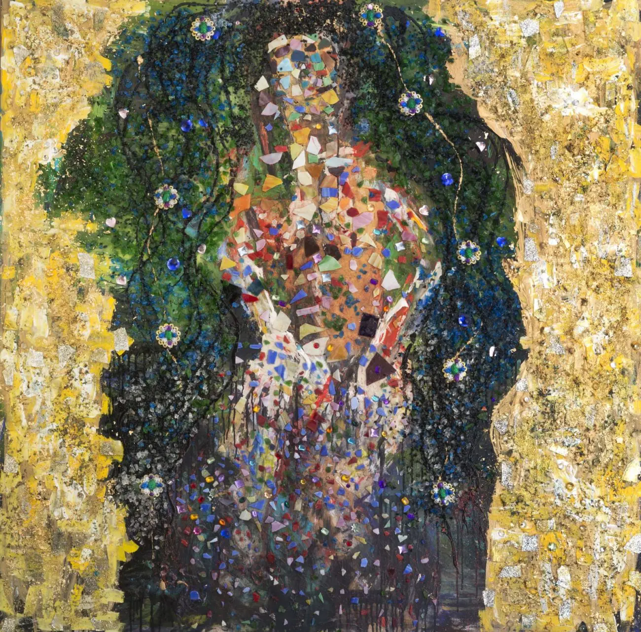 What makes “Inner Vibration 3” such an introspective statement piece is its balance between material opulence and spiritual resonance. The structured collage elements contrast with the organic flow of paint, creating a sense of movement that mirrors the unseen vibrations of energy and presence. This piece is about the feminine experience and acts as an emblem of beauty, strength, and the luminous power that comes from within.